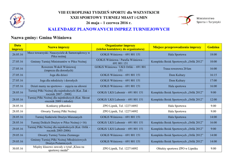 VIII EUROPEJSKI TYDZIEŃ SPORTU dla WSZYSTKICH XXII SPORTOWY TURNIEJ MIAST i GMIN 26 maja – 1 czerwca 2016 r. KALENDARZ PLANOWANYCH IMPREZ TURNIEJOWYCH Nazwa gminy: Gmina Wiśniowa Data imprezy Nazwa imprezy 26.05.16 Mecz towarzyski: Nauczyciele & Samorządowcy w Piłce nożnej 27.05.16 Gminny Turniej Ministrantów w Piłce Nożnej 27.05.16 Rowerem Wokół Wiśniowej (impreza dla dorosłych) GOKiS Wiśniowa / Parafia Wiśniowa – 691 801 151 GOKiS Wiśniowa / UKS Orliki – 691 801 151 27.05.16 Joga dla dzieci 27.05.16 27.05.16 28.05.16 28.05.16 Organizator imprezy Miejsce przeprowadzenia imprezy Godzina Hala Sportowa 18:00 Kompleks Boisk Sportowych „Orlik 2012” 10:00 Trasa rowerowa 20 km 16:00 GOKiS Wiśniowa – 691 801 151 Dom Kultury 16:15 Joga dla młodzieży i dorosłych GOKiS Wiśniowa – 691 801 151 Dom Kultury 17:00 Dzień mamy na sportowo - zajęcia na siłowni GOKiS Wiśniowa – 691 801 151 Hala sportowa 16:00 GOKiS/ LKS Lubomir – 691 801 151 Kompleks Boisk Sportowych „Orlik 2012” 9:00 GOKiS/ LKS Lubomir – 691 801 151 Kompleks Boisk Sportowych „Orlik 2012” 12:00 Turniej Piłki Nożnej dla najmłodszych (Kat. Żak rocznik 2007 - 2008) Turniej Piłki Nożnej dla najmłodszych (Kat. Skrzat -rocznik 2009 i młodsi) (telefon kontaktowy do organizatora) GOKiS Wiśniowa – 691 801 151 28.05.16 Konkursy piłkarskie ZPO Lipnik, Tel. 122714092 Hala Sportowa 9.00 28.05.16 Otwarty Turniej Piłki Nożnej ZPO Lipnik, Tel. 122714092 Hala Sportowa 9.00 28.05.16 Turniej Siatkówki Drużyn Mieszanych GOKiS Wiśniowa – 691 801 151 Hala Sportowa 14:00 28.05.16 Turniej Dzikich Drużyn w Piłce Nożnej (+16) GOKiS/ LKS Lubomir – 691 801 151 Kompleks Boisk Sportowych „Orlik 2012” 16:00 29.05.16 Turniej Piłki Nożnej dla najmłodszych (Kat. Orlik rocznik 2005-2006) GOKiS/ LKS Lubomir – 691 801 151 Kompleks Boisk Sportowych „Orlik 2012” 9:00 29.05.16 Otwarty Turniej Tenisa Ziemnego GOKiS Wiśniowa – 691 801 151 Kompleks Boisk Sportowych „Orlik 2012” 14:00 GOKiS Wiśniowa – 691 801 151 Kompleks Boisk Sportowych „Orlik 2012” 14:00 ZPO Lipnik, Tel. 122714092 Obiekty sportowe ZPO w Lipniku 9.00 29.05.16 30.05.16 Gminny Turniej Piłki Nożnej Młodzieżowych Drużyn Pożarniczych Między klasowe zawody o tytuł „Klasa na sportowy medal” 30.05.16 Turniej piłki nożnej drużyn mieszanych ZPO Lipnik, Tel. 122714092 Obiekty sportowe ZPO w Lipniku 11.00 30.05.16 Nauka tańca hip - hop ZPO Lipnik, Tel. 122714092 Obiekty sportowe ZPO w Lipniku 11.00 30.05.16 Marszowo – biegowy Test Coopera ZPO Lipnik, Tel.122714092 Obiekty sportowe ZPO w Lipniku 11.00 30.05.16 „Umiem pływać” – nauka i doskonalenie pływania ZPO Lipnik, Tel. 122714092 Basen Aguarius w Myślenicach 13.00 30.05.16 Między klasowe zawody o tytuł „Klasa na sportowy medal” ZPO Lipnik, Tel. 122714092 Obiekty sportowe ZPO w Lipniku 9.00 30.05.16 Turniej piłki nożnej drużyn mieszanych ZPO Lipnik, Tel. 122714092 Obiekty sportowe ZPO w Lipniku 11.00 GOKiS Wiśniowa – 691 801 151 Kompleks Boisk Sportowych „Orlik 2012” 10:00 GOKiS Wiśniowa – 691 801 151 Kompleks Boisk Sportowych „Orlik 2012” 10:00 30.05.16 30.05.16 Gminny Turniej Piłki Nożnej – Kat. Gimnazjum (chłopcy) Gminny Turniej Piłki Nożnej – Kat. Gimnazjum (dziewczęta) 30.05.16 Otwarty Turniej Tenisa Stołowego GOKiS Wiśniowa / UKS Orliki – 691 801 151 Hala Sportowa 14:30 30.05.16 Marszobieg terenowy na górę Ciecień dla uczniów SP i Gimnazjum UKS Orliki – 508 582 600 Trasa na Ciecień 14:30 30.05.16 Aerobik dla wszystkich GOKiS Wiśniowa - 691 801 151 Aerobik 19:00 31.05.16 Zawody o tytuł „Najlepszego Sportowca Szkoły” ZPO Lipnik, Tel. 122714092 Obiekty sportowe ZPO w Lipniku 9.00 31.05.16 Nauka tańca hip - hop ZPO Lipnik, Tel. 122714092 Obiekty sportowe ZPO w Lipniku 11.00 31.05.16 Szkolny Turniej Piłki Nożnej ZPO Lipnik, Tel. 122714092 Obiekty sportowe ZPO w Lipniku 11.00 31.05.16 Gala dawnych zabaw ruchowych „Zabawy ruchowe naszych ojców i dziadków” ZPO Lipnik, Tel. 122714092 Obiekty sportowe ZPO w Lipniku 11.00 31.05.16 Szkolny Turniej Badmintona ZPO Lipnik, Tel. 122714092 Obiekty sportowe ZPO w Lipniku 13.00 GOKiS Wiśniowa – 691 801 151 Kompleks Boisk Sportowych „Orlik 2012” 9:00 GOKiS Wiśniowa – 691 801 151 Kompleks Boisk Sportowych „Orlik 2012” 9:00 ZPO Wiśniowa - 508 582 600 Hala Sportowa 10:00 31.05.16 31.05.16 31.05.16 Gminny Turniej Piłki nożnej dla SP (kl.I-III) chłopcy Gminny Turniej Piłki nożnej dla SP (kl.I-III) dziewczęta Szkolny Turniej Tenisa stołowego -kat. SP i Gimnazjum 31.05.16 Turniej Badmintona ZPO Wiśniowa - 508 582 600 Kompleks Boisk Sportowych „Orlik 2012” 10:00 31.05.16 Gminny Turniej Piłki Nożnej – Kat. SP -kl. IV – VI (chłopcy) GOKiS Wiśniowa – 691 801 151 Kompleks Boisk Sportowych „Orlik 2012” 11:30 31.05.16 Gminny Turniej Piłki Nożnej – Kat. SP -kl. IV – VI GOKiS Wiśniowa – 691 801 151 Kompleks Boisk Sportowych „Orlik 2012” 11:30 (dziewczęta) 31.05.16 Test Coopera( bieg ciągły 12 min.) GOKiS Wiśniowa – 691 801 151 Kompleks Boisk Sportowych „Orlik 2012” 13:00 – 16:00 31.05.16 Międzygminny Turniej w Piłce Nożnej dla dziewcząt (kat. SP) GOKiS Wiśniowa – 691 801 151 Kompleks Boisk Sportowych „Orlik 2012” 14:00 31.05.16 Bieg na orientację UKS Orliki - 508 582 600 Trasa biegu 15:00 31.05.16 Zajęcia dla dzieci i młodzieży z karate GOKiS Wiśniowa – 691 801 151 Hala Sportowa 17:00 31.05.16 Dzień mamy na sportowo – Zumba GOKiS Wiśniowa – 691 801 151 Dom Kultury 19:00 01.06.16 „Mała Olimpiada” ZPO Lipnik, Tel. 122714092 Obiekty sportowe ZPO w Lipniku 10.00 01.06.16 „Siatkonoga” – mini turniej ZPO Lipnik, Tel. 122714092 Orlik w Wiśniowej 11.00 01.06.16 Marszowo – biegowy Test Coopera ZPO Lipnik, Tel. 122714092 Orlik w Wiśniowej 10.00 01.06.16 Konkursy piłkarskie dla dziewcząt UKS „Andrusy” w Lipniku, Tel. 122714092 Obiekty sportowe ZPO w Lipniku 13.00 01.06