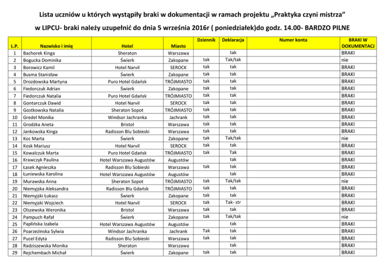 Lista uczniów u których wystąpiły braki w dokumentacji w ramach projektu „Praktyka czyni mistrza” w LIPCU- braki należy uzupełnić do dnia 5 września 2016r ( poniedziałek)do godz. 14.00- BARDZO PILNE Dziennik L.P. 1 2 3 4 5 6 7 8 9 10 11 12 13 14 15 16 17 18 19 20 21 22 23 24 25 26 27 28 29 Nazwisko i imię Bachorek Kinga Bogucka Dominika Borowicz Kamil Busma Stanisław Drozdowska Martyna Fiedorczuk Adrian Fiedorczuk Natalia Gontarczuk Dawid Gostkowska Natalia Gredel Monika Grodzka Aneta Jankowska Kinga Koc Marta Kosk Mariusz Kowalczuk Marta Krawczyk Paulina Łasek Agnieszka Łuniewska Karolina Murawska Anna Niemyjska Aleksandra Niemyjski Łukasz Niemyjski Wojciech Olszewska Weronika Pampuch Rafał Paplińska Izabela Poarzeżinska Sylwia Pucel Edyta Radziszewska Monika Rejchembach Michał Hotel Sheraton Świerk Hotel Narvil Świerk Puro Hotel Gdańsk Świerk Puro Hotel Gdańsk Hotel Narvil Sheraton Sopot Windsor Jachranka Bristol Radisson Blu Sobieski Świerk Hotel Narvil Puro Hotel Gdańsk Hotel Warszawa Augustów Radisson Blu Sobieski Hotel Warszawa Augustów Sheraton Sopot Radisson Blu Gdańsk Świerk Hotel Narvil Bristol Świerk Hotel Warszawa Augustów Windsor Jachranka Radisson Blu Sobieski Sheraton Świerk Miasto Warszawa Zakopane SEROCK Zakopane TRÓJMIASTO Zakopane TRÓJMIASTO SEROCK TRÓJMIASTO Jachrank Warszawa Warszawa Zakopane SEROCK TRÓJMIASTO Augustów Warszawa Augustów TRÓJMIASTO TRÓJMIASTO Zakopane SEROCK Warszawa Zakopane Augustów Jachrank Warszawa Warszawa Zakopane tak tak tak tak tak tak tak tak tak tak tak tak tak tak tak tak tak tak tak tak tak Tak tak tak Deklaracja tak Tak/tak tak tak tak tak tak tak tak tak tak tak Tak/tak tak Tak tak tak tak Tak/tak tak tak Tak- str tak Tak/tak tak tak tak tak tak Numer konta BRAKI W DOKUMENTACJ BRAKI nie BRAKI BRAKI BRAKI BRAKI BRAKI BRAKI BRAKI BRAKI BRAKI BRAKI nie BRAKI BRAKI BRAKI BRAKI BRAKI nie BRAKI BRAKI BRAKI BRAKI nie BRAKI BRAKI BRAKI BRAKI BRAKI 30 31 32 33 34 35 36 37 38 39 40 41 42 43 44 Sawicka Paulina Skłodowska Kinga Sołtruk Kamil Stefaniak Katarzyna Susoł Aleksandra Ślepowrońska Marzena Truszkowska Natalia Wilk Karolina Koc Wioleta Wojtkowski Tomasz Wróblewska Katarzyna Wyszyńska Justyna Zawadzka Maryla Zawistowska Wioleta Zieleniewski Szymon Radisson Blu Sobieski Hotel Warszawa Augustów Radisson Blu Gdańsk Radisson Blu Gdańsk Bristol Puro Hotel Gdańsk Sheraton Sheraton Bristol Świerk Świerk Sheraton Sopot Windsor Jachranka Świerk Radisson Blu Gdańsk Warszawa Augustów TRÓJMIASTO TRÓJMIASTO Warszawa TRÓJMIASTO Warszawa Warszawa Warszawa Zakopane Zakopane TRÓJMIASTO Jachrank Zakopane TRÓJMIASTO tak tak tak tak tak tak tak tak tak tak tak tak tak Tak tak tak tak tak tak tak tak Tak/tak tak tak tak tak tak BRAKI BRAKI BRAKI BRAKI BRAKI BRAKI BRAKI BRAKI BRAKI nie BRAKI BRAKI BRAKI BRAKI BRAKI Lista uczniów u których wystąpiły braki w dokumentacji w ramach projektu „Praktyka czyni mistrza” w SIERPNIU- braki należy uzupełnić do dnia 5 września 2016r ( poniedziałek)do godz. 14.00- BARDZO PILNE L.P. 1 2 3 4 5 6 9 7 Nazwisko i imię Antoniak Dominik Barszczewska Joanna Bogucka Daria Bogucka Ola Busma Kamila Choromańska Emilia Ciuchta Aleksandra Czapkowska Ewa Hotel Świerk Port 110 Iława Sheraton Sheraton Sheraton Sopot Sheraton Sopot Świerk Port 110 Iława Miasto Zakopane Iława Warszawa-int Warszawa TRÓJMIASTO TRÓJMIASTO Zakopane Iława Dziennik tak Deklaracja tak tak Tak tak tak Tak/tak Tak/tak Tak/tak tak Numer konta BRAKI BRAKI BRAKI BRAKI nie nie nie BRAKI BRAKI 8 10 11 12 13 14 15 16 17 18 25 19 20 21 22 23 24 26 27 28 29 30 31 32 33 34 Czarkowski Konrad Fiedorczuk Marta Gosk SebastianI Górecka Martyna Ilczuk Paulina Jastrzebski Brajan Jóźwiak Magdalena Kazimierczuk Natalia Kurowicki Michał Marcjanik Katarzyna Mirecki Przemysław Murawska Maria Obniska Anna Olszewski Patryk Plichta Kamil Plichta Marlena Polityło Weronika Półtorak Barbara Prokopiak Katarzyna Pruszyńska Katarzyna Radziszewski Bogdan Raźniak Sylwia II ZSZ Siemieniuk Dagmara Stańczuk Karolina Supryniuk Elwira Szawkało Diana 35 36 37 38 39 40 41 42 43 44 Sienicka Dominika Tokarski Michał Truchan Mateusz Tymińska Ewelina Ważyńska Natalia Wincenciak Magdalena Wodzielak Ewa Wójcik Adrian Wróbel Arkadiusz Zagubień Michał Hotel Narvil Świerk Radisson Blu Gdańsk Puro Hotel Gdańsk Port 110 Iława Świerk Hotel Narvil Windsor Jachranka Puro Hotel Gdańsk Radisson Blu Gdańsk Bristol Windsor Jachranka Port 110 Iława Hotel Narvil Świerk Puro Hotel Gdańsk Świerk Port 110 Iława Sheraton Radisson Blu Gdańsk Świerk Świerk Puro Hotel Gdańsk Hotel Narvil Hotel Narvil Radisson Blu Sobieski Sheraton Sopot (internat) Bristol Świerk Windsor Jachranka Sheraton Hotel Narvil Radisson Blu Sobieski Hotel Narvil Świerk Hotel Narvil Serock Zakopane TRÓJMIASTO TRÓJMIASTO Iława Zakopane Serock Jachranka TRÓJMIASTO TRÓJMIASTO Warszawa Jachranka Iława Serock Zakopane TRÓJMIASTO Zakopane Iława Warszawa TRÓJMIASTO Zakopane Zakopane TRÓJMIASTO Serock Serock Warszawa tak tak tak tak tak tak tak tak tak tak tak tak tak tak tak tak tak tak tak tak tak tak Tak/tak tak tak Tak/tak Tak/tak nie BRAKI BRAKI BRAKI BRAKI BRAKI BRAKI nie nie BRAKI Tak/tak Tak/tak tak tak Tak/tak nie nie BRAKI BRAKI BRAKI BRAKI BRAKI BRAKI BRAKI BRAKI BRAKI BRAKI nie BRAKI BRAKI Tak/tak nie BRAKI TRÓJMIASTO-inter Warszawa Zakopane Jachranka Warszawa Serock Warszawa Serock Zakopane Serock tak tak tak tak tak tak tak tak tak Tak/tak nie BRAKI Tak/tak nie BRAKI BRAKI Tak/tak nie BRAKI Tak /tak Tak /tak nie nie 45 46 Zakrzewski Hubert Zdrójkowska Wioletta Radisson Blu Gdańsk Port 110 Iława TRÓJMIASTO Iława tak BRAKI BRAKI