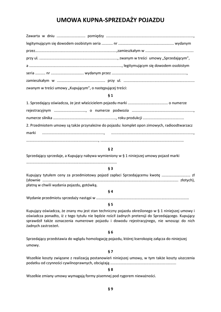UMOWA KUPNA-SPRZEDAŻY POJAZDU Zawarta w dniu ............................ pomiędzy ....................................................................................., legitymującym się dowodem osobistym seria ........... nr ...................................................... wydanym przez...............................................................................,zamieszkałym w ............................................... przy ul. ............................................................................, zwanym w treści umowy „Sprzedającym”, a .........................................................................................., legitymującym się dowodem osobistym seria .......... nr ................................ wydanym przez ........................................................................., zamieszkałym w ............................................... przy ul. ..................................................................... zwanym w treści umowy „Kupującym”, o następującej treści: §1 1. Sprzedający oświadcza, że jest właścicielem pojazdu marki ....................................... o numerze rejestracyjnym ..............................., o numerze podwozia ............................................................, numerze silnika ............................................................., roku produkcji ........................................ 2. Przedmiotem umowy są także przynależne do pojazdu: komplet opon zimowych, radioodtwarzacz marki ............................................................, ................................................................................, ......................................................................, ................................................................................. §2 Sprzedający sprzedaje, a Kupujący nabywa wymieniony w § 1 niniejszej umowy pojazd marki ........................................................................................ §3 Kupujący tytułem ceny za przedmiotowy pojazd zapłaci Sprzedającemu kwotę ............................ zł (słownie .................................................................................................................................... złotych), płatną w chwili wydania pojazdu, gotówką. §4 Wydanie przedmiotu sprzedaży nastąpi w .......................................................................................... §5 Kupujący oświadcza, że znany mu jest stan techniczny pojazdu określonego w § 1 niniejszej umowy i oświadcza ponadto, iż z tego tytułu nie będzie rościł żadnych pretensji do Sprzedającego. Kupujący sprawdził także oznaczenia numerowe pojazdu i dowodu rejestracyjnego, nie wnosząc do nich żadnych zastrzeżeń. §6 Sprzedający przedstawia do wglądu homologację pojazdu, której kserokopię załącza do niniejszej umowy. §7 Wszelkie koszty związane z realizacją postanowień niniejszej umowy, w tym także koszty uiszczenia podatku od czynności cywilnoprawnych, obciążają ................................................................ §8 Wszelkie zmiany umowy wymagają formy pisemnej pod rygorem nieważności. §9 W sprawach nieuregulowanych niniejszą umową stosuje się odpowiednie przepisy kodeksu cywilnego. § 10 Umowa sporządzona została w .............. jednobrzmiących egzemplarzach, po ............... dla każdej ze stron. § 11 Sprzedający wydaje Kupującemu z chwilą podpisania umowy: 1) 2 komplety kluczyków, 2) dowód rejestracyjny, 3) kartę pojazdu, 4) kserokopię homologacji, 5) książkę serwisową, 6) instrukcję obsługi pojazdu, 7) polisę OC ........................................................................................................................................ 8) ...................................................................................................................................................... 9) ...................................................................................................................................................... . ............................................. (Sprzedający) ............................................... (Kupujący) Umowa kupna-sprzedaży pojazdu Umowa sprzedaŜy regulowana jest art. 535 – art. 602 kodeksu cywilnego. Przez umowę sprzedaŜy sprzedawca zobowiązuje się przenieść na kupującego własność rzeczy i wydać mu rzecz, a kupujący zobowiązuje się rzecz odebrać i zapłacić sprzedawcy cenę. Cenę moŜna określić przez wskazanie podstaw do jej ustalenia. Dla umów zawieranych z konsumentami, zastosowanie znajdą regulacje zawarte w ustawie o szczególnych warunkach sprzedaŜy konsumenckiej oraz o zmianie kodeksu cywilnego. Przy tzw. obrocie nieprofesjonalnym, dla celów podatkowych podstawowe znaczenie ma ustawa o podatku od czynności cywilnoprawnych, natomiast dla obrotu profesjonalnego – ustawa o podatku od towarów i usług. W odniesieniu do sprzedaŜy pojazdu pamiętać naleŜy o podatkowych konsekwencjach związanych z zaliczaniem pojazdu do grupy samochodów osobowych, jak równieŜ pamiętać naleŜy o ograniczeniach związanych z rozciągniętym w czasie zaliczaniem kosztów zakupu pojazdu do kosztów uzyskania przychodu. Odrębnym zagadnieniem są obowiązki związane z wyrejestrowaniem/zarejestrowaniem i ubezpieczeniem pojazdu.