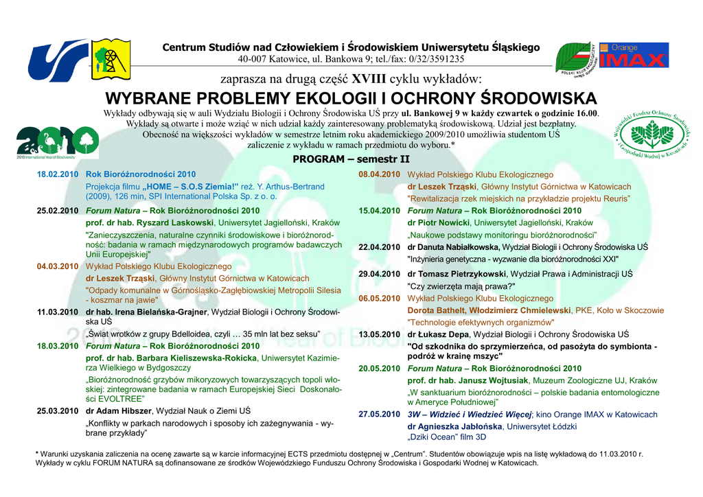 Centrum Studiów nad Człowiekiem i Środowiskiem Uniwersytetu Śląskiego 40-007 Katowice, ul. Bankowa 9; tel./fax: 0/32/3591235 zaprasza na drugą część XVIII cyklu wykładów: WYBRANE PROBLEMY EKOLOGII I OCHRONY ŚRODOWISKA Wykłady odbywają się w auli Wydziału Biologii i Ochrony Środowiska UŚ przy ul. Bankowej 9 w każdy czwartek o godzinie 16.00. Wykłady są otwarte i może wziąć w nich udział każdy zainteresowany problematyką środowiskową. Udział jest bezpłatny. Obecność na większości wykładów w semestrze letnim roku akademickiego 2009/2010 umożliwia studentom UŚ zaliczenie z wykładu w ramach przedmiotu do wyboru.* PROGRAM – semestr II 18.02.2010 Rok Bioróżnorodności 2010 Projekcja filmu „HOME – S.O.S Ziemia!” reż. Y. Arthus-Bertrand (2009), 126 min, SPI International Polska Sp. z o. o. 25.02.2010 Forum Natura – Rok Bioróżnorodności 2010 prof. dr hab. Ryszard Laskowski, Uniwersytet Jagielloński, Kraków "Zanieczyszczenia, naturalne czynniki środowiskowe i bioróżnorodność: badania w ramach międzynarodowych programów badawczych Unii Europejskiej" 04.03.2010 Wykład Polskiego Klubu Ekologicznego dr Leszek Trząski, Główny Instytut Górnictwa w Katowicach "Odpady komunalne w Górnośląsko-Zagłębiowskiej Metropolii Silesia - koszmar na jawie" 11.03.2010 dr hab. Irena Bielańska-Grajner, Wydział Biologii i Ochrony Środowiska UŚ „Świat wrotków z grupy Bdelloidea, czyli … 35 mln lat bez seksu” 18.03.2010 Forum Natura – Rok Bioróżnorodności 2010 prof. dr hab. Barbara Kieliszewska-Rokicka, Uniwersytet Kazimierza Wielkiego w Bydgoszczy „Bioróżnorodność grzybów mikoryzowych towarzyszących topoli włoskiej: zintegrowane badania w ramach Europejskiej Sieci Doskonałości EVOLTREE” 25.03.2010 dr Adam Hibszer, Wydział Nauk o Ziemi UŚ „Konflikty w parkach narodowych i sposoby ich zażegnywania - wybrane przykłady” 08.04.2010 Wykład Polskiego Klubu Ekologicznego dr Leszek Trząski, Główny Instytut Górnictwa w Katowicach "Rewitalizacja rzek miejskich na przykładzie projektu Reuris” 15.04.2010 Forum Natura – Rok Bioróżnorodności 2010 dr Piotr Nowicki, Uniwersytet Jagielloński, Kraków „Naukowe podstawy monitoringu bioróżnorodności” 22.04.2010 dr Danuta Nabiałkowska, Wydział Biologii i Ochrony Środowiska UŚ "Inżynieria genetyczna - wyzwanie dla bioróżnorodności XXI" 29.04.2010 dr Tomasz Pietrzykowski, Wydział Prawa i Administracji UŚ "Czy zwierzęta mają prawa?" 06.05.2010 Wykład Polskiego Klubu Ekologicznego Dorota Bathelt, Włodzimierz Chmielewski, PKE, Koło w Skoczowie "Technologie efektywnych organizmów" 13.05.2010 dr Łukasz Depa, Wydział Biologii i Ochrony Środowiska UŚ "Od szkodnika do sprzymierzeńca, od pasożyta do symbionta podróż w krainę mszyc" 20.05.2010 Forum Natura – Rok Bioróżnorodności 2010 prof. dr hab. Janusz Wojtusiak, Muzeum Zoologiczne UJ, Kraków „W sanktuarium bioróżnorodności – polskie badania entomologiczne w Ameryce Południowej” 27.05.2010 3W – Widzieć i Wiedzieć Więcej; kino Orange IMAX w Katowicach dr Agnieszka Jabłońska, Uniwersytet Łódzki „Dziki Ocean” film 3D * Warunki uzyskania zaliczenia na ocenę zawarte są w karcie informacyjnej ECTS przedmiotu dostępnej w „Centrum”. Studentów obowiązuje wpis na listę wykładową do 11.03.2010 r. Wykłady w cyklu FORUM NATURA są dofinansowane ze środków Wojewódzkiego Funduszu Ochrony Środowiska i Gospodarki Wodnej w Katowicach.
