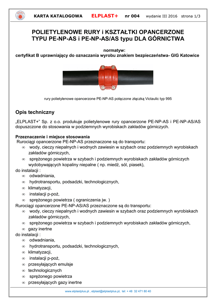 KARTA KATALOGOWA ELPLAST+ nr 004 wydanie III 2016 strona 1/3 POLIETYLENOWE RURY i KSZTAŁTKI OPANCERZONE TYPU PE-NP-AS i PE-NP-AS/AS typu DLA GÓRNICTWA normatyw: certyfikat B uprawniający do oznaczania wyrobu znakiem bezpieczeństwa- GIG Katowice rury polietylenowe opancerzone PE-NP-AS połączone złączką Victaulic typ 995 Opis techniczny „ELPLAST+” Sp. z o.o. produkuje polietylenowe rury opancerzone PE-NP-AS i PE-NP-AS/AS dopuszczone do stosowania w podziemnych wyrobiskach zakładów górniczych. Przeznaczenie i miejsce stosowania Rurociągi opancerzone PE-NP-AS przeznaczone są do transportu: • wody, cieczy niepalnych i wodnych zawiesin w szybach oraz podziemnych wyrobiskach zakładów górniczych, • sprężonego powietrza w szybach i podziemnych wyrobiskach zakładów górniczych wydobywających kopaliny niepalne ( np. miedź, sól, piasek), do instalacji : • odwadniania, • hydrotransportu, podsadzki, technologicznych, • klimatyzacji, • instalacji p-poż, • sprężonego powietrza ( ograniczenia jw. ) Rurociągi opancerzone PE-NP-AS/AS przeznaczone są do transportu: • wody, cieczy niepalnych i wodnych zawiesin w szybach oraz podziemnych wyrobiskach zakładów górniczych, • sprężonego powietrza w szybach i podziemnych wyrobiskach zakładów górniczych, • gazy inertne do instalacji : • odwadniania, • hydrotransportu, podsadzki, technologicznych, • klimatyzacji, • instalacji p-poż, • przesyłających emulsje • technologicznych • sprężonego powietrza • przesyłających gazy inertne www.elplastplus.pl , [email protected], tel: + 48 32 471 80 40 KARTA KATALOGOWA ELPLAST+ nr 004 wydanie III 2016 strona 2/3 Budowa i ogólne parametry techniczne Polietylenowa rura opancerzona PE-NP-AS składa się z : • wewnętrznej, rury przewodowej (ciśnieniowej), z warstwą antystatyczną na powierzchni zewnętrznej. Rura ta wykonana jest zgodnie z normą PN-EN 12201-2: +A1:2013-12 w zakresie badań i wymiarów • zewnętrznej rury („pancerza ochronnego”) z uniepalnionego ( trudnopalnego) i antystatycznego polietylenu, ciasno nałożonej na rurę przewodową. Polietylenowa rura opancerzona PE-NP-AS/AS składa się z : • wewnętrznej, rury przewodowej (ciśnieniowej), z warstwą antystatyczną na powierzchni zewnętrznej, wewnętrznej. Rura ta wykonana jest zgodnie z normą PN-EN 12201-2 +A1:2013-12 w zakresie badań i wymiarów • zewnętrznej rury („pancerza ochronnego”) z uniepalnionego ( trudnopalnego) i antystatycznego polietylenu, ciasno nałożonej na rurę przewodową. Polietylenowe rury opancerzone PE-NP-AS i PE-NP-AS/AS produkujemy w zakresie : • średnic rur przewodowych od ᶲ 90 do ᶲ 400 mm, • ciśnienia nominalnego PN 10, PN16, PN20 i PN25, • o standardowej długość L = 6 m Na indywidualne życzenie klienta możliwe jest wykonanie odcinków o innej długości jak również wykonanie kształtek segmentowych np. kolan, trójników jako uzupełnienie całej instalacji. Sposoby łączenia rur: • mechanicznie złączkami VICTAULIC typ 995 i typ 905. • połączenia kołnierzowe • przejścia stal/PE ( pasówka z rowkiem VICTAULIC lub do przyspawania ). • zgrzewanie doczołowe ( tylko w miejscach w których pozwalają na to odpowiednie przepisy. • poprzez obejmy z odejściem gwintowanym ( połączenie z armaturą np. z hydrantem ) . Zalety • wysoka trwałość rurociągu ( kilkakrotnie wyższa niż rur stalowych) – szczególnie widoczna w wyrobiskach o niekorzystnym mikroklimacie, • prosty montaż i serwisowanie rurociągu przy użyciu złączek Victaulic, • ok. 50 % wzrost wydajności pracy przy montażu i demontażu w stosunku do rur okołnierzowanych, • lżejsze od rurociągów stalowych, łatwiejszy transport, • wysoka odporność na ścieranie, • niski współczynnik bezwzględnej chropowatości wewnętrznej – o 20% obniżenie strat przepływu , • całkowity brak korozji, znacząco ograniczenie zjawiska zarastania wewnętrznego, • odporność na uderzenia i kruche pęknięcia, • wysoka elastyczność, możliwość korekty rurociągu bez konieczności stosowania kolan przy zachowaniu określonych promieni gięcia, • wysoka odporność na propagację pęknięć w wyniku uszkodzeń zewnętrznych, • bez zapachu-bezwonność ( nie emitują zapachu jak np. żywice) www.elplastplus.pl , [email protected], tel: + 48 32 471 80 40 KARTA KATALOGOWA ELPLAST+ nr 004 wydanie III 2016 strona 3/3 • możliwość : o cięcia na żądaną długość w miejscu montażu, o zabudowy hydrantu w dowolnym miejscu, o doraźnego zaciśnięcia rur zaciskiem śrubowym, o wielokrotnego użycia wszystkich elementów, o łączenia z innymi zabudowanymi rurociągami poprzez pasówki kołnierzowe lub pasówki zakończone rowkiem w systemie Victaulic. Załączniki • „DTR -instrukcja stosowania rur i kształtek opancerzonych PE-NP-AS w zakładach górniczych” nr EL-48 • karty techniczne -Łącznik do rur z HDPE typ S/995- 19.02 -źródło Victaulic • karty techniczne -Łącznik do rur z HDPE typ S/905- 19.07 -źródło Victaulic • „Instrukcja montażu złączek Victaulic typ 995 na rurach HDPE”, Nr EL 36 • „ Instrukcja montażu złączek typu 905"- IT-905 – źródło Victaulic, (wersja PL) • Certyfikat B + Aneks nr 1 uprawniające do oznaczania wyrobu znakiem bezpieczeństwa – rury i kształtki opancerzone PE-NP.-AS - GIG Katowice • Certyfikat B uprawniający do oznaczania wyrobu znakiem bezpieczeństwa – złączki Victaulic.- wydanie GIG Katowice • Certyfikat B uprawniający do oznaczania wyrobu znakiem bezpieczeństwa – Łączniki rurowe i zawory - wydanie KOMAG - Gliwice • deklaracje zgodności nr 30 – rury i kształtki opancerzone PE-NP-AS • deklaracje zgodności nr 26 – złączki żeliwne Victaulic www.elplastplus.pl , [email protected], tel: + 48 32 471 80 40