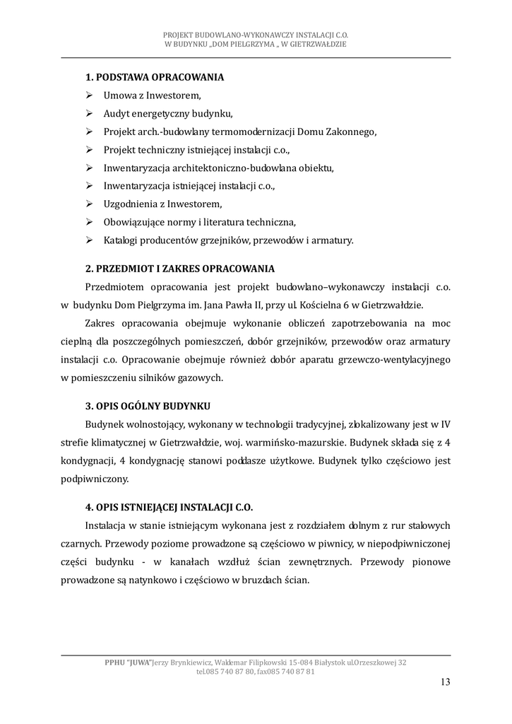 PROJEKT BUDOWLANO-WYKONAWCZY INSTALACJI C.O. W BUDYNKU „DOM PIELGRZYMA „ W GIETRZWAŁDZIE 1. PODSTAWA OPRACOWANIA Umowa z Inwestorem, Audyt energetyczny budynku, Projekt arch.-budowlany termomodernizacji Domu Zakonnego, Projekt techniczny istniejącej instalacji c.o., Inwentaryzacja architektoniczno-budowlana obiektu, Inwentaryzacja istniejącej instalacji c.o., Uzgodnienia z Inwestorem, Obowiązujące normy i literatura techniczna, Katalogi producentów grzejników, przewodów i armatury. 2. PRZEDMIOT I ZAKRES OPRACOWANIA Przedmiotem opracowania jest projekt budowlano–wykonawczy instalacji c.o. w budynku Dom Pielgrzyma im. Jana Pawła II, przy ul. Kościelna 6 w Gietrzwałdzie. Zakres opracowania obejmuje wykonanie obliczeń zapotrzebowania na moc cieplną dla poszczególnych pomieszczeń, dobór grzejników, przewodów oraz armatury instalacji c.o. Opracowanie obejmuje również dobór aparatu grzewczo-wentylacyjnego w pomieszczeniu silników gazowych. 3. OPIS OGÓLNY BUDYNKU Budynek wolnostojący, wykonany w technologii tradycyjnej, zlokalizowany jest w IV strefie klimatycznej w Gietrzwałdzie, woj. warmińsko-mazurskie. Budynek składa się z 4 kondygnacji, 4 kondygnację stanowi poddasze użytkowe. Budynek tylko częściowo jest podpiwniczony. 4. OPIS ISTNIEJĄCEJ INSTALACJI C.O. Instalacja w stanie istniejącym wykonana jest z rozdziałem dolnym z rur stalowych czarnych. Przewody poziome prowadzone są częściowo w piwnicy, w niepodpiwniczonej części budynku - w kanałach wzdłuż ścian zewnętrznych. Przewody pionowe prowadzone są natynkowo i częściowo w bruzdach ścian. PPHU “JUWA”Jerzy Brynkiewicz, Waldemar Filipkowski 15-084 Białystok ul.Orzeszkowej 32 tel.085 740 87 80, fax085 740 87 81 13 PROJEKT BUDOWLANO-WYKONAWCZY INSTALACJI C.O. W BUDYNKU „DOM PIELGRZYMA „ W GIETRZWAŁDZIE 5. ŹRÓDŁO CIEPŁA Źródłem ciepła dla istniejącej instalacji są dwa kotły gazowe, zlokalizowane w kotłowni w podpiwniczonej części budynku. Źródłem ciepła dla zaprojektowanej instalacji będą silniki gazowe współpracujące z istniejącymi kotłami. 6. OPIS PROJEKTOWANEJ INSTALACJI C.O. Zaprojektowano instalację centralnego ogrzewania pompową w układzie dwururowym z rozdziałem dolnym, w systemie zamkniętym. Instalację przewidziano zasilać wodą grzewczą o parametrach 80/60 °C. Obieg wody grzewczej wymuszany będzie pompą obiegową. Dobór pompy obejmuje projekt źródła ciepła. Instalacja będzie sterowana poprzez układ automatycznej regulacji umieszczony w kotłowni oraz sterownik pogodowy, zgodnie z projektem źródła ciepła. Obliczeniowe zapotrzebowanie na ciepło określono przy pomocy programu KAN OZC uwzględniając termomodernizację budynku zgodnie z Projektem architektonicznobudowlanym termomodernizacji. Obliczenia hydrauliczne projektowanej instalacji wykonano w programie KAN c.o. Obciążenie cieplne budynku: 115,59 kW Całkowite zapotrzebowanie na ciepło (łącznie z mocą grzewczą aparatu grzewczowentylacyjnego): 126,59 kW Parametry instalacji c.o. : 80/60 °C Wymagane ciśnienie dyspozycyjne dla instalacji c.o.: 3,72 m H2O Całkowita pojemność instalacji c.o.: 889 l 6.1. Przewody Instalację należy wykonać z rur stalowych w systemie KAN-therm STEEL, tj. z wysokiej jakości stali o niskiej zawartości węgla, pokrytej cienką warstwą cynku stanowiącą zabezpieczenie antykorozyjne zewnętrznych powierzchni rur i kształtek. Rury i złączki w systemie KAN-therm STEEL łączy się w technologii „press”. Zaprojektowane przewody poziome oraz piony prowadzone są większości po istniejących trasach instalacji c.o. Przewody poziome w części podpiwniczonej budynku PPHU “JUWA”Jerzy Brynkiewicz, Waldemar Filipkowski 15-084 Białystok ul.Orzeszkowej 32 tel.085 740 87 80, fax085 740 87 81 14 PROJEKT BUDOWLANO-WYKONAWCZY INSTALACJI C.O. W BUDYNKU „DOM PIELGRZYMA „ W GIETRZWAŁDZIE należy prowadzić pod stropem zgodnie z rys. nr 1, natomiast w części niepodpiwniczonej budynku przewody poziome należy prowadzić w istniejących kanałach wzdłuż ścian zewnętrznych. Przewiduje się odkrycie istniejących kanałów, oczyszczenie z zanieczyszczeń i poddanie ogólnej renowacji. W celu zapewnienia dostępu do zaworów podpionowych (montowanych w kanałach) w trakcie eksploatacji instalacji należy wykonać otwory rewizyjne bezpośrednio nad zaworami o wielkości zapewniającej swobodny dostęp do armatury. Klapy rewizyjne powinny być odpowiednio wytrzymałe ze względu na ich usytuowanie. Zwieńczenia otworów rewizyjnych należy wykonać w sposób komponujący z pozostałą częścią podłogi. Rozprowadzenie przewodów należy wykonać zgodnie z częścią graficzną projektu wykorzystując istniejące przebicia przez przegrody budowlane. W przypadku konieczności wykonania nowych przebić przewody przez przegrodę budowlaną należy prowadzić w tulejach ochronnych. W tulei ochronnej nie może znajdować się żadne połączenie rury. Tuleja ochronna powinna być rurą o średnicy wewnętrznej większej od średnicy zewnętrznej rury przewodu: co najmniej o 2 cm przy przejściu przez przegrodę pionową, co najmniej o 1 cm, przy przejściu przez strop. Tuleja ochronna powinna być dłuższa niż grubość przegrody pionowej o około 5 cm z każdej strony, a przy przejściu przez strop powinna wystawać około 2 cm powyżej posadzki. Nie dotyczy to tulei ochronnych na rurach przyłączy grzejnikowych (gałązek), których wylot ze ściany powinien być osłonięty tarczką ochronną. Przestrzeń między rurą przewodu a tuleją ochronną powinna być wypełniona materiałem trwale plastycznym niedziałającym korozyjnie na rurę, umożliwiającym jej wzdłużne przemieszczanie się i utrudniającym powstanie w niej naprężeń ścinających. Przewody poziome należy prowadzić ze spadkiem 5 ‰ w kierunku rozdzielaczy. Gałązki zasilające grzejnik należy prowadzić ze spadkiem 3% (min. 2%) od pionu do grzejnika, natomi