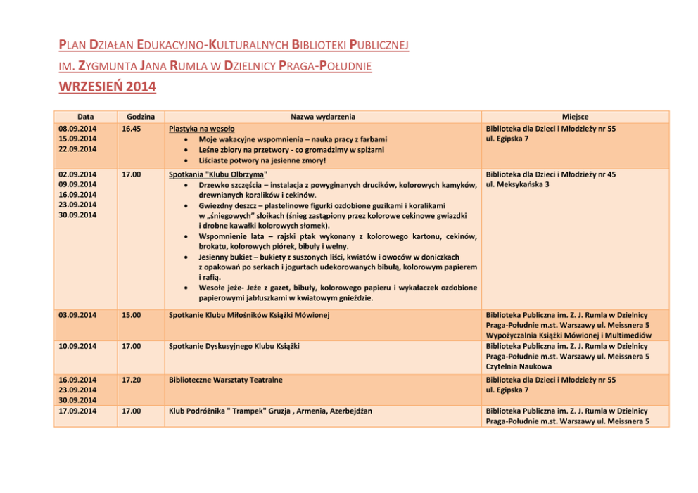 PLAN DZIAŁAN EDUKACYJNO-KULTURALNYCH BIBLIOTEKI PUBLICZNEJ IM. ZYGMUNTA JANA RUMLA W DZIELNICY PRAGA-POŁUDNIE WRZESIEŃ 2014 Data 08.09.2014 15.09.2014 22.09.2014 Godzina 16.45 Nazwa wydarzenia Plastyka na wesoło Moje wakacyjne wspomnienia – nauka pracy z farbami Leśne zbiory na przetwory - co gromadzimy w spiżarni Liściaste potwory na jesienne zmory! Miejsce Biblioteka dla Dzieci i Młodzieży nr 55 ul. Egipska 7 02.09.2014 09.09.2014 16.09.2014 23.09.2014 30.09.2014 17.00 Spotkania "Klubu Olbrzyma" Drzewko szczęścia – instalacja z powyginanych drucików, kolorowych kamyków, drewnianych koralików i cekinów. Gwiezdny deszcz – plastelinowe figurki ozdobione guzikami i koralikami w „śniegowych” słoikach (śnieg zastąpiony przez kolorowe cekinowe gwiazdki i drobne kawałki kolorowych słomek). Wspomnienie lata – rajski ptak wykonany z kolorowego kartonu, cekinów, brokatu, kolorowych piórek, bibuły i wełny. Jesienny bukiet – bukiety z suszonych liści, kwiatów i owoców w doniczkach z opakowań po serkach i jogurtach udekorowanych bibułą, kolorowym papierem i rafią. Wesołe jeże- Jeże z gazet, bibuły, kolorowego papieru i wykałaczek ozdobione papierowymi jabłuszkami w kwiatowym gnieździe. Biblioteka dla Dzieci i Młodzieży nr 45 ul. Meksykańska 3 03.09.2014 15.00 Spotkanie Klubu Miłośników Książki Mówionej 10.09.2014 17.00 Spotkanie Dyskusyjnego Klubu Książki Biblioteka Publiczna im. Z. J. Rumla w Dzielnicy Praga-Południe m.st. Warszawy ul. Meissnera 5 Wypożyczalnia Książki Mówionej i Multimediów Biblioteka Publiczna im. Z. J. Rumla w Dzielnicy Praga-Południe m.st. Warszawy ul. Meissnera 5 Czytelnia Naukowa 16.09.2014 23.09.2014 30.09.2014 17.09.2014 17.20 Biblioteczne Warsztaty Teatralne Biblioteka dla Dzieci i Młodzieży nr 55 ul. Egipska 7 17.00 Klub Podróżnika " Trampek" Gruzja , Armenia, Azerbejdżan Biblioteka Publiczna im. Z. J. Rumla w Dzielnicy Praga-Południe m.st. Warszawy ul. Meissnera 5 17.09.2014 24.09.2014 17.00 Klub Zająca - zabawy dla przedszkolaków Głoski śpiewające - czyli logopedyczne zabawy z literką R Głoski śpiewające - czyli logopedyczne zabawy z literką SZ, Ż, CZ, Biblioteka dla Dzieci i Młodzieży nr 55 ul. Egipska 7 18.09.2014 25.09.2014 17.00 Klub Gier Planszowych Eureka, Ja to wiem! - czyli jak obszerna jest moja wiedza! Kim, Ja Jestem - czyli odgadywanie Biblioteka dla Dzieci i Młodzieży nr 55 ul. Egipska 7 23.09.2014 17.00 Spotkanie ze współautorką książki „Marek. Marek Grechuta we wspomnieniach żony Danuty Grechuty” 23.09.2014 09.00 23.09.2014 17.00 Warsztaty dla przedszkolaków „Pani Jesień” na podstawie książki „Cztery pory baśni – Jasień” „Warszawa i symbole” - Spotkanie varsavianistyczne z cyklu „Warszawa też jest seniorką 2014” Biblioteka Publiczna im. Z. J. Rumla w Dzielnicy Praga-Południe m.st. Warszawy ul. Meissnera 5 Czytelnia Naukowa ul. Meissnera 5 Wypożyczalnia dla Dorosłych i Młodzieży nr 44 ul. Grochowska 333 a Wypożyczalnia dla Dorosłych i Młodzieży nr 40 ul. Paca 46 25.09.2014 17.00 Dzień z książką i kulturą Ukrainy Biblioteka Publiczna im. Z. J. Rumla w Dzielnicy Praga-Południe m.st. Warszawy ul. Meissnera 5 26.09.2014 17.30 Spotkanie autorskie z Markiem Łuszczyną, autorem książki „Igły. Polskie agentki, które zmieniły historię" Wypożyczalnia dla Dorosłych i Młodzieży nr 3 Al. Waszyngtona 2b 26.09.2014 10.00 Europejski Dzień Języków 30.09.2014 17.00 09.09.2014 10.09.2014 11.09.2014 12.09.2014 16.09.2014 17.09.2014 18.09.2014 19.09.2014 23.09.2014 24.09.2014 25.09.2014 26.09.2014 30.09.2014 10.30 Teatrzyk Biblioteczny – „Pożegnanie WAKACJI! – o Żaczku Szkolaczku i o Sowizdrzale co jeden kochał szkołę, a ten drugi wcale.” Spotkania z Historią „Wrześnie II Wojny Światowej” Warsztaty biblioteczne „Czy wojna jest dla dzieci” na podstawie książek Beręsewicza, Papuzińskiej i Rusinka. Biblioteka Publiczna im. Z. J. Rumla w Dzielnicy Praga-Południe m.st. Warszawy ul. Meissnera 5 Wypożyczalnia Zbiorów Obcojęzycznych Biblioteka dla Dzieci i Młodzieży nr 55 ul. Egipska 7 Biblioteka dla Dzieci i Młodzieży nr 55 ul. Egipska 7