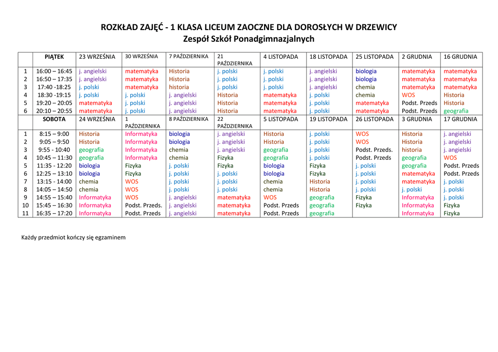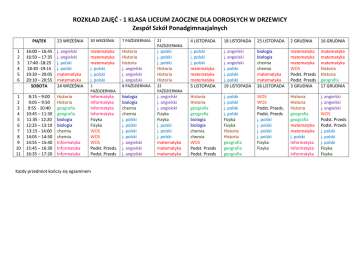 ROZKŁAD ZAJĘĆ - 1 KLASA LICEUM ZAOCZNE DLA DOROSŁYCH W DRZEWICY Zespół Szkół Ponadgimnazjalnych 1 2 3 4 5 6 1 2 3 4 5 6 7 8 9 10 11 PIĄTEK 23 WRZEŚNIA 30 WRZEŚNIA 7 PAŹDZIERNIKA 21 PAŹDZIERNIKA 4 LISTOPADA 18 LISTOPADA 25 LISTOPADA 2 GRUDNIA 16 GRUDNIA 16:00 – 16:45 16:50 – 17:35 17:40 -18:25 18:30 -19:15 19:20 – 20:05 20:10 – 20:55 SOBOTA j. angielski j. angielski j. polski j. polski matematyka matematyka 24 WRZEŚNIA matematyka matematyka matematyka j. polski j. polski j. polski Historia Historia historia j. angielski j. angielski j. angielski j. polski j. polski j. polski Historia Historia Historia 1 PAŹDZIERNIKA 8 PAŹDZIERNIKA 22 PAŹDZIERNIKA j. polski j. polski j. polski matematyka matematyka matematyka 5 LISTOPADA j. angielski j. angielski j. angielski j. polski j. polski j. polski 19 LISTOPADA biologia biologia chemia chemia matematyka matematyka 26 LISTOPADA matematyka matematyka matematyka WOS Podst. Przeds Podst. Przeds 3 GRUDNIA matematyka matematyka matematyka Historia Historia geografia 17 GRUDNIA 8:15 – 9:00 9:05 – 9:50 9:55 - 10:40 10:45 – 11:30 11:35 - 12:20 12:25 – 13:10 13:15 - 14:00 14:05 – 14:50 14:55 – 15:40 15:45 – 16:30 16:35 – 17:20 Historia Historia geografia geografia biologia biologia chemia chemia Informatyka Informatyka Informatyka Informatyka Informatyka Informatyka Informatyka Fizyka Fizyka WOS WOS WOS Podst. Przeds. Podst. Przeds biologia biologia chemia chemia j. polski j. polski j. polski j. polski j. angielski j. angielski j. angielski j. angielski j. angielski j. angielski Fizyka Fizyka j. polski j. polski j. polski matematyka matematyka matematyka Historia Historia geografia geografia biologia biologia chemia chemia WOS Podst. Przeds Podst. Przeds j. polski j. polski j. polski j. polski Fizyka Fizyka Historia Historia geografia geografia geografia WOS WOS Podst. Przeds. Podst. Przeds j. polski j. polski j. polski j. polski Fizyka Fizyka Historia Historia historia geografia geografia matematyka matematyka j. polski Informatyka Informatyka Informatyka j. angielski j. angielski j. angielski WOS Podst. Przeds Podst. Przeds j. polski j. polski j. polski Fizyka Fizyka Każdy przedmiot kooczy się egzaminem