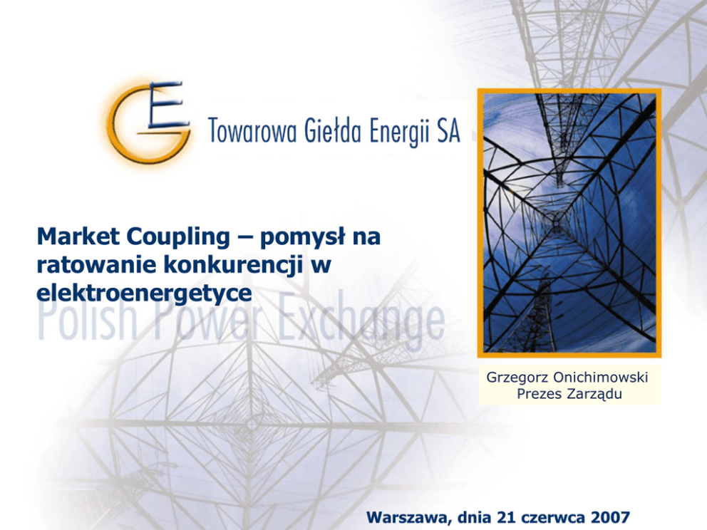 Market Coupling – pomysł na ratowanie konkurencji w elektroenergetyce Grzegorz Onichimowski Prezes Zarządu www.polpx.pl [email protected] Warszawa, dnia 21 czerwca 2007 Towarowa Giełda Energii S.A. Polish Power Exchange Model rynku energii elektrycznej w Polsce Rynek Dnia Następnego Rynek z dostawą fizyczną •GE: standardowe kontrakty •OTC: standardowe i niestandardowe kontrakty Rynek instrumentów rozliczanych finansowo •GE: standardowe kontrakty Lata, miesiące, tygodnie, dni przed terminem dostawy Rynek Dnia Bieżącego • Giełda Energii • Giełda • Kontrakty dwustronne OTC • Kontrakty dwustronne OTC Dzień n-1 Mechanizm Bilansujący Energii • OSP Termin dostawy energii Aktualny model rynku energii elektrycznej w Polsce jest zgodny ze standardami UE !!! czas 2 Towarowa Giełda Energii S.A. Polish Power Exchange Jaki obraz po konsolidacji i po 1 lipca 2007 Siła rynkowa dwóch dominujących wystarczająca do stanowienia lokalnych cen grup W mechanizmie aukcji transgranicznych jedynym beneficjentem różnic cenowych właściciel połączeń – stąd rywalizacja o połączenia. Płynność giełdy i rynku zagrożona nawet przy aktywnej postawie PGE. Nie uczestniczymy w europejskiej konkurencji 3 Towarowa Giełda Energii S.A. Polish Power Exchange Uruchomienia rynku regionalnego – niezbędne warunki brzegowe Połączenia transgraniczne dostępne na niedyskryminacyjnych zasadach dla wszystkich uczestników rynku – czyli we władaniu niezależnego operatora systemu przesyłowego Te same reżimy czasowe, produkty rynkowe i podobne zasady bilansowania w całym regionie. Najwyższy priorytet dla działań prokonkurencyjnych – wiara w pozytywne długofalowe działanie rynku w perspektywie wzrostu cen w Polsce w wyniku wzrostu inwestycji w sektor. 4 Towarowa Giełda Energii S.A. Polish Power Exchange Co powinno się stać wokół polskiej Giełdy? Giełda jako niezależna instytucja kapitałowo z OSP spółka publiczna Technologia nakładów nie jest problemem, powiązana ale wymaga Konieczne wzmocnienie płynności TGE - jeden kraj, jedna giełda energii! Rynek finansowy – sami czy z GPW/KDPW? Najmniejszym problemem porozumienie między giełdami regionu, chociaż i tu są kwestie do ustalenia, m.in. dotyczące walut i rozliczeń. 5
