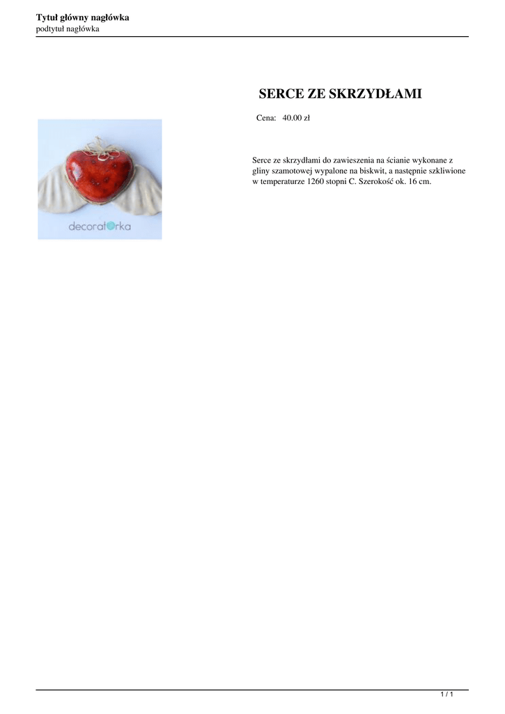 Tytuł główny nagłówka podtytuł nagłówka SERCE ZE SKRZYDŁAMI Cena: 40.00 zł Serce ze skrzydłami do zawieszenia na ścianie wykonane z gliny szamotowej wypalone na biskwit, a następnie szkliwione w temperaturze 1260 stopni C. Szerokość ok. 16 cm. 1/1 Powered by TCPDF (www.tcpdf.org)