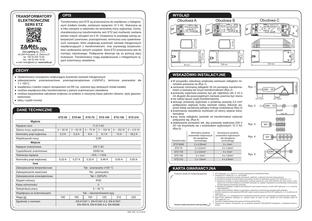 DANE Techniczne ETZ-50 ETZ-60 ETZ-70 ETZ-105 ETZ-150 ETZ-210 Wyjście Napięcie Uout 11,5 V AC Zakres mocy wyjściowej Nominalny prąd wyjściowy 0 ÷ 50 W 0 ÷ 60 W 0 ÷ 70 W 0 ÷ 105 W 0 ÷ 150 W 0 ÷ 210 W 4,3 A 5,2 A 6A 9,1 A 13 A 18,2 A ETZ 50/60 2 x 0,25mm2 2 x 1mm2 50/60 Hz ETZ 70 2 x 0,4mm2 2 x 1,5mm2 ETZ 105 2 x 0,5mm2 4 x 1mm2 -15% ÷ +10% ETZ 150 2 x 1mm2 4 x 1,5mm2 ETZ 210 2 x 1,5mm2 4 x 2,5mm2 Wejście 230 V AC Częstotliwość znamionowa 0,22 A 0,27 A 0,32 A 0,46 A 0,65 A 0,93 A 38,5 mm 52,5 mm 44 mm Transformator 0,99 Napięcie znamionowe Nominalny prąd wejściowy ●W przypadku zabudowy wnękowej zachować odległości minimalne pokazane na (Rys.1) ●zachować minimalną odległość 30 cm pomiędzy transformatorem a żarówką lub innym transformatorem (Rys.2) ●przewody wyjściowe powinny być jak najkrótsze (do 2 m) a ich długość dla poszczególnych żarówek powinna być równa ●nie należy łączyć wyjść transformatorów ●stosując przewody wyjściowe o przekroju powyżej 2,5 mm2 podłączenia większej liczby żarówek należy dokonać poprzez listwę zaciskową pełniący funkcję rozdzielacza (Rys.3) ●ściemniacze oświetlenia montować od strony wejścia transformatora ●przy dużej odległości żarówek od transformatora wykonać połączenie wg. (Rys.4) ●okablowanie prowadzić tak, aby przewody wejściowe 230 V AC nie krzyżowały się z przewodami wyjściowymi 12 V AC (Rys.5) Minimalny przekrój przewodów wejściowych dla obciążenia nominalnego Współczynnik mocy Tolerancja napięcia wskazówki instalacyjne Sumaryczny przekrój przewodów wyjściowych dla obciążenia nominalnego min 5cm ● Opatentowane rozwiązania zwiększające żywotność żarówek halogenowych ● zabezpieczenia: przeciwzwarciowe, przeciwprzeciążeniowe (>200%Pn), termiczne powracalne dla T > 100°C ● współpraca z bardzo małymi obciążeniami od 0W (np. wybrane typy diodowych źródeł światła) ● możliwa współpraca kilku transformatorów z jednym ściemniaczem oświetlenia ● możliwa bezpośrednia zabudowa wnękowa na podłożu o nieznanej klasie palności (drewno, płyty gipsowokartonowe) ● łatwy i szybki montaż 167 mm 108 mm 95 mm CECHY Obudowa C Obudowa B 33 mm Transformatory serii ETZ są przeznaczone do współpracy z halogenowymi źródłami światła, zasilanymi napięciem 12 V AC. Wykonane są w kilku wersjach w zależności od nominalnej mocy wyjściowej. Cechą charakterystyczną transformatorów serii ETZ jest możliwość zasilania bardzo małych obciążeń od 0 W. Urządzenia te posiadają szereg zabezpieczeń (zwarciowe, przeciążeniowe, termiczne) oraz opatentowanych rozwiązań, które zwiększają żywotność żarówek halogenowych współpracujących z transformatorami, oraz poprawiają bezpieczeństwo użytkowania samych urządzeń. Seria ETZ przeznaczona jest do montażu natynkowego. Podłączenia dokonuje się za pomocą złącz śrubowych. Transformatory mogą współpracować z inteligentnymi typami ściemniaczy oświetlenia. Wygląd Obudowa A 41,5 mm Cet Lighting Sp. z o.o. 43-200 Pszczyna, ul. Zielona 27 tel: +48 32 449 15 00 fax: +48 32 449 15 02 e-mail: [email protected], www.ledix.pl OPIS 27,5 mm TRANSFORMATORY ELEKTRONICZNE SERII ETZ Rys. 1 min 10cm min 30cm Rys. 2 min 30cm max 2m Rys. 3 Rys. 4 Rys. 5 Inne Zabezpieczenia temperaturowe Tak - powracalne Zabezpieczenie przeciążeniowe IP20 Klasa ochronności II Temperatura pracy 0 ÷ 40 °C Współpraca ze ściemniaczami Zgodność z normami Producent udziela 24 miesięcznej gwarancji Tak > 200%Pn Stopień ochrony Waga [g] karta gwarancyjna Tak - powracalne ≥100 °C Zabezpieczenie zwarciowe Tak – rekomendowane typy 100 100 100 125 212 225 EN 61347-1, EN 61347-2-2, EN 61547, EN 55015, EN 61000-3-2, EN 60598 Pieczęć i podpis sprzedawcy, data sprzedaży VER. 007_12.11.2012 1. CET Lighting Sp. z o.o. udziela 24- miesięcznej gwarancji na sprzedawane towary. 2. Gwarancją CET Lighting Sp. z o.o. nie są objęte: a) mechaniczne uszkodzenia powstałe w transporcie, załadunku / rozładunku lub innych okolicznościach, b) uszkodzenia powstałe na skutek wadliwie wykonanego montażu lub eksploatacji wyrobów CET Lighting Sp. z o.o., c) uszkodzenia powstałe na skutek jakichkolwiek przeróbek dokonanych przez KUPUJĄCEGO lub osoby trzecie a odnoszących się do wyrobów będących przedmiotem sprzedaży lub urządzeń niezbędnych do prawidłowego funkcjonowania wyrobów będących przedmiotem sprzedaży, d) uszkodzenia wynikające z działania siły wyższej lub innych zdarzeń losowych, za które CET Lighting Sp. z o.o. nie ponosi odpowiedzialności. e) źródła zasilania (baterie), będące na wyposażeniu urządzenia w momencie jego sprzedaży (jeśli występują). 3. Wszelkie roszczenia z tytułu gwarancji KUPUJĄCY zgłosi w punkcie zakupu lub firmie CET Lighting Sp. z o.o. na piśmie po ich stwierdzeniu. 4. CET Lighting Sp. z o.o. zobowiązuje się do rozpatrywania reklamacji zgodnie z obowiązującymi przepisami prawa polskiego. 5. Wybór formy załatwienia reklamacji, np. wymiana towaru na wolny od wad, naprawa lub zwrot pieniędzy należy do CET Lighting Sp. z o.o. 6. Terytorialny zasięg obowiązywania gwarancji: Rzeczpospolita Polska. 7. Gwarancja nie wyłącza, nie ogranicza, ani nie zawiesza uprawnień KUPUJĄCEGO wynikających z niezgodności towaru z umową.