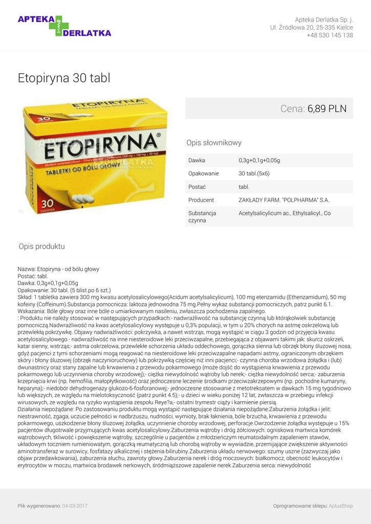 Apteka Derlatka Sp. j. Ul. Źródłowa 20, 25-335 Kielce +48 530 145 138 Etopiryna 30 tabl Cena: 6,89 PLN Opis słownikowy Dawka 0,3g+0,1g+0,05g Opakowanie 30 tabl.(5x6) Postać tabl. Producent ZAKŁADY FARM. "POLPHARMA" S.A. Substancja czynna Acetylsalicylicum ac., Ethylsalicyl., Co Opis produktu Nazwa: Etopiryna - od bólu głowy Postać: tabl. Dawka: 0,3g+0,1g+0,05g Opakowanie: 30 tabl. (5 blist.po 6 szt.) Skład: 1 tabletka zawiera 300 mg kwasu acetylosalicylowego(Acidum acetylsalicylicum), 100 mg etenzamidu (Ethenzamidum), 50 mg kofeiny (Coffeinum).Substancja pomocnicza: laktoza jednowodna 75 mg.Pełny wykaz substancji pomocniczych, patrz punkt 6.1. Wskazania: Bóle głowy oraz inne bóle o umiarkowanym nasileniu, zwłaszcza pochodzenia zapalnego. : Produktu nie należy stosować w następujących przypadkach:- nadwrażliwość na substancję czynną lub którąkolwiek substancję pomocniczą.Nadwrażliwość na kwas acetylosalicylowy występuje u 0,3% populacji, w tym u 20% chorych na astmę oskrzelową lub przewlekłą pokrzywkę. Objawy nadwrażliwości: pokrzywka, a nawet wstrząs, mogą wystąpić w ciągu 3 godzin od przyjęcia kwasu acetylosalicylowego.- nadwrażliwość na inne niesteroidowe leki przeciwzapalne, przebiegająca z objawami takimi jak: skurcz oskrzeli, katar sienny, wstrząs;- astma oskrzelowa, przewlekłe schorzenia układu oddechowego, gorączka sienna lub obrzęk błony śluzowej nosa, gdyż pacjenci z tymi schorzeniami mogą reagować na niesteroidowe leki przeciwzapalne napadami astmy, ograniczonym obrzękiem skóry i błony śluzowej (obrzęk naczynioruchowy) lub pokrzywką częściej niż inni pacjenci;- czynna choroba wrzodowa żołądka i (lub) dwunastnicy oraz stany zapalne lub krwawienia z przewodu pokarmowego (może dojść do wystąpienia krwawienia z przewodu pokarmowego lub uczynnienia choroby wrzodowej);- ciężka niewydolność wątroby lub nerek;- ciężka niewydolność serca;- zaburzenia krzepnięcia krwi (np. hemofilia, małopłytkowość) oraz jednoczesne leczenie środkami przeciwzakrzepowymi (np. pochodne kumaryny, heparyna);- niedobór dehydrogenazy glukozo-6-fosforanowej;- jednoczesne stosowanie z metotreksatem w dawkach 15 mg tygodniowo lub większych, ze względu na mielotoksyczność (patrz punkt 4.5);- u dzieci w wieku poniżej 12 lat, zwłaszcza w przebiegu infekcji wirusowych, ze względu na ryzyko wystąpienia zespołu Reye?a;- ostatni trymestr ciąży i karmienie piersią. Działania niepożądane: Po zastosowaniu produktu mogą wystąpić następujące działania niepożądane:Zaburzenia żołądka i jelit: niestrawność, zgaga, uczucie pełności w nadbrzuszu, nudności, wymioty, brak łaknienia, bóle brzucha, krwawienia z przewodu pokarmowego, uszkodzenie błony śluzowej żołądka, uczynnienie choroby wrzodowej, perforacje.Owrzodzenie żołądka występuje u 15% pacjentów długotrwale przyjmujących kwas acetylosalicylowy.Zaburzenia wątroby i dróg żółciowych: ogniskowa martwica komórek wątrobowych, tkliwość i powiększenie wątroby, szczególnie u pacjentów z młodzieńczym reumatoidalnym zapaleniem stawów, układowym toczniem rumieniowatym, gorączką reumatyczną lub chorobą wątroby w wywiadzie, przemijające zwiększenie aktywności aminotransferaz w surowicy, fosfatazy alkalicznej i stężenia bilirubiny.Zaburzenia układu nerwowego: szumy uszne (zazwyczaj jako objaw przedawkowania), zaburzenia słuchu, zawroty głowy.Zaburzenia nerek i dróg moczowych: białkomocz, obecność leukocytów i erytrocytów w moczu, martwica brodawek nerkowych, śródmiąższowe zapalenie nerek.Zaburzenia serca: niewydolność Plik wygenerowano: 04-03-2017 Oprogramowanie sklepu: AptusShop Apteka Derlatka Sp. j. Ul. Źródłowa 20, 25-335 Kielce +48 530 145 138 serca.Zaburzenia naczyniowe: nadciśnienie.Zaburzenia krwi i układu chłonnego: małopłytkowość, niedokrwistość wskutek mikrokrwawień z przewodu pokarmowego, niedokrwistość hemolityczna u pacjentów z niedoborem dehydrogenazy glukozo-6-fosforanowej, leukopenia, agranulocytoza, eozynopenia, zwiększone ryzyko krwawień, wydłużenie czasu krwawienia, wydłużenie czasu protrombinowego.Zaburzenia układu immunologicznego:Reakcje nadwrażliwości: wysypka, pokrzywka, obrzęk naczynioruchowy, skurcz oskrzeli, wstrząs. Interakcje: Inhibitory konwertazy angiotensyny (ACE): produkt może zmniejszać działanie przeciwnadciśnieniowe inhibitorów konwertazy angiotensyny.Acetazolamid: kwas acetylosalicylowy może w znacznym stopniu zwiększać stężenie, a tym samym toksyczność acetazolamidu.Leki przeciwzakrzepowe (np. heparyna, warfaryna): Jednoczesne stosowanie z lekami przeciwzakrzepowymi może spowodować nasilenie działania przeciwzakrzepowego.Kwas acetylosalicylowy może wypierać warfarynę z połączeń białkowych, prowadząc do wydłużenia czasu protrombinowego i czasu krwawienia.Produkt może nasilać działanie przeciwzakrzepowe heparyny, zwiększając tym samym ryzyko krwawienia.Leki przeciwpadaczkowe: Kwas acetylosalicylowy nasila działanie toksyczne kwasu walproinowego, zaś kwas walproinowy nasila działanie antyagregacyjne kwasu acetylosalicylowego.Leki moczopędne: produkt może zmniejszyć skuteczność leków moczopędnych oraz nasilać ototoksyczność furosemidu.Metotreksat: Kwas acetylosalicylowy nasila toksyczne działanie metotreksatu na szpik kostny. Stosowanie produktu jednocześnie z metotreksatem w dawkach 15 mg na tydzień lub większych jest przeciwwskazane.Niesteroidowe leki przeciwzapalne: Jednoczesne stosowanie salicylanów i innych niesteroidowych leków przeciwzapalnych nie jest zalecane, ze względu na zwiększone ryzyko występowania działań niepożądanych ze strony przewodu pokarmowego.Glikokortykosteroidy stosowane układowo: z wyjątkiem hydrokortyzonu jako terapii zastępczej w chorobie Addisona, podawane jednocześnie z salicylanami zwiększają ryzyko wystąpienia choroby wrzodowej i krwawienia z przewodu pokarmowe