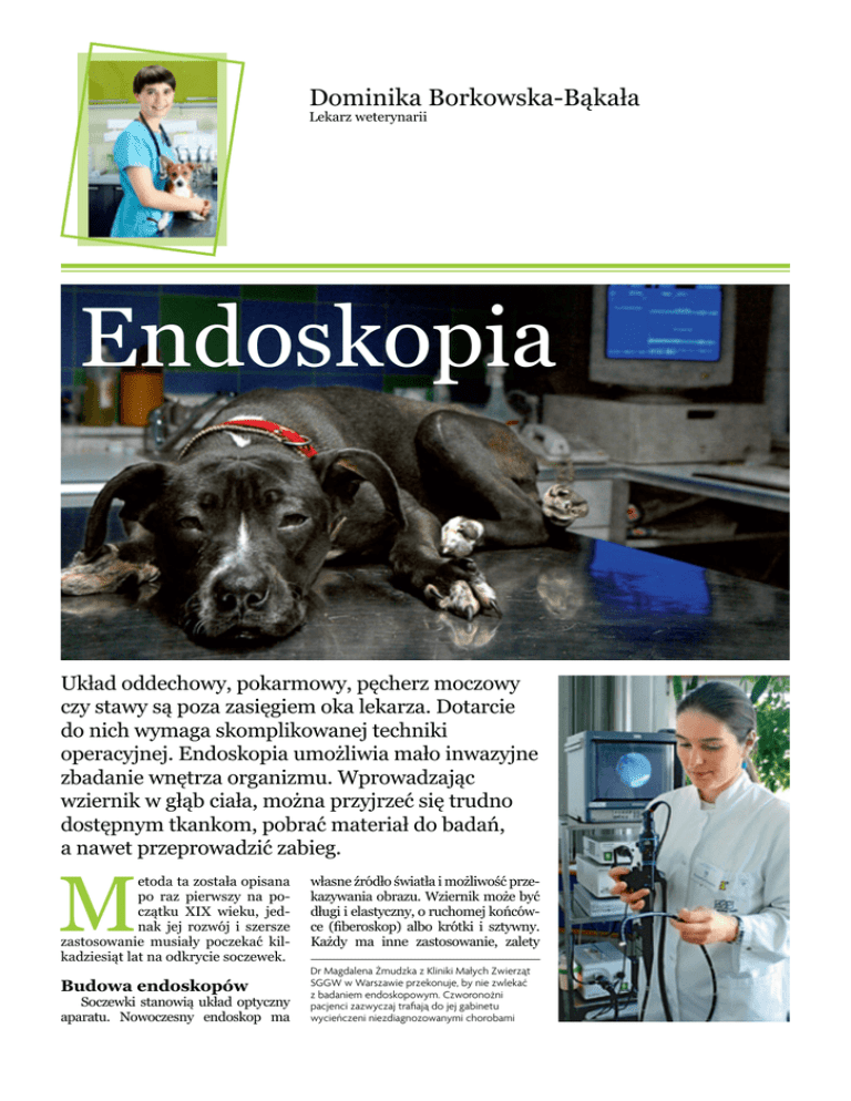 Dominika Borkowska-Bąkała Lekarz weterynarii Endoskopia Układ oddechowy, pokarmowy, pęcherz moczowy czy stawy są poza zasięgiem oka lekarza. Dotarcie do nich wymaga skomplikowanej techniki operacyjnej. Endoskopia umożliwia mało inwazyjne zbadanie wnętrza organizmu. Wprowadzając wziernik w głąb ciała, można przyjrzeć się trudno dostępnym tkankom, pobrać materiał do badań, a nawet przeprowadzić zabieg. M etoda ta została opisana po raz pierwszy na początku XIX wieku, jednak jej rozwój i szersze zastosowanie musiały poczekać kilkadziesiąt lat na odkrycie soczewek. Budowa endoskopów Soczewki stanowią układ optyczny aparatu. Nowoczesny endoskop ma własne źródło światła i możliwość przekazywania obrazu. Wziernik może być długi i elastyczny, o ruchomej końcówce (fiberoskop) albo krótki i sztywny. Każdy ma inne zastosowanie, zalety Dr Magdalena Żmudzka z Kliniki Małych Zwierząt SGGW w Warszawie przekonuje, by nie zwlekać z badaniem endoskopowym. Czworonożni pacjenci zazwyczaj trafiają do jej gabinetu wycieńczeni niezdiagnozowanymi chorobami Giętki fiberoskop wyposażony jest w dwa kanały robocze i wady. Giętki fiberoskop służy do penetracji dolnych partii dróg oddechowych (poniżej gardła), a także przełyku, żołądka, dwunastnicy i części jelita grubego. Ten rodzaj sondy jest dodatkowo wyposażony w dwa kanały robocze. Jeden z nich wykorzystuje się jako tunel dla manipulatorów, którymi pobiera się fragmenty błony śluzowej do dalszych badań lub których używa się do usuwania ciał obcych. Drugim kanałem wprowadza się wodę – potrzebną do przepłukiwania okularu, lub powietrze – niezbędne do wypełnienia żołądka w celu uwidocznienia jego zawartości i budowy błony śluzowej. Endoskopy tego typu mają zwykle 100–110 cm długości i średnicę sondy 7,5–10 mm, kolonoskopy (do diagnostyki jelita grubego) są nieco dłuższe (170 cm) i o szerszej średnicy (13 mm). Pozwala to na swobodne badanie psów średniej i dużej wielkości, ale mają mniejsze zastosowanie (zwłaszcza w badaniu dróg oddechowych) u psów małych i miniaturowych. Czasem niewielkie rozmiary zwierzęcia uniemożliwiają wykonanie pełnego badania. Podstawowym ograniczeniem endoskopów sztywnych jest brak kanałów roboczych. Niemniej znakomicie sprawdzają się w badaniu jam nosowych oraz diagnozowaniu zmian deformacyjnych gardła, krtani i tchawicy. Mają one długość 10–30 cm i średnicę do 5–6 mm. Z powodzeniem wykorzystywane są też do badania wnętrza jamy brzusznej po wprowadzeniu do niej laparoskopu przez niewielkie nacięcie skory i mięśni oraz do badania pęcherza moczowego, pochwy czy chrząstek stawowych. Realia polskie Początki technik endoskopowych w polskiej medycynie weterynaryjnej przypadają na koniec lat 80. Teraz każdy wydział weterynarii ma własną pracownię endoskopową, a i poza ośrodkami akademickimi (w niektórych lecznicach prywatnych) istnieje możliwość wykonania tego typu badań. Podobnie jak inne techniki obrazowania, również ta wymaga dużego doświadczenia i umiejętności badającego oraz dobrej jakości sprzętu. Doktor Magdalena Żmudzka od kilku lat z powodzeniem wykonuje badania fiberoskopowe układu oddechowego i pokarmowego w Klinice Małych Zwierząt warszawskiej SGGW. Uważa, że po tę metodę diagnostyczną, którą uznaje się za dodatkową, lekarze sięgają dosyć późno. Często pacjenci, którzy trafiają do niej, mają za sobą wiele tygodni, a nawet miesięcy leczenia. Nierzadko zwierzęta są wychudzone i wyniszczone chorobą – wymiotami, biegunkami, krwawieniami czy wydzielinami z dróg oddechowych. Kiedy badanie jest możliwe Istotna jest prawidłowa kwalifikacja zwierzęcia do ewentualnego wziernikowania. Wyniki wcześniejszych badań pozwalają na oszacowanie ryzyka związanego ze znieczuleniem ogólnym. Około 25% zwierząt skierowanych na diagnozę endoskopową nie przechodzi kwalifikacji. Pacjent powinien mieć wykonane przynajmniej podstawowe badanie morfologiczne i biochemiczne krwi. Jeżeli chorobie towarzyszy krwawienie z dróg oddechowych bądź przewodu pokarmowego, oprócz rutynowego oznaczenia płytek krwi dodatkowo oznacza się czasy krwawienia i krzepnięcia. Psy z podejrzeniem lub rozpoznaniem zaburzeń układu krążenia powinny mieć wykonane badanie kardiologiczne (z uwzględnieniem elektro- i/lub echokardiogra- RODZAJE ENDOSKOPII Artroskopia – umieszczenie sztywnego endoskopu (artroskopu) bezpośrednio w przestrzeni stawowej. Służy do diagnostyki i wykonywania zabiegów najczęściej stawu ramiennego, łokciowego i kolanowego. Bronchoskopia – wziernikowanie dróg oddechowych (sięgające do oskrzeli) endoskopem giętkim umożliwiające pobranie materiału (popłuczyny, wydzielina) do badań. Szczególnie przydatna przy długo trwającym, niewyjaśnionym kaszlu. Cystoskopia – badanie wnętrza pęcherza moczowego samic z użyciem sztywnego endoskopu. Umożliwia oglądanie błony śluzowej i pobranie materiału do badania. Ezofagogastroduodenoskopia – endoskopia górnej części przewodu pokarmowego, polega na wprowadzeniu giętkiego fiberoskopu przez jamę ustną i służy oglądaniu przełyku, żołądka i czasem dwunastnicy. Pozwala na pobranie próbek do badań mikrobiologicznych i histopatologicznych oraz usuwanie niektórych ciał obcych bez konieczności przeprowadzania operacji. Faryngoskopia – wziernikowanie gardła, zwykle jest elementem szerszego badania endoskopowego w celu zdiagnozowania układu oddechowego bądź przewodu pokarmowego. Elastyczny endoskop pozwala obejrzeć miejsca objęte stanem zapalnym czy procesem nowotworowym i pobrać z nich materiał do badania lub usunąć ciało obce bądź polipa. Laryngoskopia – służy wnikliwej inspekcji krtani i okolicznych tkanek z wykorzystaniem endoskopu sztywnego. Laparoskopia – badanie wnętrza jamy brzusznej polegające na wprowadzeniu giętkiego endoskopu przez niewiel