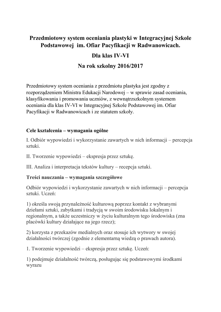 Przedmiotowy system oceniania plastyki w Integracyjnej Szkole Podstawowej im. Ofiar Pacyfikacji w Radwanowicach. Dla klas IV-VI Na rok szkolny 2016/2017 Przedmiotowy system oceniania z przedmiotu plastyka jest zgodny z rozporządzeniem Ministra Edukacji Narodowej – w sprawie zasad oceniania, klasyfikowania i promowania uczniów, z wewnątrzszkolnym systemem oceniania dla klas IV-VI w Integracyjnej Szkole Podstawowej im. Ofiar Pacyfikacji w Radwanowicach i ze statutem szkoły. Cele kształcenia – wymagania ogólne I. Odbiór wypowiedzi i wykorzystanie zawartych w nich informacji – percepcja sztuki. II. Tworzenie wypowiedzi – ekspresja przez sztukę. III. Analiza i interpretacja tekstów kultury – recepcja sztuki. Treści nauczania – wymagania szczegółowe Odbiór wypowiedzi i wykorzystanie zawartych w nich informacji – percepcja sztuki. Uczeń: 1) określa swoją przynależność kulturową poprzez kontakt z wybranymi dziełami sztuki, zabytkami i tradycją w swoim środowisku lokalnym i regionalnym, a także uczestniczy w życiu kulturalnym tego środowiska (zna placówki kultury działające na jego rzecz); 2) korzysta z przekazów medialnych oraz stosuje ich wytwory w swojej działalności twórczej (zgodnie z elementarną wiedzą o prawach autora). 1. Tworzenie wypowiedzi – ekspresja przez sztukę. Uczeń: 1) podejmuje działalność twórczą, posługując się podstawowymi środkami wyrazu plastycznego i innych dziedzin sztuki (fotografika, film) w kompozycji na płaszczyźnie i w przestrzeni (stosując określone materiały, narzędzia i techniki właściwe dla tych dziedzin sztuki); 2) realizuje projekty w zakresie form użytkowych, w tym służące kształtowaniu wizerunku i otoczenia człowieka oraz upowszechnianiu kultury w społeczności szkolnej i lokalnej (stosując także narzędzia i wytwory multimedialne). 2. Analiza i interpretacja tekstów kultury – recepcja sztuki. Uczeń: 1) rozróżnia określone dyscypliny w takich dziedzinach jak: architektura, sztuki plastyczne oraz w innych dziedzinach sztuki (fotografika, film) i przekazach medialnych (telewizja, Internet); 2) rozpoznaje wybrane dzieła architektury i sztuk plastycznych należące do polskiego i europejskiego dziedzictwa kultury oraz opisuje ich funkcje i cechy charakterystyczne na tle epoki (posługując się podstawowymi terminami i pojęciami właściwymi dla tych dziedzin sztuki). Realizacji tych celów służy: 1.Rozpoznanie przez nauczyciela poziomu i postępów w opanowaniu przez ucznia wiadomości i umiejętności. 2. Informowanie ucznia o jego osiągnięciach edukacyjnych i czynionych postępach. 3. Monitorowanie postępów uczniów i określenie ich potrzeb. 4. Motywowanie uczniów do odpowiedzialności za udział w procesie uczenia się i dalszej pracy. 5.Dostarczanie rodzicom (prawnym opiekunom) i nauczycielom informacji o postępach i trudnościach w nauce lub specjalnych uzdolnieniach ucznia. Standardy wiadomości i umiejętności z plastyki Odróżnianie dziedzin sztuk plastycznych. Stosowanie w swoich pracach różnych technik rysunkowych, malarskich i rzeźbiarskich. Rozpoznawanie barw podstawowych dopełniających ,złamanych, pochodnych, ciepłych i zimnych. Znajomość podstawowych terminów plastycznych Umiejętność zastosowania w swoich pracach plam miękkich i ostrych, światłocienia i waloru. Rozpoznawanie różnych perspektyw w malarstwie i rysunku oraz umiejętność zastosowania ich w praktyce. Umiejętność rysowania postaci w ruchu i bezruchu, kształtów przedmiotów z natury. Rozpoznawanie cech różnych stylów w sztuce i ich przedstawicieli . Stosowanie podstawowych zasad kompozycji w swoich pracach plastycznych. Zasady oceniania Zgodnie z rozporządzeniem Ministra Edukacji Narodowej z dnia 20 sierpnia 2010 r. zmieniającym rozporządzenie w sprawie warunków i sposobu oceniania, klasyfikowania i promowania uczniów i słuchaczy oraz przeprowadzania sprawdzianów i egzaminów w szkołach publicznych ocena z plastyki powinna uwzględniać przede wszystkim stosunek ucznia do przedmiotu, pracę włożoną w realizację wymagań oraz zaangażowanie ucznia w uczestnictwo w kulturze. Jego uzdolnienia plastyczne nie mogą być podstawowym kryterium oceniania. I Na początku roku szkolnego uczniowie są informowani przez nauczyciela przedmiotu o zakresie wymagań obowiązujących w danym roku (zakres wiadomości i umiejętności, które trzeba mieć opanowane na koniec roku szkolnego) oraz o sposobie i zasadach oceniania. II 1. Wystawiane oceny są jawne i na prośbę ucznia lub rodzica nauczyciel uzasadnia je. 2. Uczniowie za swą pracę otrzymują oceny według skali 1- 6 oraz „+” i „-”. Uczeń może też otrzymać ocenę cząstkową +2,-2,+3,-3,+4,-4,+5,-5 3. Odpowiedzi ustne i kartkówki z trzech ostatnich lekcji nie zawsze zapowiadane. III Sprawdzanie wiedzy i umiejętności edukacyjnych ucznia przeprowadzane jest przez: wypowiedzi ustne ,wypowiedzi pisemne ( kartkówki, karty pracy) wykonywanie zadań i ćwiczeń plastycznych, zadania domowe aktywność ucznia na lekcji samodzielne podejmowanie działań twórczych ,udział w konkursach i wystawach. Wystawiając ocenę uczniowi, nauczyciel uwzględnia także elementy mówiące o zachowaniu i prezentowanej przez ucznia postawie: aktywne uczestnictwo w zajęciach, (odpowiedzi ustne) zaangażowanie i wkład pracy własnej ucznia, prace dodatkowe (wytwory ucznia, prezentacja), udział w wystawach i konkursach wykazywanie umiejętności planowania własnych działań dbanie o ład wokół siebie podczas zajęć a po zajęciach porządkowanie swojego miejsca pracy samodzielne lub grupowe rozwiązywanie ćwiczeń problemowych IV 1. Kartkówki i odpowiedzi ustne nie podlegają poprawie. 2. Uczniowie otrzymują oceny za aktywny udział w lekcji: przy jednej godzinie tygodniowo: „+++” = ocena bardzo dobra „-” za brak przygotowania do zajęć, które musi być zgłoszone nauczycielowi przed rozpoczęciem
