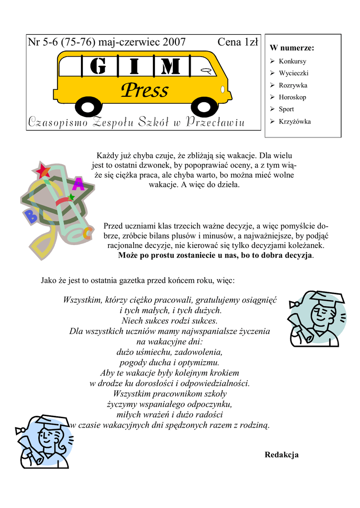 Nr 5-6 (75-76) maj-czerwiec 2007 Cena 1zł W numerze: Konkursy Wycieczki Rozrywka Horoskop Sport Krzyżówka Czasopism o Z espoł u Szk ół w Przecław iu Każdy już chyba czuje, że zbliżają się wakacje. Dla wielu jest to ostatni dzwonek, by popoprawiać oceny, a z tym wiąże się ciężka praca, ale chyba warto, bo można mieć wolne wakacje. A więc do dzieła. Przed uczniami klas trzecich ważne decyzje, a więc pomyślcie dobrze, zróbcie bilans plusów i minusów, a najważniejsze, by podjąć racjonalne decyzje, nie kierować się tylko decyzjami koleżanek. Może po prostu zostaniecie u nas, bo to dobra decyzja. Jako że jest to ostatnia gazetka przed końcem roku, więc: Wszystkim, którzy ciężko pracowali, gratulujemy osiągnięć i tych małych, i tych dużych. Niech sukces rodzi sukces. Dla wszystkich uczniów mamy najwspanialsze życzenia na wakacyjne dni: dużo uśmiechu, zadowolenia, pogody ducha i optymizmu. Aby te wakacje były kolejnym krokiem w drodze ku dorosłości i odpowiedzialności. Wszystkim pracownikom szkoły życzymy wspaniałego odpoczynku, miłych wrażeń i dużo radości w czasie wakacyjnych dni spędzonych razem z rodziną. Redakcja Czasopismo Zespołu Szkół w Przecławiu Str. 2 Wywiad z panią Dyrektor mgr Barbarą Dybską -Dlaczego zdecydowała się Pani zainstalować na terenie szkoły kamery? -Przede wszystkim dla Waszego bezpieczeństwa. Takie były wnioski rodziców i samorządu uczniowskiego opracowane jeszcze w ubiegłym roku. Na razie zamontowane jest 10 kamer. W przyszłości, czyli we wrześniu, będzie zamontowanych kolejne 10. Myślę, że zwiększy to komfort Waszego przebywania w szkole i uniemożliwi przebywanie obcych osób w budynku. Będzie można również zidentyfikować obce samochody, podjeżdżające nie wiadomo w jakim celu pod szkołę. -Myśli Pani, że to pomoże w utrzymaniu dyscypliny w naszej szkole? -To nie chodzi o utrzymanie dyscypliny. Chodzi o wykrycie takich przypadków, kiedy ewidentnie ktoś zachowuje się agresywnie. Mamy na celu wyeliminowanie zagrożenia z zewnątrz. -Czy są jeszcze jakieś plany w związku ze zlikwidowaniem przemocy w szkole? -Tak, są takie plany, ale na razie nie chcę o tym mówić, ponieważ muszą być skonsultowane z Waszymi rodzicami. -Swoją drogą, jaką ocenę w skali 1-6 wystawiłaby Pani sferze bezpieczeństwa naszej szkoły? -Stale jesteście ankietowani. W swoich odpowiedziach określacie, jakie jest Wasze poczucie bezpieczeństwa w szkole. Według waszych ocen jest to ocena dobra, a więc 4. Poczucie bezpieczeństwa jest wypadkową działań nauczycieli, dyrekcji, ale i uczniów, bo to głównie Wy tworzycie atmosferę pracy w tej szkole. -Jesteśmy już po maturach i egzaminach gimnazjalnych. Jak Pani ocenia ten rok w sensie przygotowań do tak ważnych wydarzeń? -Cóż, wyniki wszystkich egzaminów zewnętrznych, zarówno gimnazjalnych, jak i maturalnych w bardzo dużej mierze zależy od Was. Do tego jak poważnie podchodzicie do nich. Ze strony szkoły natomiast zostały spełnione wszystkie warunki, jakie tylko można było zapewnić. Sami dobrze wiecie, że pisaliście bardzo dużo arkuszy próbnych, oczywiście na początku były protesty, ale wydaję mi się, że na pewno mnóstwo rzeczy sobie przećwiczyliście i przypomnieliście, a w jakim stopniu, okaże się kiedy przyjdą wyniki. Mogę tylko powiedzieć, że egzaminy ustne z matur przebiegły bardzo dobrze, a wyniki były bardzo wysokie, co potwierdziło dobre przygotowanie do tego najważniejszego w życiu egzaminu. -Czas składania podań do szkół ponadgimnazjalnych. Co szkoła może zaoferować przyszłorocznym licealistom? -Planów mamy bardzo dużo. Rozmawialiśmy na ten temat z nauczycielami i uczniami liceum. Planujemy oddzielić samorząd szkolny liceum od gimnazjum, żeby wszystkie imprezy, które odbywają się w szkole, były organizowane na dwóch poziomach. Chcemy też, by obowiązkowo wprowadzić dla liceum wyjazdy co 3 miesiące do kina lub teatru do dużego ośrodka kulturalnego np. do Krakowa. Chcemy również prowadzić spotkania ze studentami z wyższych uczelni, aby licealiści mogli się dowiedzieć, jak przebiega nauka na wyższych uczelniach i jak się do niej przygotować. Poza tym uczniowie liceum odróżnieniu od gimnazjalistów będą mogli wychodzić na przerwach poza szkołę Poza tym chcielibyśmy, aby za zgodą rodziców uczniowie pełnoletni mogli usprawiedliwiać się sami. Na początku roku pragniemy też zorganizować dla licealistów piknik połączony z ogniskiem. Kolejnym krokiem, którego chcemy się podjąć, jest wprowadzenie raz na dwa miesiące debat jako sposobu nauczania niekonwencjonalnego. Są one potrzebne, ponieważ uczą umiejętności dyskusji i wyrażania swoich poglądów oraz formułowania własnych myśli. W związku z tym sądzę, że byłyby to ciekawe spotkania. Oddzielne rekolekcje również są brane pod uwagę. Poza tym sami uczniowie wiedzą, że mogą liczyć na pomoc nauczycieli bardzo szerokim zakresie. - Od dłuższego czasu usłyszeć można coś niecoś o rzekomej budowie basenu... -No cóż, to pytanie powinny zostać skierowane do Pana wójta. Z tego, co wiem, to nadal takie plany istnieją i nadal takie zamierzenia są. Brakuje jedynie, a może przede wszystkim środków, czyli po prostu pieniędzy. Nie pożegnaliśmy się z planami i Pan wójt również, na razie trzeba szukać na to pieniędzy, a na basen potrzeba ich bardzo dużo. - Dziękujemy Pani Dyrektor za rozmowę. Tomasz Król i Mateusz Żądło GIMPRESS 5-6 (75-76`) maj-czerwiec 2007 Czasopismo Zespołu Szkół w Przecławiu Str. 3 Podsumowanie kuratoryjnych konkursów przedmiotowych We wcześniejszych numerach podawaliśmy informacje o uczestnikach konkursów przedmiotowych, w tym numerze przedstawiamy tych, którzy osiągnęli naprawdę wysokie wyniki, a ich osiągnięcia to SUKCES i to przez duże „S”. I tak po kolei. KONKURS MATEMATYCZNY Laureatem tego konkursu zost