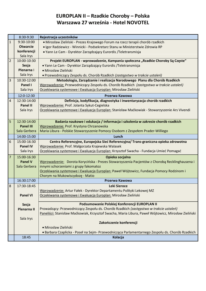 EUROPLAN II – Rzadkie Choroby – Polska Warszawa 27 września - Hotel NOVOTEL 1 2 3 4 5 6 7 8 8:30-9:30 9:30-10:00 Otwarcie konferencji Sala Irys 10:00-10:30 Sesja Plenarna I Sala Irys 10:30-12:00 Panel I Sala Irys Rejestracja uczestników • Mirosław Zieliński - Prezes Krajowego Forum na rzecz terapii chorób rzadkich • Igor Radziewicz - Winnicki - Podsekretarz Stanu w Ministerstwie Zdrowia RP • Yann Le Cam - Dyrektor Zarządzający Eurordis /Teletransmisja 12:0-12:30 12:30-14:00 Panel II Sala Irys Przerwa Kawowa Definicja, kodyfikacja, diagnostyka i inwentaryzacja chorób rzadkich Wprowadzenie: Prof. Jolanta Sykut-Cegielska Oczekiwania systemowe i Ewaluacja Europlan: Stanisław Maćkowiak - Stowarzyszenie Ars Vivendi 12:30-14:00 Panel III Sala Gerbera 14:00-15:00 15:00-16:30 Panel IV Sala Irys Badania naukowe i edukacja / Informacja i szkolenia w zakresie chorób rzadkich Wprowadzenie: Prof. Krystyna Chrzanowska Maria Libura - Polskie Stowarzyszenie Pomocy Osobom z Zespołem Prader-Williego Lunch Centra Referencyjne, Europejska Sieć Referencyjna/ Trans-graniczna opieka zdrowotna Wprowadzenie: Prof. Małgorzata Krajewska Walasek Oczekiwania systemowe i Ewaluacja Europlan: Krzysztof Swacha - Fundacja Umieć Pomagać Projekt EUROPLAN - wprowadzenie, Kampania społeczna „Rzadkie Choroby Są Częste” • Yann Le Cam - Dyrektor Zarządzający Eurordis /Teletransmisja • Mirosław Zieliński • Przewodniczący Zespołu ds. Chorób Rzadkich (zastępstwo w trakcie ustaleń) Metodologia, Zarządzanie i realizacja Narodowego Planu dla Chorób Rzadkich Wprowadzenie: Przewodniczący Zespołu ds. Chorób Rzadkich (zastępstwo w trakcie ustaleń) Oczekiwania systemowe i Ewaluacja Europlan: Mirosław Zieliński 15:00-16:30 Opieka socjalna Panel V Wprowadzenie: Dorota Korycińska - Prezes Stowarzyszenia Pacjentów z Chorobą Recklinghausena i Sala Gerbera innymi schorzeniami z grupy fakomatoz Oczekiwania systemowe i Ewaluacja Europlan: Paweł Wójtowicz, Fundacja Pomocy Rodzinom i Chorym na Mukowiscydozę - Matio 16:30:17:00 Przerwa Kawowa 17:30-18:45 Leki Sieroce Wprowadzenie: Artur Fałek - Dyrektor Departamentu Polityki Lekowej MZ Panel VI Oczekiwania systemowe i Ewaluacja Europlan: Mirosław Zieliński Sesja Plenarna II Sala Irys 18:45 Podsumowanie Polskiej Konferencji EUROPLAN II Prowadzący: Przewodniczący Zespołu ds. Chorób Rzadkich (zastępstwo w trakcie ustaleń) Paneliści: Stanisław Maćkowiak, Krzysztof Swacha, Maria Libura, Paweł Wójtowicz, Mirosław Zieliński Zakończenie konferencji • Mirosław Zieliński • Barbara Czaplicka - Poseł na Sejm- Przewodnicząca Parlamentarnego Zespołu ds. Chorób Rzadkich Kolacja