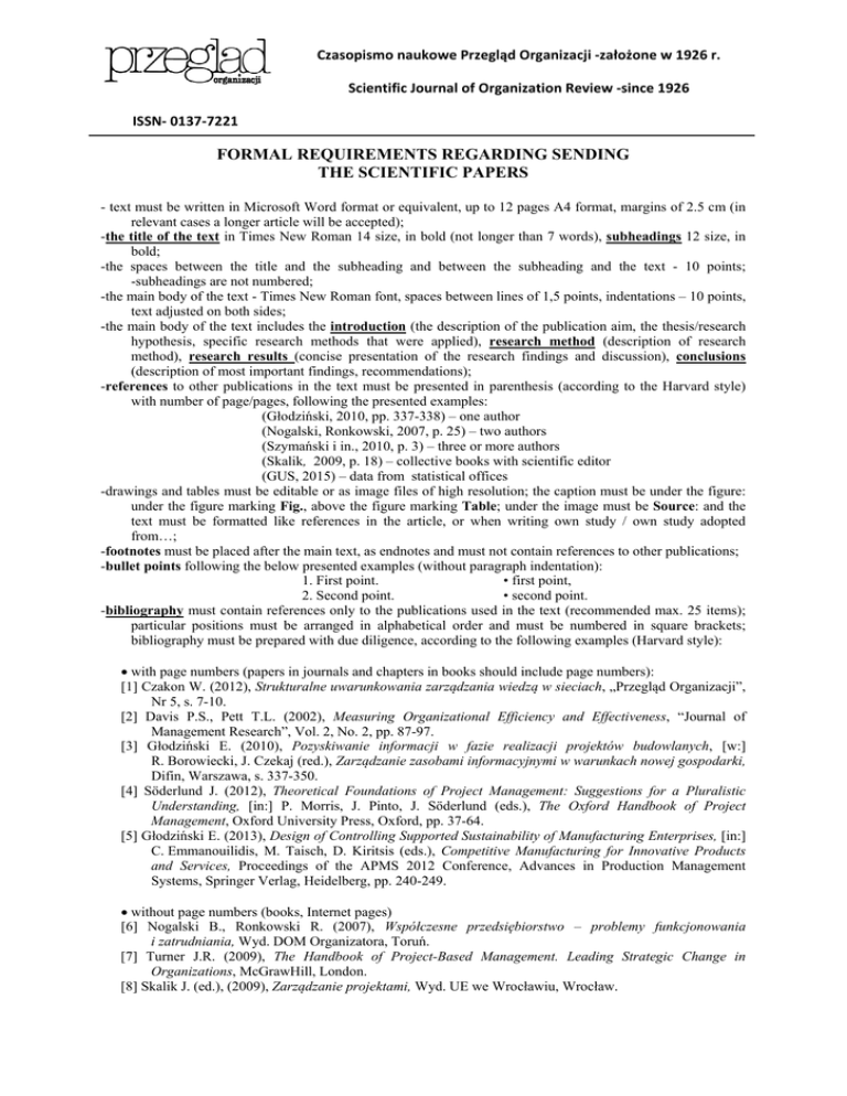 Czasopismo naukowe Przegląd Organizacji ‐założone w 1926 r. Scientific Journal of Organization Review ‐since 1926 ISSN‐ 0137‐7221 FORMAL REQUIREMENTS REGARDING SENDING THE SCIENTIFIC PAPERS - text must be written in Microsoft Word format or equivalent, up to 12 pages A4 format, margins of 2.5 cm (in relevant cases a longer article will be accepted); -the title of the text in Times New Roman 14 size, in bold (not longer than 7 words), subheadings 12 size, in bold; -the spaces between the title and the subheading and between the subheading and the text - 10 points; -subheadings are not numbered; -the main body of the text - Times New Roman font, spaces between lines of 1,5 points, indentations – 10 points, text adjusted on both sides; -the main body of the text includes the introduction (the description of the publication aim, the thesis/research hypothesis, specific research methods that were applied), research method (description of research method), research results (concise presentation of the research findings and discussion), conclusions (description of most important findings, recommendations); -references to other publications in the text must be presented in parenthesis (according to the Harvard style) with number of page/pages, following the presented examples: (Głodziński, 2010, pp. 337-338) – one author (Nogalski, Ronkowski, 2007, p. 25) – two authors (Szymański i in., 2010, p. 3) – three or more authors (Skalik, 2009, p. 18) – collective books with scientific editor (GUS, 2015) – data from statistical offices -drawings and tables must be editable or as image files of high resolution; the caption must be under the figure: under the figure marking Fig., above the figure marking Table; under the image must be Source: and the text must be formatted like references in the article, or when writing own study / own study adopted from…; -footnotes must be placed after the main text, as endnotes and must not contain references to other publications; -bullet points following the below presented examples (without paragraph indentation): 1. First point. • first point, 2. Second point. • second point. -bibliography must contain references only to the publications used in the text (recommended max. 25 items); particular positions must be arranged in alphabetical order and must be numbered in square brackets; bibliography must be prepared with due diligence, according to the following examples (Harvard style): with page numbers (papers in journals and chapters in books should include page numbers): [1] Czakon W. (2012), Strukturalne uwarunkowania zarządzania wiedzą w sieciach, „Przegląd Organizacji”, Nr 5, s. 7-10. [2] Davis P.S., Pett T.L. (2002), Measuring Organizational Efficiency and Effectiveness, “Journal of Management Research”, Vol. 2, No. 2, pp. 87-97. [3] Głodziński E. (2010), Pozyskiwanie informacji w fazie realizacji projektów budowlanych, [w:] R. Borowiecki, J. Czekaj (red.), Zarządzanie zasobami informacyjnymi w warunkach nowej gospodarki, Difin, Warszawa, s. 337-350. [4] Sӧderlund J. (2012), Theoretical Foundations of Project Management: Suggestions for a Pluralistic Understanding, [in:] P. Morris, J. Pinto, J. Sӧderlund (eds.), The Oxford Handbook of Project Management, Oxford University Press, Oxford, pp. 37-64. [5] Głodziński E. (2013), Design of Controlling Supported Sustainability of Manufacturing Enterprises, [in:] C. Emmanouilidis, M. Taisch, D. Kiritsis (eds.), Competitive Manufacturing for Innovative Products and Services, Proceedings of the APMS 2012 Conference, Advances in Production Management Systems, Springer Verlag, Heidelberg, pp. 240-249. without page numbers (books, Internet pages) [6] Nogalski B., Ronkowski R. (2007), Współczesne przedsiębiorstwo – problemy funkcjonowania i zatrudniania, Wyd. DOM Organizatora, Toruń. [7] Turner J.R. (2009), The Handbook of Project-Based Management. Leading Strategic Change in Organizations, McGrawHill, London. [8] Skalik J. (ed.), (2009), Zarządzanie projektami, Wyd. UE we Wrocławiu, Wrocław. Czasopismo naukowe Przegląd Organizacji ‐założone w 1926 r. Scientific Journal of Organization Review ‐since 1926 ISSN‐ 0137‐7221 [9] GUS (2015), Koniunktura w przemyśle, budownictwie, handlu i usługach w czerwcu 2015 r., http://stat.gov.pl/obszary-tematyczne/koniunktura/koniunktura/koniunktura-w-przemyslebudownictwie-handlu-i-uslugach-w-czerwcu-2015-r-,3,31.html, access date: 22.06.2015. [10] Eurostat (2015), Smarter, Greener, More Inclusive - Indicators to Support the Europe 2020 Strategy, http://ec.europa.eu/eurostat/statistics-explained/index.php/Smarter,_greener,_more_inclusive__indicators_to_support_the_Europe_2020_strategy, access date: 22.06.2015. [11] Blanchard O. (2015), Greece: A Credible Deal Will Require Difficult Decisions By All Sides, http://blogimfdirect.imf.org/2015/06/14/greece-a-credible-deal-will-require-difficult-decisions-by-all-sides/, access date: 22.06.2015. or if necessary: [12] http://www.przegladorganizacji.pl/, access date: 23.06.2015. -summary (max. 200 words), including the aim of the publication and the short description of main findings; -keywords (max. 4); -the author’s name, surname, academic degrees; -author’s e-mail address -the affiliation (Faculty and University); THE FORMAL REQUIREMENTS REGARDING REVIEWS, CONFERENCE REPORTS OR OTHER ACADEMIC EVENTS The submitted reviews, conference and seminar reports must comply with the same editing requirements as the scientific articles. They will not exceed 4 pages and must be written by a prominent academic.