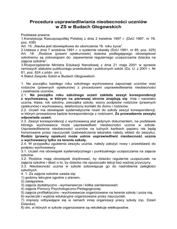 Procedura usprawiedliwiania nieobecności uczniów w ZS w Budach Głogowskich Podstawa prawna: 1.Konstytucja Rzeczpospolitej Polskiej z dnia 2 kwietnia 1997 r. (DzU 1997, nr 78, poz. 438) Art. 15: „Nauka jest obowiązkowa do ukończenia 18. roku życia”. 2.Ustawa z dnia 7 września 1991 r. o systemie oświaty (DzU 1991, nr 95, poz. 425) Art. 18: „Rodzice (prawni opiekunowie) dziecka podlegającego obowiązkowi szkolnemu są zobowiązani do: zapewnienia regularnego uczęszczania dziecka na zajęcia szkolne”. 3.Rozporządzenie Ministra Edukacji Narodowej z dnia 21 maja 2001 w sprawie ramowych statutów publicznego przedszkola i publicznych szkół; (Dz. U. z 2001 r. Nr 61, poz. 624 z późn. zm.), 4.Statut Zespołu Szkół w Budach Głogowskich. 1. Na początku każdego roku szkolnego wychowawca zapoznaje uczniów oraz rodziców (prawnych opiekunów) z procedurami usprawiedliwiania nieobecności i zwalniania uczniów. 2.1. Na początku roku szkolnego uczeń zakłada zeszyt korespondencji z wychowawcą, w którym na pierwszej stronie znajdują się: imię i nazwisko ucznia, klasa, rok szkolny, pieczątka szkoły, wzory podpisów rodziców (prawnych opiekunów) i wychowawcy, telefoniczny kontakt do domu i rodziców. 2.2. Uczeń ma obowiązek systematycznie nosić do szkoły zeszyt korespondencji, w którym prowadzona będzie korespondencja z rodzicami. Za prowadzenie zeszytu odpowiada uczeń. 2.3. Zeszyt korespondencji z wychowawcą jest jedynym dokumentem, na podstawie którego wychowawca może usprawiedliwić nieobecności ucznia w szkole. Usprawiedliwienia nieobecności uczniów na luźnych kartkach papieru nie będą honorowane przez nauczycieli (zaświadczenia lekarskie należy wkleić do zeszytu). Rodzic (prawny opiekun) może ustnie usprawiedliwić nieobecność ucznia u wychowawcy tylko na terenie szkoły. 2.4. W przypadku zgubienia zeszytu ucznia, należy założyć nowy i przedstawić do podpisu wychowawcy. 3.1. Uczeń ma obowiązek systematycznego i punktualnego uczęszczania na zajęcia szkolne. 3.2. Rodzice mają obowiązek dopilnować, by dziecko regularnie uczęszczało na zajęcia szkolne i dbać o to, by dziecko nie opuszczało lekcji bez ważnej przyczyny. 3.3. Nieobecność ucznia w szkole zobowiązuje go do nadrobienia zaległości szkolnych. 4. 1. Za zajęcia szkolne uważa się: 1) godziny lekcyjne zgodne z planem, 2) zastępstwa, 3) zajęcia dydaktyczno –wyrównawcze i kółka zainteresowań; 4) zajęcia Pomocy Psychologiczno-Pedagogicznej 5) zajęcia profilaktyczno –wychowawcze organizowane na terenie szkoły i poza nią, 6) wycieczki i wyjścia edukacyjne organizowane przez nauczycieli, 7) imprezy odbywające się w ramach innej organizacji pracy szkoły (np. Dzień Dziecka); 8) dni, w których w szkole organizowane są rekolekcje wielkopostne. 4.2. Nieuzasadniona nieobecność ucznia na zajęciach wymienionych w ust. 1 traktowana jest jako nieobecność nieusprawiedliwiona. 4.3. Uczniów obowiązuje bezwzględny zakaz opuszczania budynku szkolnego w czasie cyklu zajęć. Uczeń, który samowolnie oddali się z zajęć bez pisemnego zwolnienia rodziców (prawnych opiekunów), nie może mieć usprawiedliwionej nieobecności –nieobecność ta traktowana jest jako ucieczka. 4.4. Jeżeli uczeń był nieobecny na zajęciach, ale przebywał w tym czasie na terenie szkoły pod opieką innego nauczyciela (np. próba przed występem), to nieobecność ta jest traktowana jako zwolnienie, ale uczeń powinien uzupełnić notatki i lekcję. 5. Decyzję, czy daną nieobecność uznać za uzasadnioną czy nie, podejmuje wychowawca klasy. 6.1. O usprawiedliwienie nieobecności wnioskują rodzice (prawni opiekunowie). 6.2. Pisemny wniosek rodziców o usprawiedliwienie nieobecności ucznia powinien zawierać: datę usprawiedliwianej nieobecności, wymiar (w dniach lub godzinach w przypadku nieobecności na części zajęć), przyczynę, czytelny podpis rodzica wnioskującego o usprawiedliwienie. 6.3. Rodzic może usprawiedliwić nieobecność dziecka tylko w zeszycie ucznia. Rozmowa telefoniczna, sms, e-mail są jedynie informacją dla wychowawcy o sytuacji ucznia. 6.4. Rodzice są zobowiązani do terminowego usprawiedliwiania nieobecności – w ciągu 14 dni od dnia powrotu dziecka do szkoły. 7.1. Uczeń ma obowiązek dostarczyć wychowawcy wniosek rodziców o usprawiedliwienie nieobecności (wpisaną do zeszytu ucznia) w dniu powrotu do szkoły lub na najbliższej godzinie wychowawczej, nie później niż w ciągu 14 dni od powrotu do szkoły. Jeżeli w tym czasie wychowawca jest nieobecny w szkole, to uczeń zobowiązany jest przedstawić usprawiedliwienie na pierwszych zajęciach z wychowawcą po jego powrocie do pracy. 7.2. Jeżeli w ciągu 14 dni od powrotu do szkoły uczeń nie dostarczy usprawiedliwienia, godziny zostają nieusprawiedliwione. 7.3. W przypadku, kiedy uczeń przed upływem czternastodniowego terminu usprawiedliwienia nieobecności ponownie jest nieobecny w szkole, wychowawca powinien podjąć działania mające na celu wyjaśnienie przyczyn jego nieobecności. 7.4. Uczeń jest osobiście odpowiedzialny za terminowe rozliczanie swoich nieobecności. 8.1. Wychowawca może usprawiedliwić nieobecności ucznia w szkole na podstawie: 1) zwolnienia lekarskiego (wklejonego do zeszytu ucznia), 2) pisemnej prośby rodziców (prawnych opiekunów) w zeszycie ucznia, 3) zaświadczenia odpowiednich urzędów i organizacji, 4) ustnego usprawiedliwienia podczas pobytu rodzica w szkole, 8.2. Wniosek rodzica o usprawiedliwienie musi zawierać wyjaśnienie przyczyny nieobecności. 8.3. Rodzic ma prawo odwołać się od decyzji wychowawcy o nieusprawiedliwieniu nieobecności dziecka do dyrektora szkoły w formie pisemnej. Decyzja dyrektora jest ostateczna. 9.1. Każdą godzinę przewidywanej nieobecności (np. wizyta u lekarza specjalisty) należy usprawiedliwić w terminie poprzedzającym tę nieobecność. 9.2. O przewidywanej, dłuższej niż 5 dni, nieobecnośc