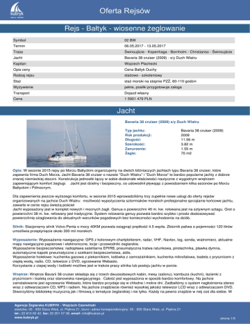 Oferta Rejsów Rejs - Bałtyk - wiosenne żeglowanie Symbol 02 BW Termin 06.05.2017 - 13.05.2017 Trasa Świnoujście - Kopenhaga - Bornholm - Christianso - Świnoujście Jacht Bavaria 38 cruiser (2009) - s/y Duch Wiatru Kapitan Wojciech Płachecki Opis ceny Cena Bałtyk Duchy Rodzaj rejsu stażowo - szkoleniowy Staż staż morski na stopnie PZŻ, 60-110 godzin Wyżywienie pełne, posiłki przygotowuje załoga Transport Dojazd własny Cena 1 5901 479 PLN Jacht Bavaria 38 cruiser (2009) s/y Duch Wiatru Typ jachtu: Rok produkcji: Długość: Szerokość: Zanurzenie: Żagle: Bavaria 38 cruiser (2009) 2009 11.56 m 3.82 m 1.55 m 70 m2 Opis: W sezonie 2015 rejsy po Morzu Bałtyckim organizujemy na dwóch bliźniaczych jachtach typu Bavaria 38 cruiser, które zapewnia firma Duch Morza. Jacht Bavaria 38 cruiser o nazwie "Duch Wiatru" i "Duch Morza" to bardzo popularne jachty z dobrze znanej niemieckiej stoczni. Konstrukcja jednostki łączy w sobie doskonałe właściwości nautyczne z wygodnym wnętrzem zapewniającym komfort żeglugi. Jacht jest dzielny i bezpieczny, co udowodnił pływając z powodzeniem kilka sezonów po Morzu Bałtyckim i Północnym. Dla zapewnienia jeszcze wyższego komfortu, w sezonie 2015 wprowadziliśmy trzy zupełnie nowe usługi do oferty rejsów organizowanych na jachcie Duch Wiatru: możliwość wypożyczenia sztormiaków morskich profesjonalne sprzątanie końcowe jachtu, zawarte w cenie rejsu świeżą pościel Jacht wyposażony jest w komplet nowych i mocnych żagli. Genua o powierzchni 40 m. kw. rolowana jest na sztywnym sztagu. Grot o powierzchni 38 m. kw. refowany jest tradycyjnie. System rolowania genuy pozwala bardzo szybko i prosto dostosowywać powierzchnię ożaglowania do aktualnych warunków pogodowych bez konieczności wychodzenia na dziób. Silnik: Stacjonarny silnik Volvo-Penta o mocy 40KM pozwala osiągnąć prędkość 4.5 węzła. Zbiornik paliwa o pojemności 120 litrów umożliwia przepłynięcie około 300 mil morskich. Wyposażenie: Wyposażenie nawigacyjne: GPS z kolorowym chartplotterem, radar, VHF, Navtex, log, sonda, wiatromierz, aktualne mapy nawigacyjne papierowe i elektroniczne, locje i przewodniki żeglarskie. Wyposażenie bezpieczeństwa: radiopława satelitarna EPIRB, pneumatyczna tratwa ratunkowa, pirotechnika, pławka dymna, automatyczne kapoki pneumatyczne z szelkami bezpieczeństwa, aldis. Wyposażenie hotelowe: kuchenka gazowa z piekarnikiem, lodówka z zamrażalnikiem, kuchenka mikrofalowa, toaleta z prysznicem z ciepłą wodą, radio, CD, telewizor z DVD, ogrzewanie Webasto. Korzystanie z ciepej wody i lodówki możliwe jest w trakcie pracy silnika lub postoju jachtu w porcie. Wnętrze: Wnętrze Bavarii 38 cruiser składaja się z trzech dwuosobowych kabin, mesy (salonu), kambuza (kuchni), łazienki z prysznicem i toaletą oraz stanowiska nawigacyjnego. Całość jest wyposażona w sposób bardzo komfortowy. Na jachcie zainstalowanie jest ogrzewanie Webasto, które bardzo przydaje się w chłodne i mokre dni. Zadbaliśmy o system nagłośnienia stereo wraz z odtwarzaczem CD, MP3 i radiem. Na jachcie znajdziecie również wysokiej jakości telewizor LCD wraz z odtwarzaczem DVD. Stworzyliśmy bibliotekę muzyczną jak i filmową o tematyce żeglarskiej i nie tylko. Każdy na pewno znajdzie w niej coś dla siebie. W Agencja Żeglarska KUBRYK - Wojciech Czerwiński siedziba: 05 - 830 Stara Wieś, ul. Piękna 21, biuro i adres korespondencyjny: 05 - 830 Stara Wieś, ul. Piękna 21 tel.: 22 810 00 42, fax: 22 201 07 38, email: [email protected] www.kubryk.pl strona 1/5 Oferta Rejsów łazience oprócz toalety i umywalki znajduje się prysznic z ciepłą wodą. Aby zwiększyć autonomię jachtu na morzu, dodatkowo zostały wbudowane zbiorniki z wodą słodką (210+150 l). Kuchnia wyposażona jest w mikrofalówkę, dwupalnikową kuchenkę gazową i piekarnik. Trasa Świnoujście - Kopenhaga - Bornholm - Christianso - Świnoujście Morze jest otwarte dla wszystkich, wystarczy chcieć przeżyć przygodę. Pozwól swobie na realizaję marzeń już dziś. Morze Bałtyckie świetnie sprawdza się jako akwen na pierwszy rejs morski. Tych bardziej doświadczanych Bałtyk chętnie szkoli ucząc pokory, dokonując niezbędnych w żeglarstwie szlifów. Dzień pierwszy W sobotę o 16:00 w Marinie Północnej w Świnoujściu będzie czekał s/y Duch Morza - Wasz dom przez najbliższy tydzień. Po zapoznaniu się z jechtem, wybraniu koi w kabinach lub mesie, rozpakowaniu się oraz po ształowaniu prowiantu, kapitan przeprowadzi obowiązkowe szkolenie z zasad bezpieczeństwa i z obsługi jachtu, podzieli załogę na wachty, omówi plan rejsu i aktualną prognozę pogody. Czy wypłyniemy jeszcze tego samego dnia, czy zostaniemy w porcie na noc? Na to pytanie odpowie kapitan po sprawdzeniu prognozy pogody i rozmowie z załogą. Rejs - dokąd popłyniemy... Żeglarstwo morskie rządzi się swoimi prawami. Uzależnione jest od warunków atmosferycznych. Zdarza się, że wiatr i morze mają inne niż my plany i nie udaje się zrealizować założonej wcześniej trasy. Jednak Bałtyk jest tak ciekawym akwenem, że niezależnie w którą stronę popłyniemy, to trafimy do miejsc wyjątkowych i przeżywając niezapomnianą przygodę, zakosztujemy prawdziwego żeglarstwa. Zazwyczaj zaraz po wypłynięciu ze Świnoujścia kierujemy się w stronę miasta, w którym każdy znajdzie coś dla siebie, miasta, którego niepowtarzalny klimat sprawia, że po pierwszej wizycie czujemy duży niedosyt. Do Kopenhagi płyniemy non stop, co może potrwać nieco ponad dobę. Bez zasięgu. Będzie chwila by poczuć się jak wtedy, gdy żyliśmy bez telefonów komórkowych i Facebooka :-) Po zwiedzaniu stolicy Danii i odpoczynku kontynuujemy nasz rejs morski. Przecinamy kanał Falsterbo i kierujemy się ku Bornholmowi, niewielkiej wyspie oferującej kameralne i niezwykle klimatyczne mariny. Małe miasteczka z kolorowymi domami, wąskimi uliczkami i aromatycznym jedzeniem. Na