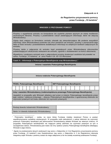 Załącznik nr 4 do Regulaminu przyznawania pomocy przez Fundację „10 kwietnia” WNIOSEK O PRZYZNANIE POMOCY Prosimy o wypełnienie wniosku na komputerze lub czytelnie pismem ręcznym (w miarę możliwości drukowanymi literami). Prosimy o przekreślenie rubryk zawierających informacje, które nie dotyczą Wnioskodawcy. Gdyby ilość miejsca na formularzu wniosku okazała się niewystarczająca dla podania wszystkich informacji, które Wnioskodawca powinien lub chce zamieścić we wniosku, prosimy o zaznaczenie tego faktu w treści wniosku i przedstawienie dodatkowych informacji na odrębnych kartkach załączonych do wniosku. Prosimy także o załączenie do wniosku kopii posiadanych przez Wnioskodawcę dokumentów potwierdzających okoliczności wskazane we wniosku, zgodnie z zestawieniem na końcu dokumentu. Wypełniony i podpisany wniosek wraz z załącznikami prosimy dostarczyć osobiście lub przesłać na adres: Fundacja „10 kwietnia”, al. Jana Pawła II 24, 00-133 Warszawa Część A - Informacje o Potencjalnym Beneficjencie oraz Wnioskodawcy1,2 Imiona i nazwisko Potencjalnego Beneficjenta Imiona rodziców Potencjalnego Beneficjenta PESEL Potencjalnego Beneficjenta NIP Potencjalnego Beneficjenta Imię i nazwisko Wnioskodawcy (rodzica/opiekuna prawnego Potencjalnego Beneficjenta) (wypełnić w przypadku gdy Wniosek składany jest przez w imieniu Potencjalnego beneficjenta przez jego rodzica / opiekuna prawnego – dotyczy Potencjalnych beneficjentów o ograniczonej zdolności do czynności prawnych lub braku zdolności do czynności prawnych) Rodzaj dowodu tożsamości Wnioskodawcy Seria i nr dowodu tożsamości Wnioskodawcy 1 Potencjalny beneficjent – osoba, na rzecz której Fundacja miałaby świadczyć Pomoc w postaci współfinansowania wydatków edukacyjnych. W przypadku osób pełnoletnich o pełnej zdolności do czynności prawnych Potencjalny beneficjent jest jednocześnie Wnioskodawcą (składa Wniosek we własnym imieniu). W przypadku Potencjalnych beneficjentów nie mających pełnej zdolności do czynności prawnych (w tym w szczególności dzieci), Wnioskodawcą jest rodzic lub inny opiekun prawny Potencjalnego beneficjenta składający Wniosek w jego imieniu. 2 Zgoda na przetwarzanie danych osobowych (wg wzoru z Załącznika nr 2 do Regulaminu przyznawania pomocy przez Fundację „10 kwietnia”) oraz Kwestionariusz (wg wzoru z Załącznika nr 3 do Regulaminu) stanowią integralną część Wniosku i powinny zostać do niego załączone (o ile nie zostały wcześniej przekazane Fundacji). 1 Data ważności dowodu tożsamości Wnioskodawcy Część B - Informacja o rodzinie i sytuacji materialnej Liczba osób pozostających z Potencjalnym Beneficjentem we wspólnym gospodarstwie domowym (łącznie z Potencjalnym Beneficjentem): w tym: dzieci do lat 18: młodzież ucząca się w wieku 18-25 lat: Dane dotyczące dochodu członków rodziny pozostających z Wnioskodawcą we wspólnym gospodarstwie domowym : Imię i nazwisko PESEL Stopień pokrewieństwa (lub rodzaj stosunku łączącego osobę z wnioskodawcą) Źródła dochodów3 Wysokość dochodów (miesięcznie brutto) Średni miesięczny dochód brutto na osobę w rodzinie w PLN (suma dochodów brutto wszystkich członków gospodarstwa domowego podzielona przez liczbę osób w gospodarstwie domowym): Majątek (należy wpisać stan majątkowy wnioskodawcy oraz osób pozostających z wnioskodawcą we wspólnym gospodarstwie domowym, wskazując jednocześnie tytuł władania – własność, użytkowanie wieczyste itp. – oraz wartość) 3 dom (wielkość w m2) wartość w PLN mieszkanie (wielkość w m2) wartość w PLN nieruchomość rolna (liczba hektarów ) wartość w PLN Proszę wymienić wszystkie osiągane dochody, w tym w szczególności dochody z tytułu umów o pracę, umów cywilnoprawnych (w tym zlecenia czy o dzieło), z praw autorskich, dochody kapitałowe. W przypadku osiągania przez daną osobę w gospodarstwie domowym dochodów z różnych źródeł, proszę wymienić je oddzielnie, dla każdego wskazując miesięczną wysokość dochodu brutto. 2 inne nieruchomości (wielkość w m2) wartość w PLN Posiadane zasoby pieniężne (np. oszczędności, papiery wartościowe) (należy wpisać wartość nominalną w PLN) przedmioty wartościowe (należy wpisać przedmioty o wartości powyżej 10 000 zł oraz podać wartość) Część C - Uzasadnienie Wniosku Proszę zaznaczyć „x” podstawę pomocy wynikającą ze Statutu Fundacji „10 kwietnia” Punkt 2.1. Statutu – dzieci ofiar katastrofy lotniczej 10.04.2010 w Smoleńsku 2.1 Celem Fundacji jest w pierwszej kolejności przyznanie indywidualnej pomocy finansowej osobom niepełnoletnim a także osobom pełnoletnim pobierającym naukę (nie dłużej jednak niż do ukończenia 25 roku życia), znajdującym się w trudnej sytuacji życiowej lub materialnej, których co najmniej jedno z rodziców, opiekunów prawnych lub innych osób, na których ciążył obowiązek alimentacyjny w stosunku do tych osób, zginęło w dniu 10 kwietnia 2010 roku w Smoleńsku, na skutek katastrofy lotniczej samolotu Tu 154. Punkt 2.2. Statutu – dzieci osób, które ucierpiały pełniąc służbę publiczną 2.2. Celem Fundacji jest ponadto działanie na rzecz i wspieranie innych osób niepełnoletnich oraz pełnoletnich pobierających naukę (nie dłużej jednak niż do ukończenia 25 roku życia), które znajdą się w trudnej sytuacji życiowej lub materialnej w wyniku śmierci lub ciężkiego uszczerbku na zdrowiu co najmniej jednego z ich rodziców, opiekunów prawnych lub innych osób, na których ciążył wobec nich obowiązek alimentacyjny, pod warunkiem, że śmierć lub ciężki uszczerbek na zdrowiu zostały odniesione w trakcie pełnienia służby publicznej (w tym wskutek wystąpienia klęsk żywiołowych lub katastrof). W przypadku gdy statutową podstawą pomocy jest punkt 2.2. Statutu Fundacji „10 kwietnia”, proszę przedstawić w tym po
