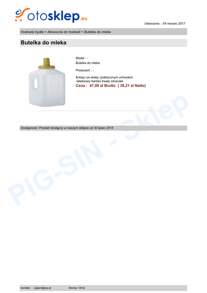 Utworzono : 04 marzec 2017 Hodowla bydła > Akcesoria do hodowli > Butelka do mleka Butelka do mleka Model : Butelka do mleka Producent : -ze skalą i praktycznym uchwytem -lateksowy bardzo trwały smoczek Cena : 47,00 zł Brutto ( 38,21 zł Netto) Dostępność: Produkt dostępny w naszym sklepie od 30 lipiec 2015 G I P kontakt : - [email protected] N I -S Strona 1/{nb} p e l k S