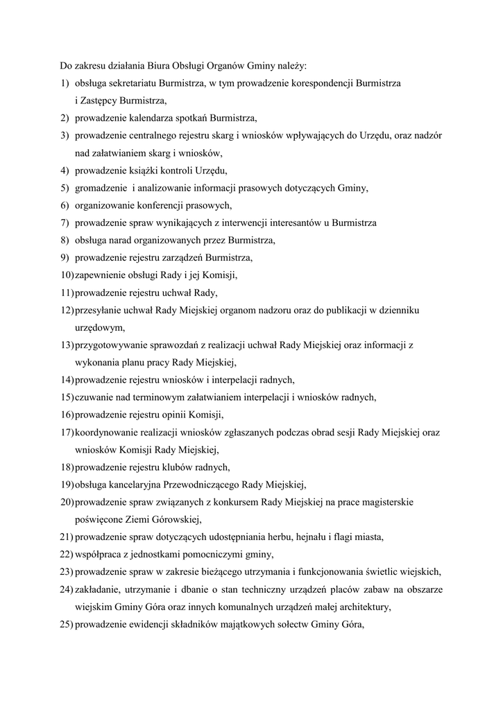Do zakresu działania Biura Obsługi Organów Gminy należy: 1) obsługa sekretariatu Burmistrza, w tym prowadzenie korespondencji Burmistrza i Zastępcy Burmistrza, 2) prowadzenie kalendarza spotkań Burmistrza, 3) prowadzenie centralnego rejestru skarg i wniosków wpływających do Urzędu, oraz nadzór nad załatwianiem skarg i wniosków, 4) prowadzenie książki kontroli Urzędu, 5) gromadzenie i analizowanie informacji prasowych dotyczących Gminy, 6) organizowanie konferencji prasowych, 7) prowadzenie spraw wynikających z interwencji interesantów u Burmistrza 8) obsługa narad organizowanych przez Burmistrza, 9) prowadzenie rejestru zarządzeń Burmistrza, 10) zapewnienie obsługi Rady i jej Komisji, 11) prowadzenie rejestru uchwał Rady, 12) przesyłanie uchwał Rady Miejskiej organom nadzoru oraz do publikacji w dzienniku urzędowym, 13) przygotowywanie sprawozdań z realizacji uchwał Rady Miejskiej oraz informacji z wykonania planu pracy Rady Miejskiej, 14) prowadzenie rejestru wniosków i interpelacji radnych, 15) czuwanie nad terminowym załatwianiem interpelacji i wniosków radnych, 16) prowadzenie rejestru opinii Komisji, 17) koordynowanie realizacji wniosków zgłaszanych podczas obrad sesji Rady Miejskiej oraz wniosków Komisji Rady Miejskiej, 18) prowadzenie rejestru klubów radnych, 19) obsługa kancelaryjna Przewodniczącego Rady Miejskiej, 20) prowadzenie spraw związanych z konkursem Rady Miejskiej na prace magisterskie poświęcone Ziemi Górowskiej, 21) prowadzenie spraw dotyczących udostępniania herbu, hejnału i flagi miasta, 22) współpraca z jednostkami pomocniczymi gminy, 23) prowadzenie spraw w zakresie bieżącego utrzymania i funkcjonowania świetlic wiejskich, 24) zakładanie, utrzymanie i dbanie o stan techniczny urządzeń placów zabaw na obszarze wiejskim Gminy Góra oraz innych komunalnych urządzeń małej architektury, 25) prowadzenie ewidencji składników majątkowych sołectw Gminy Góra, 26) prowadzenie spraw związanych z organizacją na terenie gminy wyborów, ławników ludowych do sądu i członków kolegiów do spraw wykroczeń, sołtysów i rad sołeckich oraz konsultacji społecznych, 27) prowadzenie spraw dotyczących przyznawania odznaczeń państwowych na wniosek organów gminy, a także udostępnianie wniosków w sprawie odznaczeń zainteresowanym, 28) prowadzenie spraw z zakresu przynależności gminy do stowarzyszeń oraz związków międzygminnych, 29) prowadzenie spraw dotyczących funduszu sołeckiego, a w szczególności: a) opracowywanie projektów aktów prawnych dotyczących funduszu sołeckiego, b) informowanie sołectw o wysokości funduszu sołeckiego przypadającego na dane sołectwo, c) przyjmowanie i rozpatrywanie wniosków sołectw o dofinansowanie przedsięwzięć w ramach funduszu sołeckiego, d) opracowanie projektu wydatków funduszu sołeckiego, na podstawie wniosków sołectw, e) przekazanie projektu wydatków funduszu sołeckiego Skarbnikowi celem ujęcia w projekcie budżetu gminy, f) realizacja przedsięwzięć przewidzianych w ramach funduszu sołeckiego, g) udzielanie informacji i wyjaśnień w sprawach funduszu sołeckiego i możliwości realizacji przedsięwzięć w jego ramach, h) pomoc i współpraca z sołectwami w przygotowaniu wniosku. 30) monitorowanie i informowanie o możliwościach finansowania rozwoju obszarów wiejskich. 31) prowadzenie archiwum zakładowego, 32) administrowanie budynkiem Urzędu, 33) prowadzenie ewidencji składników majątkowych Urzędu, 34) ubezpieczanie majątku Urzędu, 35) zaopatrywanie Urzędu w materiały i sprzęt biurowy, prasę, publikacje i pieczęcie, 36) zapewnianie konserwacji sprzętu biurowego, 37) dozorowanie i sprzątanie budynku Urzędu, 38) obsługa samochodu służbowego Urzędu, 39) dysponowanie samochodem służbowym Urzędu, 40) prowadzenie rozliczeń kierowcy samochodu służbowego (kart drogowych, zużycia paliwa i części, przebiegu kilometrów oraz czasu pracy kierowcy), 41) prowadzenie spraw z zakresu bhp i p.poż. Urzędu, 42) koordynowanie wykonywania nieodpłatnie kontrolowanej pracy na cele społeczne przez skazanych skierowanych przez sąd rejonowy, 43) wywieszanie w Urzędzie ogłoszeń sądowych i komorniczych, 44) utrzymanie tablic ogłoszeniowych Urzędu w mieście Góra i zamieszczanie na nich ogłoszeń urzędowych, 45) prowadzenie kancelarii Urzędu, 46) zapewnienie obsługi petenta za pośrednictwem punktu informacyjnego, do którego zadań należy: a) udzielanie informacji o funkcjonowaniu Urzędu i poszczególnych biur, b) udzielanie informacji o procedurze załatwiania spraw w Urzędzie, c) wydawanie druków wniosku-podania w celu załatwienia sprawy w Urzędzie, d) dokonywanie nieodpłatnie kserokopii dokumentów dotyczących załatwianych spraw w Urzędzie, e) poświadczanie za zgodność z oryginałem dokumentów oraz własnoręczności podpisu, f) świadczenie usług kserograficznych na rzecz pracowników Urzędu, gminnych jednostek organizacyjnych, sołtysów, g) przyjmowanie od interesantów pism (podań) do załatwienia w Urzędzie, h) udzielanie informacji teleadresowych dotyczących Urzędu oraz gminnych jednostek organizacyjnych, i) obsługa centrali telefonicznej, j) udzielanie podstawowych informacji o Gminie Góra, k) udostępnianie materiałów promocyjnych o Gminie Góra, l) otwieranie i zamykanie budynku Urzędu, m) dokonywanie obchodu Urzędu i sprawdzenie czy nie doszło do włamania i szkody w mieniu Urzędu, n) prowadzenie listy obecności pracowników Urzędu, o) prowadzenie rejestru wyjść pracowników Urzędu, p) prowadzenie ewidencji osób przebywających w Urzędzie poza godzinami pracy, q) wydawanie kluczy do pomieszczeń biurowych i gospodarczych dla pracowników Urzędu, r) przyjmowanie do przechowania w sejfie i wydawanie pracownikom Urzędu pieczęci urzędowych, s) prowadzenie apteczki Urzędu.