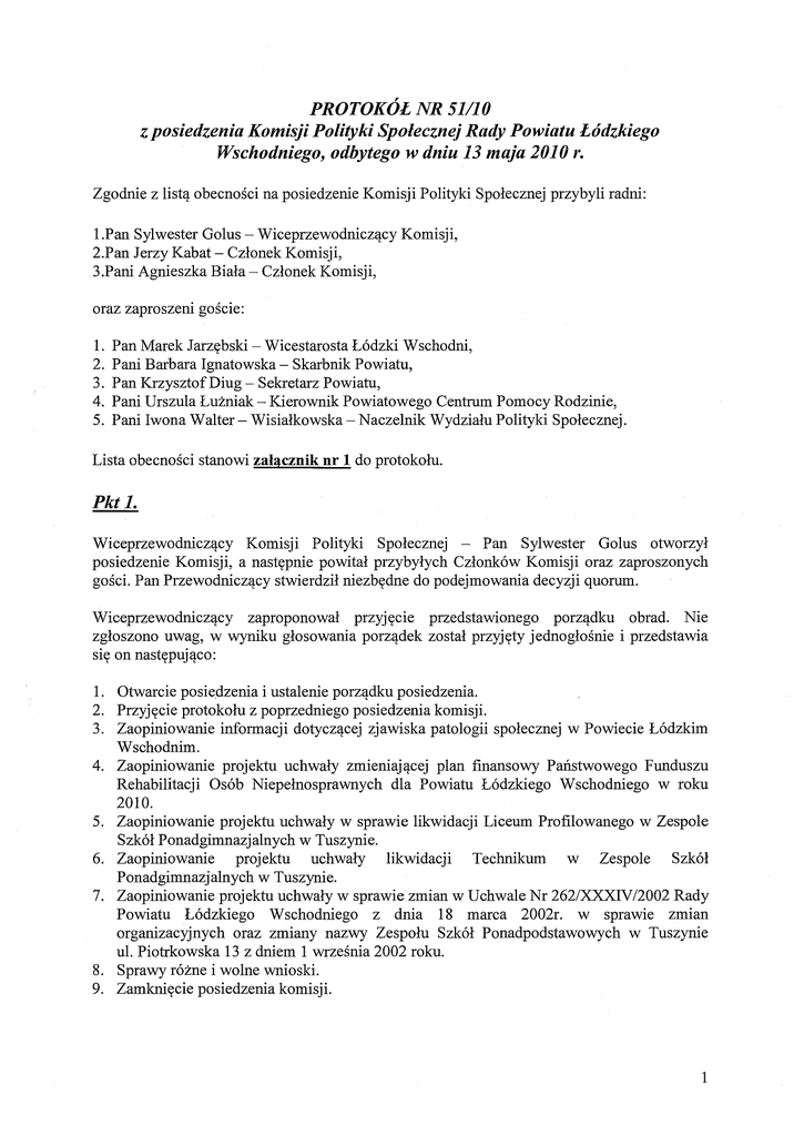 PROTOKÓŁ NR 51/10 z posiedzenia Komisji Polityki Społecznej Rady Powiatu Łódzkiego Wschodniego, odbytego w dniu 13 maja 2010 r. Zgodnie z listą obecności na posiedzenie Komisji Polityki Społecznej przybyli radni: 1.Pan Sylwester Golus - Wiceprzewodniczący Komisji, 2.Pan Jerzy Kabat - Członek Komisji, 3.Pani Agnieszka Biała - Członek Komisji, oraz zaproszeni 1. 2. 3. 4. 5. goście: Pan Marek Jarzębski - Wicestarosta Łódzki Wschodni, Pani Barbara Ignatowska - Skarbnik Powiatu, Pan Krzysztof Diug - Sekretarz Powiatu, Pani Urszula Łużniak - Kierownik Powiatowego Centrum Pomocy Rodzinie, Pani Iwona Walter - Wisiałkowska - Naczelnik Wydziału Polityki Społecznej. Lista obecności stanowi załącznik nr 1 do protokołu. Pkt 1. Wiceprzewodniczący Komisji Polityki Wiceprzewodniczący Pan Sylwester Golus otworzył posiedzenie Komisji, a następnie powitał przybyłych Członków Komisji oraz zaproszonych gości. Pan Przewodniczący stwierdził niezbędne do podejmowania decyzji quorum. zaproponował zgłoszono się uwag, w wyniku Społecznej przyjęcie - przedstawionego porządku głosowania porządek został przyjęty jednogłośnie obrad. Nie i przedstawia on następująco: 1. Otwarcie posiedzenia i ustalenie porządku posiedzenia. 2. Przyjęcie protokołu z poprzedniego posiedzenia komisji. 3. Zaopiniowanie informacji dotyczącej zjawiska patologii społecznej w Powiecie Łódzkim Wschodnim. 4. Zaopiniowanie projektu uchwały zmieniającej plan finansowy Państwowego Funduszu Rehabilitacji Osób Niepełnosprawnych dla Powiatu Łódzkiego Wschodniego w roku 2010. 5. Zaopiniowanie projektu uchwały w sprawie likwidacji Liceum Profilowanego w Zespole Szkół Ponadgimnazjalnych w Tuszynie. 6. Zaopiniowanie projektu uchwały likwidacji Technikum w Zespole Szkół Ponadgimnazjalnych w Tuszynie. 7. Zaopiniowanie projektu uchwały w sprawie zmian w Uchwale Nr 262/XXXIV12002 Rady Powiatu Łódzkiego Wschodniego z dnia 18 marca 2002r. w sprawie zmian organizacyjnych oraz zmiany nazwy Zespołu Szkół Ponadpodstawowych w Tuszynie ul. Piotrkowska 13 z dniem 1 września 2002 roku. 8. Sprawy różne i wolne wnioski. 9. Zamknięcie posiedzenia komisji. 1 Pkt 2. Wiceprzewodniczący Komisji powiedział, że protokół z poprzedniego posiedzenia Komisji do wglądu w Biurze Rady. Zapytał w związku z tym o ewentualne uwagi Członków Komisji do protokołu. Nie zgłoszono uwag i w wyniku głosowania protokół został przyjęty. był Pkt 3. Informacja dotycząca zjawiska patologii społecznej w Powiecie Łódzkim Wschodnim przedstawiona została przez Panią Urszulę Łużniak - Kierownika Powiatowego Centrum Pomocy Rodzinie (stanowi załącznik nr 2 do protokołu). Informacja została przygotowana na podstawie ankiet sporządzonych przez PCPR, a działanie to zainicjowane zostało przez Komisję Bezpieczeństwa, Ochrony Środowiska i Gospodarki. Ankiety skierowano do ośrodków pomocy społecznej, 37 szkół z terenu Powiatu i Policji. Najważniejszą informacją jest to, że w przypadku ankiet wypełnionych przez szkoły, najwięcej zachowań patologicznych można zauważyć u dzieci 11-17 lat, a także u osób w wieku 40-50 lat. Młodzież jest szczególnie narażona i podatna na takie zjawiska. Problem narkotyków jest w ankietach sygnalizowany marginalnie. Jeśli chodzi o ankiety wypełnione przez policję, na pierwszym miejscu są interwencje w pubach i na ulicach, na drugim miejscu interwencje w rodzinie. Ważne jest zapewnienie wypełnienia czasu wolnego młodzieży oraz wzmocnienie funkcji wychowawczej rodziny. Członkowie Komisji nie zgłosili uwag. Pkt 4. plan finansowy Państwowego Funduszu Rehabilitacji Osób Niepełnosprawnych dla Powiatu Łódzkiego Wschodniego w roku 2010 przedstawiła Pani Urszula Łużniak - Kierownik Powiatowego Centrum Pomocy Rodzinie. Plan finansowy ulega zmianie w części dotyczącej rehabilitacji społecznej w zadaniu dofinansowanie uczestnictwa osób niepełnosprawnych i ich opiekunów w turnusach rehabilitacyjnych. W związku z podpisanym aneksem m UDA-POKL.07.01.02-10-005/08-05 z dnia 26 kwietnia 2010 roku dotyczącym projektu "Dobry wybór - Lepsza przyszłość" środki własne, w części dotyczącej Funduszu, wynoszą 32.717,25 zł i powinny zostać ujęte w § z ostatnią liczbą ,,9". Ponieważ Rada Powiatu zabezpieczyła kwotę 36.000,00 zł. stąd proponuje się pozostałą z rozliczenia kwotę 3.282,75 zł. przenieść na dofinansowanie turnusów rehabilitacyjnych dla dzieci i młodzieży. Projekt uchwały zmieniającej Członkowie Komisji nie zgłosili uwag. W wyniku przeprowadzonego głosowania Komisja przy ilości głosów: "za" - 3, "przeciw" - O. "wstrzymuję się" - O jednogłośnie pozytywnie zaopiniowała powyższy projekt uchwały (załącznik nr 3 do protokołu). Pkt 5. Projekt uchwały w sprawie likwidacji Liceum Profilowanego w Zespole Szkół 2 Ponadgimnazjalnych w Tuszynie przedstawiła Pani Iwona Walter- Wisiałkowska - Naczelnik Wydziału Polityki Społecznej. Jak powiedziała Pani Naczelnik Dyrektor Zespołu Szkół Ponadgimnazjalnych w Tuszynie złożył wniosek dotyczący likwidacji z dniem 31 sierpnia 2010 roku Liceum Profilowanego będącego w strukturze organizacyjnej w/w Zespołu, ponieważ szkoła nie została nigdy uruchomiona. Liceum Profilowane zostało założone w 2003 roku i stanowić miało rozszerzenie oferty edukacyjnej szkół ponadgimnazjalnych na terenie Powiatu Łódzkiego Wschodniego, jednak w związku ze zbyt małą liczbą chętnych nie uruchomiono żadnego oddziału w tej szkole. W dniu 26 lutego 2010 roku na podstawie art. 59 ust. 1 ustawy o systemie oświaty Rada Powiatu Łódzkiego Wschodniego podjęła uchwałę Nr XL1X/621/2010 o zamiarze likwidacji Liceum Profilowanego w Zespole Szkół Ponadgimnazjalnych w Tuszynie o czym został powiadomiony Łódzki Kurator Oświaty i do którego zwrócono się o opinię w tej sprawie. Łódzki Kurator Oświaty pismem z dnia 3 marca 2010 roku wyraził pozytyw