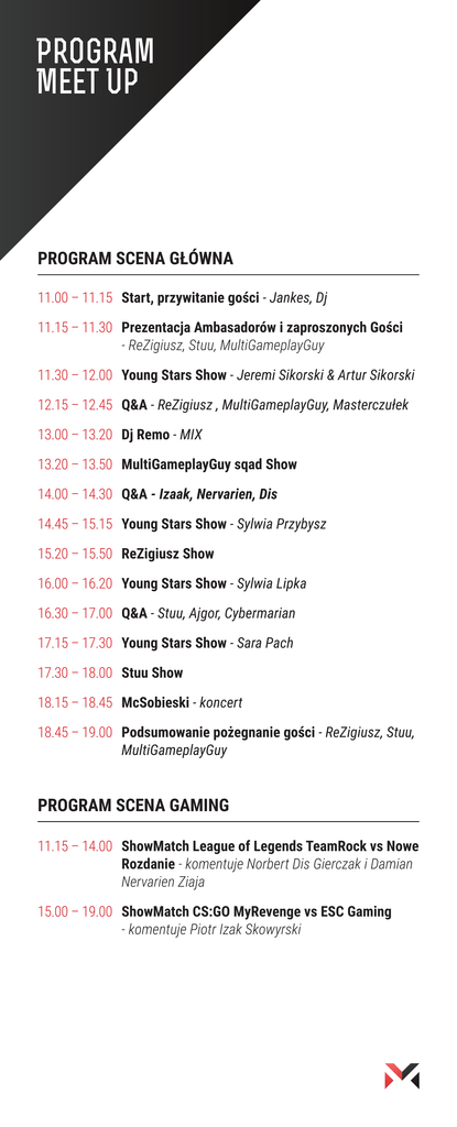 PROGRAM SCENA GŁÓWNA 11.00 – 11.15 Start, przywitanie gości - Jankes, Dj 11.15 – 11.30 Prezentacja Ambasadorów i zaproszonych Gości - ReZigiusz, Stuu, MultiGameplayGuy 11.30 – 12.00 Young Stars Show - Jeremi Sikorski & Artur Sikorski 12.15 – 12.45 Q&A - ReZigiusz , MultiGameplayGuy, Masterczułek 13.00 – 13.20 Dj Remo - MIX 13.20 – 13.50 MultiGameplayGuy sqad Show 14.00 – 14.30 Q&A - Izaak, Nervarien, Dis 14.45 – 15.15 Young Stars Show - Sylwia Przybysz 15.20 – 15.50 ReZigiusz Show 16.00 – 16.20 Young Stars Show - Sylwia Lipka 16.30 – 17.00 Q&A - Stuu, Ajgor, Cybermarian 17.15 – 17.30 Young Stars Show - Sara Pach 17.30 – 18.00 Stuu Show 18.15 – 18.45 McSobieski - koncert 18.45 – 19.00 Podsumowanie pożegnanie gości - ReZigiusz, Stuu, MultiGameplayGuy PROGRAM SCENA GAMING 11.15 – 14.00 ShowMatch League of Legends TeamRock vs Nowe Rozdanie - komentuje Norbert Dis Gierczak i Damian Nervarien Ziaja 15.00 – 19.00 ShowMatch CS:GO MyRevenge vs ESC Gaming - komentuje Piotr Izak Skowyrski