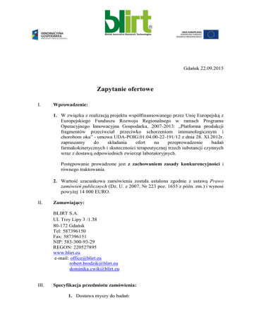 Gdańsk 22.09.2015 Zapytanie ofertowe I. Wprowadzenie: 1. W związku z realizacją projektu współfinansowanego przez Unię Europejską z Europejskiego Funduszu Rozwoju Regionalnego w ramach Programu Operacyjnego Innowacyjna Gospodarka, 2007-2013: „Platforma produkcji fragmentów przeciwciał przeciwko schorzeniom immunologicznym i chorobom oka” - umowa UDA-POIG.01.04.00-22-191/12 z dnia 28. XI.2012r. zapraszamy do składania ofert na przeprowadzenie badań farmakokinetycznych i skuteczności terapeutycznej trzech substancji czynnych wraz z dostawą odpowiednich zwierząt laboratoryjnych. Postępowanie prowadzone jest z zachowaniem zasady konkurencyjności i równego traktowania. 2. Wartość szacunkowa zamówienia została ustalona zgodnie z ustawą Prawo zamówień publicznych (Dz. U. z 2007, Nr 223 poz. 1655 z późn. zm.) i wynosi powyżej 14 000 EURO. II. Zamawiający: BLIRT S.A. Ul. Trzy Lipy 3 /1.38 80-172 Gdańsk Tel: 587396150 Fax: 587396151 NIP: 583-300-93-29 REGON: 220527895 www.blirt.eu e-mail: [email protected] [email protected] [email protected] III. Specyfikacja przedmiotu zamówienia: 1. Dostawa myszy do badań: a) Myszy BALB/c: 150 samic w wieku 6-8 tygodni wraz z transportem. b) Myszy bezgrasicze BALB/c nu/nu (Fox1nu): 70 samic w wieku 6-8 tygodni wraz z transportem. 2. Usługa badawcza z wykorzystaniem zwierząt na którą składa się: a) Badania toksyczności ostrej Parametry: - ilość substancji: 5; - ilość podań dożylnych: 4 dawki; - liczba zwierząt: 60 myszy BALB/c. b) Badania farmakokinetyczne Parametry: - ilość substancji: 3; - punkty czasowe (pobranie krwi): 5 min., 15 min., 30 min., 60 min., 6h, 1d, 2d, 3d, 4d, 5d; - myszy w grupie – 5; - liczba zwierząt: 90 myszy BALB/c. c) Badania skuteczności terapeutycznej Parametry: - ilość substancji: 3; - ilość substancji kontrolnych: 3; - grupa placebo; - iniekcja podskórna komórek nowotworowych: HCT116; - liczba iniekcji dożylnych substancji badanych: 5; - liczba myszy w grupie: 10; - liczba zwierząt: 70 myszy bezgrasicze BALB nu/nu. Oferent powinien posiadać odpowiednie zaplecze techniczne do pracy ze zwierzętami w standardzie SPF oraz hodowli komórkowych. Pobrane w badaniach próbki zostaną zamrożone w -80°C do dalszej analizy i przesłane do Zleceniodawcy. Zamawiający dopuszcza możliwość składania ofert częściowych w zakresie III.1 i III.2. IV. Sposób przygotowania oferty: 1. Złożona oferta powinna zawierać: a. nazwę i adres oferenta b. opis nawiązujący do elementów wyszczególnionych w zapytaniu ofertowym c. wartość oferty (netto oraz brutto) z podaniem ceny d. maksymalny czas realizacji, e. warunki płatności i dostawy, f. termin ważności oferty. 2. Oferta powinna zawierać również inne, dodatkowe informacje, np.: a. dodatkowe funkcje dostawy, b. szczegółowy kosztorys ofertowy itd. 3. Oferta powinna być sporządzona na papierze firmowym oferenta lub opatrzona pieczątką firmową, posiadać datę sporządzenia. Oferta powinna być podpisana przez oferenta Wykaz oświadczeń lub dokumentów, jakie muszą dostarczyć wykonawcy: V. 1. pisemne oświadczenie oferenta o tym, że posiada niezbędną wiedzę, doświadczenie potencjał techniczny zdolny do wykonania zamówienia oraz, że znajduje się w sytuacji ekonomicznej i finansowej zapewniającej wykonanie zamówienia Zapytania o przedmiot zamówienia: VI. 1. Wszelkich informacji dotyczących przedmiotu zamówienia udziela Pan Robert Brodzik Tel: +48 661 601 005 e-mail: [email protected] VII. Miejsce i termin złożenia oferty: 1. Termin składania ofert mija dnia 29.09.2015r. Oferta może być przesłana za pośrednictwem poczty elektronicznej na adres: [email protected], [email protected], [email protected]; faksem na nr: 587396151, pocztą, przesyłką kurierską lub też dostarczona osobiście na adres: BLIRT S.A. pokój 93 Ul. Kładki 24 80-822 Gdańsk wraz z załączonymi dokumentami wymienionymi w punkcie V. 2. Zapytanie ofertowe zamieszczono na stronie: www.blirt.eu VIII. Wybór najkorzystniejszej oferty nastąpi w oparciu o następujące kryteria: 1. Cena max 100 pkt 2. Termin realizacji zamówienia max 20 pkt IX. Termin realizacji zamówienia: 1. Dostawa myszy - do dnia 31.10.2015r 2. Usługa badawcza z udziałem zwierząt - do dnia 15.12.2015r X. Pozostałe informacje: Zamawiający zastrzega sobie prawo do zmiany warunków udzielenia zamówienia oraz do unieważnienia zapytania w każdym momencie bez podania przyczyn.