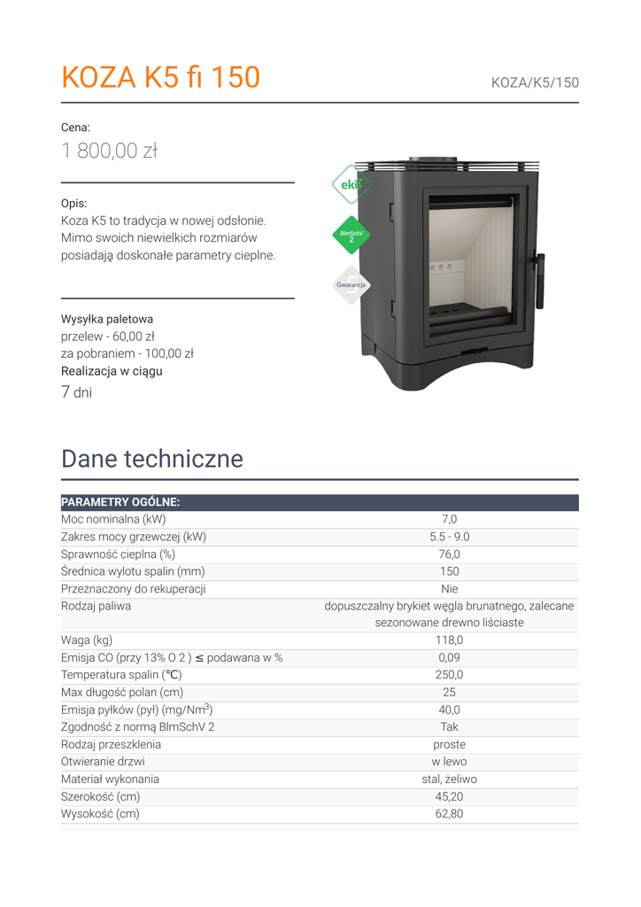 KOZA K5 150 KOZA/K5/150 Cena: 1 800,00 zł Opis: Koza K5 to tradycja w nowej odsłonie. Mimo swoich niewielkich rozmiarów posiadają doskonałe parametry cieplne. Wysyłka paletowa przelew - 60,00 zł za pobraniem - 100,00 zł Realizacja w ciągu 7 dni Dane techniczne PARAMETRY OGÓLNE: Moc nominalna (kW) Zakres mocy grzewczej (kW) Sprawność cieplna (%) Średnica wylotu spalin (mm) Przeznaczony do rekuperacji Rodzaj paliwa Waga (kg) Emisja CO (przy 13% O 2 ) ≤ podawana w % 7,0 5.5 - 9.0 76,0 150 Nie dopuszczalny brykiet węgla brunatnego, zalecane sezonowane drewno liściaste 118,0 0,09 Temperatura spalin (℃) Max długość polan (cm) 250,0 25 Emisja pyłków (pył) (mg/Nm3) Zgodność z normą BlmSchV 2 40,0 Tak Rodzaj przeszklenia Otwieranie drzwi Materiał wykonania Szerokość (cm) Wysokość (cm) proste w lewo stal, żeliwo 45,20 62,80 Głębokość (cm) 40,60 Dolot powietrza Wyłożenie komory spalania Nie Tak Popielnik Ozdobna szyba typu glass Tak Nie ASDP - automatyczne sterowanie dopływem powietrza Turbina TURBOFAN Nie Panel wodny Nie Nie Zalety MAKSYMALNE WYKORZYSTANIE ENERGII Maksymalne wykorzystanie ciepła i bezawaryjne działanie dzięki ściankom paleniska wykonanym z wysokiej jakości żeliwa o grubości 8 mm. Dopalanie cząstek opału dzięki de ektorowi, który wydłuża drogę spalin. Regulacja dolotu powietrza odpowiedającego za intensywność spalania za pomocą pojedynczego regulatora znajdującego się poniżej drzwi pieca. Potrójny system dopowietrzenia komory spalania: powietrze pierwotne - doprowadzone pod ruszt; powietrze wtórne dostarczane jest otworami w tylnej ścianie. Dodatkowo we wkładzie zastosowany jest system czystej szyby (kurtyna powietrza). Efektywne spalanie i dłuższe utrzymywanie temperatury, dzięki wyłożeniu komory spalania Acumotte - materiałem akumulującym ciepło, który podwyższa temperaturę w komorze paleniska. BEZPIECZEŃSTWO NA NAJWYŻSZYM POZIOMIE Klasyczny front wkładu wyposażony w ceramikę żaroodporną wytrzymującą temperaturę do 800°C. Ozdobny płotek ułatwia utrzymanie czystości użytkowania oraz zabezpiecza przed wypadaniem drewna. WYGODNE UŻYTKOWANIE Wyjmowany ruszt i popielnik ułatwiają utrzymanie wkładu w czystości. Ograniczenie osadzania sadzy dzięki systemowi czystej szyby (kierownica powietrza). Precyzyjne wypoziomowanie poprzez regulowane nóżki (w zakresie do 40 mm). Elegancka i wygodna klamka. Możliwość zastosowania w różnych warunkach montażowych, dzięki regulowanemu wylotowi spalin: z tyłu lub na górze pieca (przy montażu wylotu z tyłu pieca wymagany jest zakup zaślepki płyty górnej). Gwarancja 5 lat. Rysunek techniczny Opcje dodatkowe Zaślepka do KOZY K5 20,00 zł Zaślepka płyty górnej do pieców wolnostojących KOZA K5, wymagana w przypadku montażu wylotu spalin z tyłu pieca. Zwrot Klient będący Konsumentem, który zawarł Umowę sprzedaży, może w terminie 14 dni odstąpić od niej bez podawania przyczyny. Bieg terminu na odstąpienie od Umowy sprzedaży rozpoczyna się od chwili objęcia Towaru w posiadanie przez Klienta lub wskazaną przez niego osobę trzecią inną niż przewoźnik. Oświadczenie można złożyć na formularzu, którego wzór został zamieszczony przez Sprzedawcę na Stronie Internetowej Sklepu pod adresem: formularz odstąpienia. Kratki.pl Marek Bal ul. W. Gombrowicza 4 26-660 Wsola/Jedlińsk www.kratki.com tel. 48 340 10 00 Data publikacji: 01.02.2017