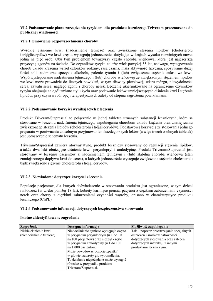 VI.2 Podsumowanie planu zarządzania ryzykiem dla produktu leczniczego Triveram przeznaczone do publicznej wiadomości VI.2.1 Omówienie rozpowszechnienia choroby Wysokie ciśnienie krwi (nadciśnienie tętnicze) oraz zwiększone stężenia lipidów (cholesterolu i trójglicerydów) we krwi często występują jednocześnie, dotykając w krajach wysoko rozwiniętych nawet jedną na pięć osób. Obu tym problemom towarzyszy często choroba wieńcowa, która jest najczęstszą przyczyną zgonów na świecie. Do czynników ryzyka należą: wiek powyżej 55 lat, nadwaga, występowanie chorób układu krążenia wśród członków rodziny, rasa czarna, mała aktywność fizyczna, spożywanie dużej ilości soli, nadmierne spożycie alkoholu, palenie tytoniu i (lub) zwiększone stężenie cukru we krwi. Współwystępowanie nadciśnienia tętniczego i (lub) choroby wieńcowej ze zwiększonym stężeniem lipidów we krwi może prowadzić do licznych powikłań, w tym dławicy piersiowej, udaru mózgu, niewydolności serca, zawału serca, nagłego zgonu i choroby nerek. Leczenie ukierunkowane na ograniczenie czynników ryzyka obejmuje na ogół zmianę stylu życia oraz podawanie leków zmniejszających ciśnienie krwi i stężenie lipidów, przy czym wybór opcji terapeutycznych zależy od stopnia zagrożenia powikłaniami. VI.2.2 Podsumowanie korzyści wynikających z leczenia Produkt Triveram/Stapressial to połączenie w jednej tabletce uznanych substancji leczniczych, które są stosowane w leczeniu nadciśnienia tętniczego, zapobieganiu chorobom układu krążenia oraz zmniejszaniu zwiększonego stężenia lipidów (cholesterolu i trójglicerydów). Podstawową korzyścią ze stosowania jednego preparatu w porównaniu z osobnym przyjmowaniem każdego z tych leków (a więc trzech osobnych tabletek) jest uproszczenie schematu leczenia. Triveram/Stapressial zawiera atorwastatynę, produkt leczniczy stosowany do regulacji stężenia lipidów, a także dwa leki obniżające ciśnienie krwi: peryndopryl i amlodypinę. Produkt Triveram/Stapressial jest stosowany w leczeniu pacjentów z nadciśnieniem tętniczym i (lub) stabilną chorobą wieńcową (stan zmniejszonego dopływu krwi do serca), u których jednocześnie występuje zwiększone stężenie cholesterolu bądź zwiększone stężenie cholesterolu i trójglicerydów. VI.2.3. Niewiadome dotyczące korzyści z leczenia Populacje pacjentów, dla których doświadczenie w stosowaniu produktu jest ograniczone, w tym dzieci i młodzież (w wieku poniżej 18 lat), kobiety karmiące piersią, pacjenci z ciężkimi zaburzeniami czynności nerek oraz chorzy z ciężkimi zaburzeniami czynności wątroby, opisano w charakterystyce produktu leczniczego (ChPL). VI.2.4 Podsumowanie informacji dotyczących bezpieczeństwa stosowania Istotne zidentyfikowane zagrożenia Zagrożenie Niskie ciśnienie krwi (niedociśnienie tętnicze) Dostępne informacje Niedociśnienie tętnicze występuje często w przypadku peryndoprylu (u 1 do 10 na 100 pacjentów) oraz niezbyt często w przypadku amlodypiny (u 1 do 100 na 1 000 pacjentów). Może powodować uczucie „pustki” w głowie, zawroty głowy, omdlenia. To działanie niepożądane może wystąpić również w przypadku produktu Triveram/Stapressial. Możliwość zapobiegania Tak – poprzez przestrzeganie specjalnych ostrzeżeń i środków ostrożności dotyczących stosowania oraz zaleceń dotyczących interakcji z innymi produktami leczniczymi. 1/5 Zwiększone stężenie potasu we krwi (hiperkaliemia) Obrzęk powiek, twarzy, warg, języka lub gardła, mogące powodować duże trudności w oddychaniu (obrzęk naczynioruchowy)/ nadwrażliwość Zwiększone stężenie potasu we krwi występuje niezbyt często w przypadku peryndoprylu (u 1 do 10 na 1 000 pacjentów). Może powodować ciężkie arytmie, niekiedy zakończone zgonem. To działanie niepożądane może wystąpić również w przypadku produktu Triveram/Stapressial. Obrzęk powiek, twarzy, warg, języka lub gardła występuje niezbyt często w przypadku peryndoprylu (u 1 do 10 na 1 000 pacjentów), a rzadko w przypadku atorwastatyny (u mniej niż 1 na 1 000 pacjentów) i bardzo rzadko w przypadku amlodypiny (u mniej niż 1 na 10 000 pacjentów). To działanie niepożądane może wystąpić również w przypadku produktu Triveram/Stapressial. Zmiany parametrów krwi, Zaburzenia składu krwi występują bardzo np. zmniejszenie liczby krwinek rzadko w przypadku peryndoprylu białych lub płytek krwi i amlodypiny (u mniej niż 1 na 10 000 (neutropenia/agranulocytoza/ pacjentów), a rzadko w przypadku trombocytopenia) atorwastatyny (u mniej niż 1 na 1 000 pacjentów). Te działania niepożądane mogą wystąpić również w przypadku produktu Triveram/Stapressial. Działanie fetotoksyczne i embriotoksyczne produktu Triveram/Stapressial w przypadku stosowania w czasie ciąży W przypadku stosowania w czasie ciąży, Triveram/Stapressial może mieć ciężkie szkodliwe działanie na zarodek i płód. Tak – poprzez przestrzeganie specjalnych ostrzeżeń i środków ostrożności dotyczących stosowania oraz zaleceń dotyczących interakcji z innymi produktami leczniczymi. Tak – poprzez monitorowanie wczesnych objawów oraz przestrzeganie przeciwwskazań do stosowania produktu Triveram/Stapressial u pacjentów z obrzękiem naczynioruchowym w wywiadzie, związanym z uprzednim leczeniem inhibitorami konwertazy angiotensyny (ACE), a także u chorych z wrodzonym lub idiopatycznym obrzękiem naczynioruchowym. W przypadku wystąpienia obrzęku, należy natychmiast przerwać leczenie, a chory powinien niezwłocznie skonsultować się z lekarzem. U pacjentów, u których wystąpił obrzęk, nie należy w przyszłości wznawiać leczenia produktem Triveram/Stapressial. Tak – poprzez przestrzeganie specjalnych ostrzeżeń i środków ostrożności dotyczących stosowania. Triveram/Stapressial powinien być stosowany ze szczególną ostrożnością u pacjent