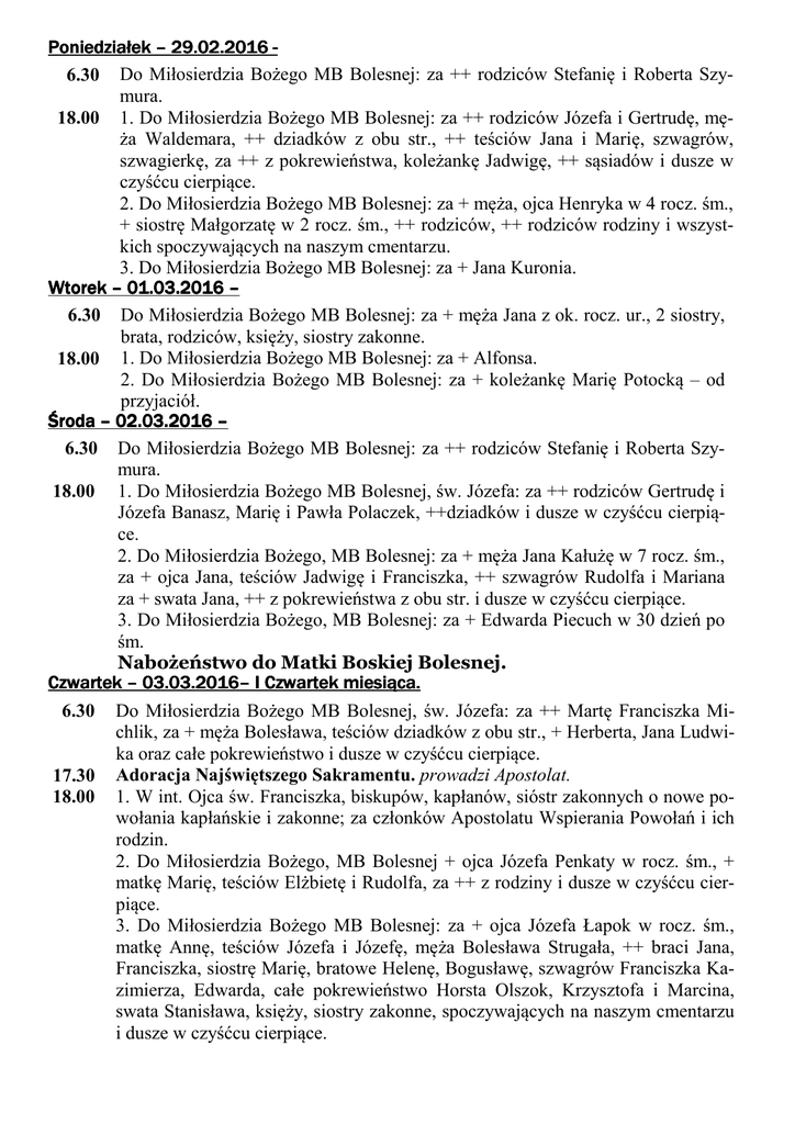 Poniedziałek – 29.02. 29.02.2016 6.30 Do Miłosierdzia Bożego MB Bolesnej: za ++ rodziców Stefanię i Roberta Szymura. 18.00 1. Do Miłosierdzia Bożego MB Bolesnej: za ++ rodziców Józefa i Gertrudę, męża Waldemara, ++ dziadków z obu str., ++ teściów Jana i Marię, szwagrów, szwagierkę, za ++ z pokrewieństwa, koleżankę Jadwigę, ++ sąsiadów i dusze w czyśćcu cierpiące. 2. Do Miłosierdzia Bożego MB Bolesnej: za + męża, ojca Henryka w 4 rocz. śm., + siostrę Małgorzatę w 2 rocz. śm., ++ rodziców, ++ rodziców rodziny i wszystkich spoczywających na naszym cmentarzu. 3. Do Miłosierdzia Bożego MB Bolesnej: za + Jana Kuronia. Wtorek Wtorek – 01.03 01.03.2016 .03.2016 – 6.30 Do Miłosierdzia Bożego MB Bolesnej: za + męża Jana z ok. rocz. ur., 2 siostry, brata, rodziców, księży, siostry zakonne. 18.00 1. Do Miłosierdzia Bożego MB Bolesnej: za + Alfonsa. 2. Do Miłosierdzia Bożego MB Bolesnej: za + koleżankę Marię Potocką – od przyjaciół. Środa – 02.03 02.03.2016 .03.2016 – 6.30 Do Miłosierdzia Bożego MB Bolesnej: za ++ rodziców Stefanię i Roberta Szymura. 18.00 1. Do Miłosierdzia Bożego MB Bolesnej, św. Józefa: za ++ rodziców Gertrudę i Józefa Banasz, Marię i Pawła Polaczek, ++dziadków i dusze w czyśćcu cierpiące. 2. Do Miłosierdzia Bożego, MB Bolesnej: za + męża Jana Kałużę w 7 rocz. śm., za + ojca Jana, teściów Jadwigę i Franciszka, ++ szwagrów Rudolfa i Mariana za + swata Jana, ++ z pokrewieństwa z obu str. i dusze w czyśćcu cierpiące. 3. Do Miłosierdzia Bożego, MB Bolesnej: za + Edwarda Piecuch w 30 dzień po śm. Nabożeństwo do Matki Boskiej Bolesnej. Czwartek – 03.03 03.03.2016 .03.2016– .2016– I Czwartek miesiąca. 6.30 17.30 18.00 Do Miłosierdzia Bożego MB Bolesnej, św. Józefa: za ++ Martę Franciszka Michlik, za + męża Bolesława, teściów dziadków z obu str., + Herberta, Jana Ludwika oraz całe pokrewieństwo i dusze w czyśćcu cierpiące. Adoracja Najświętszego Sakramentu. prowadzi Apostolat. 1. W int. Ojca św. Franciszka, biskupów, kapłanów, sióstr zakonnych o nowe powołania kapłańskie i zakonne; za członków Apostolatu Wspierania Powołań i ich rodzin. 2. Do Miłosierdzia Bożego, MB Bolesnej + ojca Józefa Penkaty w rocz. śm., + matkę Marię, teściów Elżbietę i Rudolfa, za ++ z rodziny i dusze w czyśćcu cierpiące. 3. Do Miłosierdzia Bożego MB Bolesnej: za + ojca Józefa Łapok w rocz. śm., matkę Annę, teściów Józefa i Józefę, męża Bolesława Strugała, ++ braci Jana, Franciszka, siostrę Marię, bratowe Helenę, Bogusławę, szwagrów Franciszka Kazimierza, Edwarda, całe pokrewieństwo Horsta Olszok, Krzysztofa i Marcina, swata Stanisława, księży, siostry zakonne, spoczywających na naszym cmentarzu i dusze w czyśćcu cierpiące. Piątek – 04.03 04.03.2016 .03.2016 – I Piątek miesiąca. 8.00 Różaniec 8.30 1. W intencjach wynagradzających Sercu Bożemu. 2. Za + ks. proboszcza Benona Drzezgę w 71 rocz. śm. Nabożeństwo do Najświętszego Serca Pana Jezusa. 15.30 Koronka do Miłosierdzia Bożego i MB Siedmiobolesnej. 16.30 Droga Krzyżowa z udziałem dzieci. 17.00 1. Do Miłosierdzia Bożego MB Bolesnej: za + ojca Romana w rocz. śm., , ++ z pokrewieństwa i dusze w czyśćcu cierpiące. 2. Do Anioła Stróża o Boże błogosławieństwo, opiekę dla Karola w 2 urodziny i Boże błogosławieństwo dla całej rodziny. 3. Do Miłosierdzia Bożego MB Bolesnej: za + męża, ojca i dziadka. 17.30 Nabożeństwo Drogi Krzyżowej i Nabożeństwo do Serca Pana Jezusa. 19.00 Msza młodzieżowa: intencja wolna. Sobota – 05.03.2 05.03.2016 .03.2016– 016– I Sobota miesiąca. 6.30 Za wstawiennictwem NMP. w int. członków Żywego Różańca. Nabożeństwo do Niepokalanego Serca NMP. 15.00 Do Opatrzności Bożej, MB Nieustającej Pomocy z podziękowaniem za odebrane łaski z prośbą o Boże błogosławieństwo, zdrowie i opiekę, dary Ducha Świętego dla córki Sandry z ok. 18 urodzin. 18.00 1. Do Miłosierdzia Bożego MB Bolesnej: za + Marię Piegza w 1 rocz. śm. 2. Do Miłosierdzia Bożego MB Bolesnej: za ++ rodziców Gertrudę Teodora, męża Kazimierza, teściów Annę Grzegorza, siostry Bronisławę Elżbietę, brata Pawła, za ++ z obu str. i dusze w czyśćcu cierpiące. 3. Do Miłosierdzia Bożego MB Bolesnej: za + Edmunda Sperling w rocz. śm. i jego żonę Martę. Niedziela Niedziela – 06.03.2 06.03.2016 .03.2016 – III Niedziela Wielkiego Postu. Postu. 6.30 Intencja wolna. 8.00 Do Miłosierdzia Bożego, MB Bolesnej: za + męża Władysława w 39 rocz. śm., teściów Marię i Michała, rodziców Stanisławę i Władysława, za ++ z pokrewieństwa i dusze w czyśćcu cierpiące. 9.30 Do Miłosierdzia Bożego MB Bolesnej: za ++ rodziców Roberta i Franciszkę, ++ dzieci, za ++ z pokrewieństwa z obu str. 11.00 1. Do Opatrzności Bożej, MB Nieustającej Pomocy dziękując Bogu i MB za dar życia wnuczki Kamili Telenga z ok. 18 urodzin prosząc o zdrowie na dalsze lata życia, dary Ducha Świętego, mądrości Bożej w dorosłym życiu, opiekę Bożą, błogosławieństwo dla jej rodziców i całej rodziny 2. Do Miłosierdzia Bożego MB Bolesnej: za + żonę w 60 rocz. ur. 15.00 Intencja wolna. 16.00 Gorzkie Żale z kazaniem pasyjnym. 19.00 Do Opatrzności Bożej, MB Nieustającej Pomocy z podziękowaniem za odebrane łaski z prośbą o Boże błogosławieństwo, zdrowie i opiekę, dary Ducha Świętego dla Grzegorza z ok. urodzin oraz o błogosławieństwo dla całej rodziny
