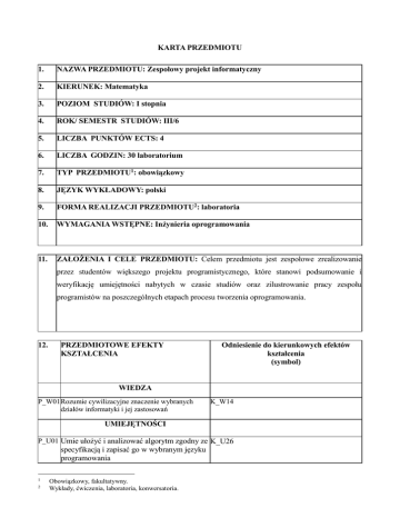 KARTA PRZEDMIOTU 1. NAZWA PRZEDMIOTU: Zespołowy projekt informatyczny 2. KIERUNEK: Matematyka 3. POZIOM STUDIÓW: I stopnia 4. ROK/ SEMESTR STUDIÓW: III/6 5. LICZBA PUNKTÓW ECTS: 4 6. LICZBA GODZIN: 30 laboratorium 7. TYP PRZEDMIOTU1: obowiązkowy 8. JĘZYK WYKŁADOWY: polski 9. FORMA REALIZACJI PRZEDMIOTU2: laboratoria 10. WYMAGANIA WSTĘPNE: Inżynieria oprogramowania 11. ZAŁOŻENIA I CELE PRZEDMIOTU: Celem przedmiotu jest zespołowe zrealizowanie przez studentów większego projektu programistycznego, które stanowi podsumowanie i weryfikację umiejętności nabytych w czasie studiów oraz zilustrowanie pracy zespołu programistów na poszczególnych etapach procesu tworzenia oprogramowania. 12. PRZEDMIOTOWE EFEKTY KSZTAŁCENIA Odniesienie do kierunkowych efektów kształcenia (symbol) WIEDZA P_W01 Rozumie cywilizacyjne znaczenie wybranych działów informatyki i jej zastosowań K_W14 UMIEJĘTNOŚCI P_U01 Umie ułożyć i analizować algorytm zgodny ze K_U26 specyfikacją i zapisać go w wybranym języku programowania 1 2 Obowiązkowy, fakultatywny. Wykłady, ćwiczenia, laboratoria, konwersatoria. P_U02 Potrafi skompilować, uruchomić i testować K_U27 napisany samodzielnie program komputerowy KOMPETENCJE SPOŁECZNE P_K01 Ma świadomość ograniczenia własnej wiedzy i K_K01 rozumie potrzebę dokształcania się. P_K02 Potrafi precyzyjnie formułować pytania K_K02 służące pogłębieniu własnej wiedzy dotyczącej przedmiotu lub odnalezieniu brakujących elementów rozumowania. P_K03 Potrafi pracować zespołowo oraz rozumie K_K03 konieczność systematycznej pracy nad wszelkimi projektami, które mają długofalowy charakter. 13. METODY OCENY EFEKTÓW KSZTAŁCENIA Symbol przedmiotowego efektu kształcenia P_W01, P_U01, P_U02 P_W01, P_U01, Metody (sposoby) oceny3 Typ oceny4 Ocenianie ciągłe (praca przy Formująca komputerze) Podsumowująca Kurs przedmiotu na Cztery prace domowe P_U02 P_K01, P_K02, P_K03 Forma dokumentacji platformie Moodle Ocenianie ciągłe (praca przy Formująca komputerze), kontrola obecności 14. KRYTERIA OCENY OSIĄGNIĘTYCH EFEKTÓW KSZTAŁCENIA (opisowe, procentowe, punktowe, inne ……………………………. formy oceny do wyboru przez wykładowcę) EFEKTY NA OCENĘ KSZTAŁCENIA 3,0 P_W01, P_U01, 50%-59% P_U02 punktów z 3 4 NA OCENĘ 3,5 60%-69% punktów z NA OCENĘ 4.0 70%-79% punktów z NA OCENĘ 4,5 80%-89% punktów z NA OCENĘ 5,0 90%-100% punktów z Ocenianie ciągłe (bieżące przygotowanie do zajęć), śródsemestralne zaliczenie pisemne, śródsemestralne zaliczenie ustne, końcowe zaliczenia pisemne, końcowe zaliczenia ustne, egzamin pisemny, egzamin ustny, praca semestralna, ocena umiejętności ruchowych, praca dyplomowa, projekt, kontrola obecności Formująca, podsumowująca. P_K01, P_K02, P_K03 czterech prac domowych Student rzadko zadaje pytania czterech prac domowych Student czasami zadaje pytania czterech prac domowych Student często zadaje pytania czterech prac domowych Student często zadaje pytania i odnajduje brakujące elementy rozumowania czterech prac domowych Student często zadaje pytania i odnajduje brakujące elementy rozumowania oraz potrafi wyjaśnić je pozostałym studentom 15. WARUNKI UZYSKANIA ZALICZENIA PRZEDMIOTU: X 16. Osiągnięcie założonych efektów kształcenia i pozytywny wynik zaliczenia egzaminu pisemnego egzaminu ustnego egzaminu praktycznego egzaminu końcowego czterech prac domowych TREŚCI PROGRAMOWE Treść zajęć Forma zajęć5 (liczba godz.) Symbol przedmiotowych efektów kształcenia Wykłady 1. Omówienie specyfiki pracy zespołu tworzącego oprogramowanie. Specyfikacja wymagań użytkownika. 6 P_W01 2. Zasady tworzenia dokumentacji projektowej. 4 P_W01, P_U01, P_U02 3. Faza implementacji wraz tworzeniem dokumentacji technicznej oraz użytkownika. Tworzenie i realizacji strategii testów oprogramowania. Ogólne zasady wdrażania oprogramowania. 14 P_U01, P_U02 6 P_W01, P_U01, P_U02 4. Ćwiczenia 1. Omówienie specyfiki pracy zespołu tworzącego oprogramowanie. Specyfikacja wymagań użytkownika. 6 P_W01 2. Zasady tworzenia dokumentacji projektowej. 4 P_W01, P_U01, P_U02 3. Faza implementacji wraz tworzeniem dokumentacji technicznej oraz użytkownika. Tworzenie i realizacji strategii testów oprogramowania. 14 P_U01, P_U02 5 Wykłady, ćwiczenia, laboratoria, samodzielne prowadzenie zajęć przez studenta. 4. 17. Ogólne zasady wdrażania oprogramowania. 6 P_W01, P_U01, P_U02 METODY DYDAKTYCZNE: 1. Ćwiczenia z wykorzystaniem komputera. 2. Wykorzystanie platformy e-learningowej Moodle. 3. Konsultacje. 18. LITERATURA PODSTAWOWA I UZUPEŁNIAJĄCA6: 1. Ś. Ząbek: Strukturalne techniki programowania, Wydawnictwo UMCS 2005. 2. I. Sommerville: Inżynieria oprogramowania, WNT 2003. 3. J. Górski: Inżynieria oprogramowania w projekcie informatycznym, MIKOM, 2000. 4. M. Flasiński: Zarządzanie projektami informatycznymi, PWN, 2006. 5. Z. Szyjewski: Zarządzanie projektami informatycznymi, PLACET, 2001. 6. A. Bochenek, P. Rajca, J. Senczyk: Eclipse. Podręcznik programisty, Helion, 2004. 7. J. Ferguson Smart: Java. Praktyczne narzędzia, Helion, 2009. 8. D. Spinellis: Czytanie kodu. Punkt widzenia twórców oprogramowania open source, Helion, 2004. 19. OBCIĄŻENIE PRACĄ STUDENTA Forma aktywności Rodzaj zajęć b) Realizacja przedmiotu: ćwiczenia c) Realizacja przedmiotu: laboratoria d) Egzamin e) Godziny kontaktowe nauczycielem f) Sprawdzian śródsemestralny g) Sprawdzian końcowy Łączna liczba godzin zajęć realizowanych z udziałem prowadzącego (pkt. a +b + c + d + e…) z Zajęcia wymagające udziału prowadzącego a) Realizacja przedmiotu: wykłady h) Przygotowanie się do zajęć S a m o k s z t a ł c e n i e 6 Dostępna w czytelni, bibliotece, Internecie. Liczba godzin na zrealizowanie aktywności w semestrze 30 45 75 15 c) a) b) i) Przygotowanie się do zaliczeń/kolokwiów j) Przygotowanie się do egzaminu/zaliczenia k) Wykonanie zadań poza uczelnią końcowego 30 l) …