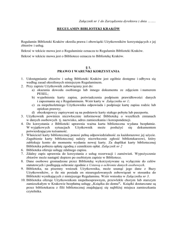 Załącznik nr 1 do Zarządzenia dyrektora z dnia …….. REGULAMIN BIBLIOTEKI KRAKÓW Regulamin Biblioteki Kraków określa prawa i obowiązki Użytkowników korzystających z jej zbiorów i usług. Ilekroć w tekście mowa jest o Regulaminie oznacza to Regulamin Biblioteki Kraków. Ilekroć w tekście mowa jest o Bibliotece oznacza to Bibliotekę Kraków. § 1. PRAWO I WARUNKI KORZYSTANIA 1. Udostępnianie zbiorów i usług Biblioteki Kraków jest ogólnie dostępne i odbywa się według zasad określonych niniejszym Regulaminem. 2. Przy zapisie Użytkownik zobowiązany jest do: a) okazania dowodu osobistego lub innego dokumentu ze zdjęciem i numerem PESEL; b) wypełnienia karty zapisu, poświadczenia podpisem prawidłowości danych i zapoznania się z Regulaminem. Wzór karty w Załączniku nr 1; c) za niepełnoletniego Użytkownika odpowiada i podpisuje kartę zapisu rodzic lub opiekun prawny; d) obcokrajowcy zapisywani są na podstawie karty stałego pobytu lub paszportu. 3. Użytkownik powinien niezwłocznie informować Bibliotekę o wszelkich zmianach w danych osobowych tj. nazwisko, adres zamieszkania i korespondencji. 4. Do korzystania z Biblioteki uprawnia ważna karta biblioteczna wydana bezpłatnie. W wyjątkowych sytuacjach Użytkownik może posłużyć się dokumentem potwierdzającym tożsamość. 5. Właściciel karty bibliotecznej ponosi pełną odpowiedzialność za każdorazowe jej użycie. Zagubienie karty bibliotecznej należy niezwłocznie zgłosić bibliotekarzowi, który zablokuje konto do momentu wydania nowej karty. Za duplikat karty bibliotecznej Biblioteka pobiera opłatę zgodną z cennikiem opłat. Załącznik nr 2 6. Biblioteka oferuje usługę zdalnego zapisu. 7. Zdalny zapis uprawnia do korzystania z usług rezerwacji i zamówień. Wypożyczenie zbiorów może nastąpić dopiero po osobistym zapisie w Bibliotece. 8. Dane osobowe gromadzone przez Bibliotekę wykorzystywane są wyłącznie do celów statutowych i podlegają ochronie zgodnie z Ustawą o ochronie danych osobowych. 9. Biblioteka, na pisemny wniosek Użytkownika, może usunąć jego dane z Bazy Użytkowników, o ile nie posiada on nieuregulowanych zobowiązań w stosunku do Biblioteki wynikających z niniejszego Regulaminu. Wzór wniosku w Załączniku nr 3. 10. Biblioteka oferuje Użytkownikom niepełnosprawnym, przewlekle chorym lub starszym zamieszkałym w Krakowie bezpłatną usługę „Książka do domu”. Książki dostarczane są przez bibliotekarza z filii bibliotecznej znajdującej się najbliżej miejsca zamieszkania czytelnika. § 2. WYPOŻYCZENIA 1. Z jednej filii jednorazowo można wypożyczyć 5 dokumentów bibliotecznych. W przypadku korzystania z usług kilku filii Użytkownik może wypożyczyć maksymalnie 15 dokumentów. 2. Materiały biblioteczne wypożycza się na okres 31 dni. 3. Użytkownik ma prawo do trzykrotnej prolongaty wypożyczonych zbiorów, jeżeli nie ma na nie zapotrzebowania ze strony innych Użytkowników. Termin zwrotu zostaje przedłużony o 31 dni licząc od dnia dokonania prolongaty. 4. Prolongaty można dokonać osobiście, telefonicznie, pocztą elektroniczną oraz samodzielnie po zalogowaniu się do katalogu OPAC. 5. Prolongaty należy dokonać najpóźniej w dniu terminu zwrotu wypożyczonych zbiorów. 6. Biblioteka nie ma obowiązku informowania Użytkownika o mijającym terminie zwrotu wypożyczonych materiałów. Powiadomienia i upomnienia generowane automatycznie przez system biblioteczny mają wyłącznie charakter pomocniczy i informacyjny, a ich brak nie stanowi podstawy do obniżenia wysokości opłaty za przetrzymanie zbiorów. 7. Bibliotekarz może skrócić okres wypożyczenia lub żądać zwrotu każdego wypożyczonego materiału przed terminem określonym Regulaminem, jeśli jest to materiał szczególnie poszukiwany. 8. Za nieterminowy zwrot materiałów bibliotecznych Biblioteka pobiera opłaty zgodne z cennikiem opłat. Załącznik nr 2. 9. Użytkownik, który nie zwrócił materiałów bibliotecznych lub nie uregulował opłaty za ich przetrzymanie, nie ma prawa do wypożyczeń w żadnej filii, aż do momentu uregulowania zobowiązań wobec Biblioteki. 10. Jeżeli z przyczyn leżących po stronie Biblioteki niemożliwy jest zwrot lub prolongata materiałów bibliotecznych, Biblioteka nie pobiera opłat za przetrzymanie za czas uniemożliwiający zwrot. 11. Biblioteka umożliwia zamówienia i rezerwacje zbiorów, które można zgłosić osobiście, telefonicznie, pocztą elektroniczną lub poprzez logowanie w katalogu OPAC. 12. Zarezerwowaną książkę należy odebrać w terminie do 5 dni od dnia przekazania przez Bibliotekę informacji o możliwości odbioru, w przeciwnym razie zostanie ona udostępniona innym Użytkownikom. 13. System wysyła powiadomienie z informacją o zrealizowanym zamówieniu lub likwidacji zamówienia tylko do Użytkowników, którzy podali prawidłowy adres e-mail. 14. W przypadku nieterminowego zwrotu wypożyczonych dokumentów lub nieuiszczenia naliczonych opłat system blokuje możliwość zamówień i rezerwacji. 15. Biblioteka udostępnia bezpłatne kody dostępu do e-booków na platformach Legimi oraz Czytelnia Ibuk.pl. Zasady korzystania z zasobów określają regulaminy Usługodawców dostępne w aktualnych wersjach na ich stronach internetowych. § 3. WYPOŻYCZENIA KRÓTKOTERMONOWE 1. Uwzględniając potrzeby uczniów, studentów i osób podnoszących swoje kwalifikacje Biblioteka oferuje usługę „wypożyczenia krótkoterminowe”. 2. Z księgozbioru podręcznego oraz z czytelni można wypożyczyć jednorazowo 3 woluminy oznaczone w katalogu – jako „wypożyczenia krótkoterminowe”. 3. Wypożyczenie następuje po okazaniu karty, wypełnieniu rewersu oraz wpłaceniu kaucji zwrotnej za każdą wypożyczoną książkę. 4. Kaucja zwrotna wynosi od 50,00 do 200,00 zł za każdy wypożyczony wolumin. 5. Książki wypożycza się w ostatnim dniu roboczym tygodnia, nie wcześniej niż pół godzi