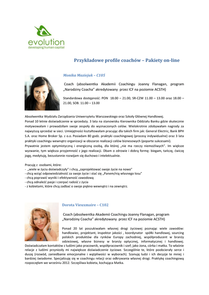 Przykładowe profile coachów – Pakiety on-line Monika Maziejuk – C105 Coach (absolwentka Akademii Coachingu Joanny Flanagan, program „Narodziny Coacha” akredytowany przez ICF na poziomie ACSTH) Standardowa dostępność: PON 18.00 – 21.00, SR-CZW 11.00 – 13.00 oraz 18.00 – 21.00, SOB. 11.00 – 13.00 Absolwentka Wydziału Zarządzania Uniwersytetu Warszawskiego oraz Szkoły Głównej Handlowej. Ponad 10 letnie doświadczenie w sprzedaży. 3 lata na stanowisku Kierownika Oddziału Banku gdzie skutecznie motywowałam i prowadziłam swoje zespoły do wyznaczonych celów. Wielokrotnie zdobywałam nagrody za najwyższą sprzedaż w sieci. Umiejętności kształtowałam pracując dla takich firm jak: General Electric, Bank BPH S.A. oraz Home Broker Sp. z o.o. Posiadam 80 godz. praktyki coachingowej (procesy indywidualne) oraz 3 lata praktyki coachingu wewnątrz organizacji w obszarze realizacji celów biznesowych (poparte sukcesami). Prywatnie jestem optymistyczną i energiczną osobą, dla której „nie ma rzeczy niemożliwych”. Im większe wyzwanie, tym większa przyjemność z jego realizacji. Dbam o zdrowie i dobrą formę: biegam, tańczę, ćwiczę jogę, medytuję, bezustannie rozwijam się duchowo i intelektualnie. Pracuję z osobami, które: - „wiele w życiu doświadczyły” i chcą „zaprojektować swoje życie na nowo” - chcą wziąć odpowiedzialność za swoje życie i stać się „Panem/nią własnego losu” - chcą poprawić wyniki i efektywność zawodową - chcą odnaleźć pasje i czerpać radość z życia - z kobietami, które chcą zadbać o swoje piękno wewnątrz i na zewnątrz. Dorota Vieuxmaire – C102 Coach (absolwentka Akademii Coachingu Joanny Flanagan, program „Narodziny Coacha” akredytowany przez ICF na poziomie ACSTH) Ponad 20 lat poszukiwałam własnej drogi życiowej poznając wiele zawodów: handlowiec, projektant, inspektor jakości , koordynator spółki handlowej, sourcing polskich produktów dla rynków Europy zachodniej, współproducent w branży odzieżowej, własne biznesy w branży optycznej, informatycznej i handlowej. Doświadczałam kontaktów z ludźmi jako pracownik, współpracownik i szef; jako żona, córka i matka. To właśnie relacje z ludźmi przyniosły mi największe doświadczenie życiowe. Szczególnie te, które poobcierały serce i duszę (rozwód, zaniedbanie emocjonalne i wątpliwości w wyborach). Szanuję ludzi i ich decyzje te mniej i bardziej świadome. Specjalizuję się w coachingu relacji oraz odkrywania własnej drogi. Praktykę coachingową rozpoczęłam we wrześniu 2012. Szczęśliwa kobieta, kochająca Matka. Natalia Dykiert – C101 Coach (absolwentka Akademi Coachingu Joanny Flanagam, program Narodziny Coacha przez ICF na poziomie ACSTH oraz Noble Manhattan Coaching, certyfikowanym Coachem IIC (International Institute of Coaching). Standardowa dostępność: PON – 18 -21; ŚR – 12- 17; CZW – 17 - 21 Ukończyła Politechnikę Poznańską na Wydziale Inżynierii Zarządzania. Ponad 5 lat zdobywałam doświadczenie w branży IT we współpracy z IBM, zaczynając już podczas studiów. Organizacja, rekrutacja, wprowadzanie ludzi do organizacji, rozwój to moje obszary działania. Tematyka rozwoju osobistego to obszar, który mnie bardzo interesuje. Aktualnie HR Manager w Currency One SA w branży finansowej, wymiany walut online . Moja pasja to inspirowanie oraz zachęcanie ludzi do samorozwoju. Życie świadome to życie spełnione - w tym pomaga między innymi coaching. Z Kim Pracuję? Z osobami, które chcą od życia czegoś więcej. Którzy znajdą czas, by zastanowić się nad życiem swoim, a nie chcą żyć z prądem. Wspieram w odkrywaniu swojego potencjału i poszerzaniu perspektyw. Szczególnie współpracuję z osobami myślącymi o swojej karierze, ale także skupiamy się nad innymi tematami. Anna Zdziechowicz - Łausz – C105 Coach (absolwentka Akademii Coachingu Joanny Flanagan, program „Narodziny Coacha” akredytowany przez ICF na poziomie ACSTH) Standardowa dostępność: PON – CZW: 18.00 – 20.30, SOB 11.00 – 13.00 Dyplomowany dietetyk. Jako coach specjalizuję się w health&diet coachingu, life coachingu i work/life balance. W swojej pracy wykorzystuję różne techniki, a nieodzownym ich elementem jest natura i praca z ciałem. Podczas procesu coachingowego wspieram moich Klientów w odkrywaniu drzemiącego w nich potencjału, ich pasji dzięki czemu odzyskują harmonię w życiu prywatnym i zawodowym. Jednocześnie jako coach i dyplomowany dietetyk uczestniczę w ich przemianie dotyczącej zmiany nawyków żywieniowych oraz stylu życia na zdrowszy. Iwona Hołubiec– C104 Coach ACC (absolwentka Akademii Coachingu Joanny Flanagan, program „Narodziny Coacha” akredytowany przez ICF na poziomie ACSTH) Dostępna: PN 8 – 18, WT 8 – 18, ŚR 8 – 16, CZW 8 – 18 Absolwentka: Wydziału Zarządzania Uniwersytetu Warszawskiego; Studiów Podyplomowych w zakresie Praktycznej Psychologii Społecznej w Wyższej Szkole Psychologii Społecznej w Warszawie, a także dwustopniowego szkolenia z ustawień systemowych w coachingu prowadzonych przez Johna Whittingtona – twórcę i prekursora ustawień systemowych w organizacjach na świecie. Ukończyła I stopień Reiki, naturalnej metody uzdrawiania. Posiada 20-letnie doświadczenie zawodowe. Przez prawie 10 lat pracowała dla dużych, międzynarodowych instytucji finansowych takich jak: Deutsche Leasing Polska S.A., Volkswagen Leasing Polska Sp. z o.o. oraz Volkswagen Bank Polska S.A. a także Leaseplan Sp. z o.o. Ma na swoim koncie również współpracę z działem strategii wiodącej światowej agencji marketingowej Leo Burnett Polska. W firmach, w których pracowała zajmowała się sprzedażą i kontaktami z kluczowymi klientami. Posiada także ponad 9-letnie doświadczenie, jako prywatny przedsiębiorca zatrudniający ok. 20 osób. Jest coachem, praktykiem biznesu, szczęśliwą żoną i matką. Ma wielu p