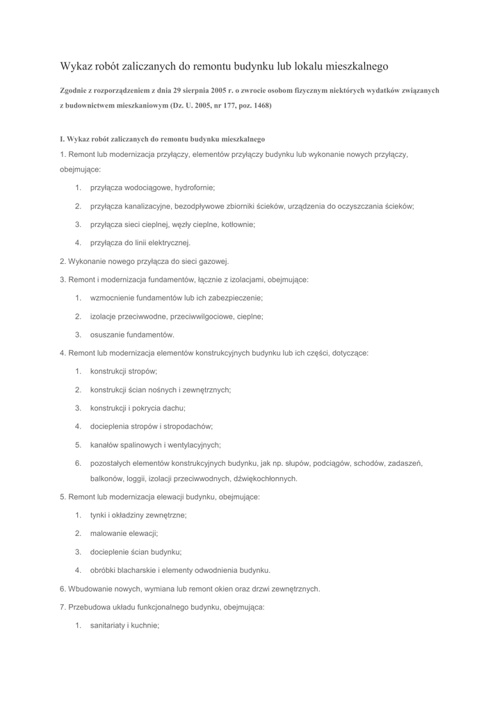 Wykaz robót zaliczanych do remontu budynku lub lokalu mieszkalnego Zgodnie z rozporządzeniem z dnia 29 sierpnia 2005 r. o zwrocie osobom fizycznym niektórych wydatków związanych z budownictwem mieszkaniowym (Dz. U. 2005, nr 177, poz. 1468) I. Wykaz robót zaliczanych do remontu budynku mieszkalnego 1. Remont lub modernizacja przyłączy, elementów przyłączy budynku lub wykonanie nowych przyłączy, obejmujące: 1. przyłącza wodociągowe, hydrofornie; 2. przyłącza kanalizacyjne, bezodpływowe zbiorniki ścieków, urządzenia do oczyszczania ścieków; 3. przyłącza sieci cieplnej, węzły cieplne, kotłownie; 4. przyłącza do linii elektrycznej. 2. Wykonanie nowego przyłącza do sieci gazowej. 3. Remont i modernizacja fundamentów, łącznie z izolacjami, obejmujące: 1. wzmocnienie fundamentów lub ich zabezpieczenie; 2. izolacje przeciwwodne, przeciwwilgociowe, cieplne; 3. osuszanie fundamentów. 4. Remont lub modernizacja elementów konstrukcyjnych budynku lub ich części, dotyczące: 1. konstrukcji stropów; 2. konstrukcji ścian nośnych i zewnętrznych; 3. konstrukcji i pokrycia dachu; 4. docieplenia stropów i stropodachów; 5. kanałów spalinowych i wentylacyjnych; 6. pozostałych elementów konstrukcyjnych budynku, jak np. słupów, podciągów, schodów, zadaszeń, balkonów, loggii, izolacji przeciwwodnych, dźwiękochłonnych. 5. Remont lub modernizacja elewacji budynku, obejmujące: 1. tynki i okładziny zewnętrzne; 2. malowanie elewacji; 3. docieplenie ścian budynku; 4. obróbki blacharskie i elementy odwodnienia budynku. 6. Wbudowanie nowych, wymiana lub remont okien oraz drzwi zewnętrznych. 7. Przebudowa układu funkcjonalnego budynku, obejmująca: 1. sanitariaty i kuchnie; 2. wjazdy, podjazdy, zabezpieczenia i wykonanie innych elementów związanych z udostępnieniem i przystosowaniem budynku dla osób niepełnosprawnych. 8. Remont, modernizacja, wymiana lub wykonanie nowych instalacji budynku, obejmujące rozprowadzanie po budynku instalacji oraz montaż trwale umiejscowionych: wyposażenia, armatury i urządzeń dotyczących: 1. instalacji sanitarnych; 2. instalacji elektrycznych, odgromowych i uziemienia; 3. instalacji klimatyzacyjnych i wentylacyjnych; 4. instalacji przyzywowych (domofony) i alarmowych; 5. przewodów wentylacyjnych, spalinowych i dymowych; 6. instalacji i urządzeń grzewczych. 9. Wykonanie nowych instalacji gazowych. 10. Wykonanie nowych instalacji wykorzystujących alternatywne źródła energii. II. Wykaz robót zaliczanych do remontu lokalu mieszkalnego 1. Remont, modernizacja lub wykonanie nowych elementów w lokalu mieszkalnym: 1. ścianek działowych, sufitów, tynków i okładzin wewnętrznych; 2. podłóg i posadzek; 3. okien, świetlików i drzwi; 4. powłok malarskich i tapet; 5. elementów kowalsko-ślusarskich; 6. izolacji przeciwwodnych, przeciwwilgociowych, dźwiękochłonnych i cieplnych. 2. Remont, modernizacja, wymiana lub wykonanie nowych instalacji w lokalu mieszkalnym, obejmujące rozprowadzenie po lokalu instalacji oraz montaż trwale umiejscowionych: wyposażenia, armatury i urządzeń dotyczących: 1. instalacji sanitarnych; 2. instalacji elektrycznych; 3. instalacji klimatyzacyjnych i wentylacyjnych; 4. instalacji przyzywowych (domofony) i alarmowych; 5. instalacji i urządzeń grzewczych; 6. przewodów wentylacyjnych, spalinowych i dymowych; 7. instalacji wykorzystujących alternatywne źródła energii. 3. Wykonanie nowych instalacji gazowych.