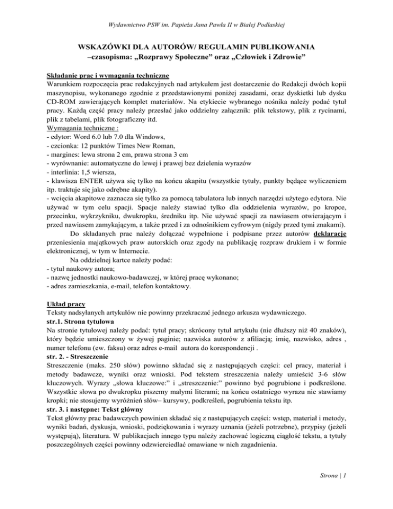 Wydawnictwo PSW im. PapieŜa Jana Pawła II w Białej Podlaskiej WSKAZÓWKI DLA AUTORÓW/ REGULAMIN PUBLIKOWANIA –czasopisma: „Rozprawy Społeczne” oraz „Człowiek i Zdrowie” Składanie prac i wymagania techniczne Warunkiem rozpoczęcia prac redakcyjnych nad artykułem jest dostarczenie do Redakcji dwóch kopii maszynopisu, wykonanego zgodnie z przedstawionymi poniŜej zasadami, oraz dyskietki lub dysku CD-ROM zawierających komplet materiałów. Na etykiecie wybranego nośnika naleŜy podać tytuł pracy. KaŜdą część pracy naleŜy przesłać jako oddzielny załącznik: plik tekstowy, plik z rycinami, plik z tabelami, plik fotograficzny itd. Wymagania techniczne : - edytor: Word 6.0 lub 7.0 dla Windows, - czcionka: 12 punktów Times New Roman, - margines: lewa strona 2 cm, prawa strona 3 cm - wyrównanie: automatyczne do lewej i prawej bez dzielenia wyrazów - interlinia: 1,5 wiersza, - klawisza ENTER uŜywa się tylko na końcu akapitu (wszystkie tytuły, punkty będące wyliczeniem itp. traktuje się jako odrębne akapity). - wcięcia akapitowe zaznacza się tylko za pomocą tabulatora lub innych narzędzi uŜytego edytora. Nie uŜywać w tym celu spacji. Spacje naleŜy stawiać tylko dla oddzielenia wyrazów, po kropce, przecinku, wykrzykniku, dwukropku, średniku itp. Nie uŜywać spacji za nawiasem otwierającym i przed nawiasem zamykającym, a takŜe przed i za odnośnikiem cyfrowym (nigdy przed tymi znakami). Do składanych prac naleŜy dołączać wypełnione i podpisane przez autorów deklaracje przeniesienia majątkowych praw autorskich oraz zgody na publikację rozpraw drukiem i w formie elektronicznej, w tym w Internecie. Na oddzielnej kartce naleŜy podać: - tytuł naukowy autora; - nazwę jednostki naukowo-badawczej, w której pracę wykonano; - adres zamieszkania, e-mail, telefon kontaktowy. Układ pracy Teksty nadsyłanych artykułów nie powinny przekraczać jednego arkusza wydawniczego. str.1. Strona tytułowa Na stronie tytułowej naleŜy podać: tytuł pracy; skrócony tytuł artykułu (nie dłuŜszy niŜ 40 znaków), który będzie umieszczony w Ŝywej paginie; nazwiska autorów z afiliacją; imię, nazwisko, adres , numer telefonu (ew. faksu) oraz adres e-mail autora do korespondencji . str. 2. - Streszczenie Streszczenie (maks. 250 słów) powinno składać się z następujących części: cel pracy, materiał i metody badawcze, wyniki oraz wnioski. Pod tekstem streszczenia naleŜy umieścić 3-6 słów kluczowych. Wyrazy „słowa kluczowe:” i „streszczenie:” powinno być pogrubione i podkreślone. Wszystkie słowa po dwukropku piszemy małymi literami; na końcu ostatniego wyrazu nie stawiamy kropki; nie stosujemy wyróŜnień słów– kursywy, podkreśleń, pogrubienia tekstu itp. str. 3. i następne: Tekst główny Tekst główny prac badawczych powinien składać się z następujących części: wstęp, materiał i metody, wyniki badań, dyskusja, wnioski, podziękowania i wyrazy uznania (jeŜeli potrzebne), przypisy (jeŜeli występują), literatura. W publikacjach innego typu naleŜy zachować logiczną ciągłość tekstu, a tytuły poszczególnych części powinny odzwierciedlać omawiane w nich zagadnienia. Strona | 1 Wydawnictwo PSW im. PapieŜa Jana Pawła II w Białej Podlaskiej Zasady cytowania w tekście - Odwołania do pracy jednego autora: (Nowak 2008) - Gdy praca ma dwóch autorów, naleŜy za kaŜdym razem podawać obydwa nazwiska (jak wyŜej), oddzielając je przecinkiem. - Gdy praca ma więcej niŜ dwóch autorów, naleŜy podawać tylko nazwisko pierwszego, dodając skrót „ i in.”, np. (Kowalski i in., 1994). W zestawieniu literatury cytowanej pod tekstem artykułu podajemy jednak nazwiska wszystkich autorów. - Cytowanie autorów o tym samym nazwisku wymaga uŜywania za kaŜdym razem inicjałów imienia. - W przypadku dosłownego cytowania fragmentu tekstu naleŜy stosować zapis: (Nowak 2008, s.15). - Cytując strony internetowe naleŜy umieścić cytowany adres w nawiasie zwykłym w tekście artykułu. Literatura Wykaz literatury umieszczony na końcu rozprawy, powinien być uporządkowany alfabetycznie i ponumerowany. Poszczególne pozycje literatury naleŜy zapisywać według wzoru: 1. Kunowski S. (2003), Wartości w procesie wychowania. Oficyna Wydawnicza „Impuls”, Kraków. 2. Ostrowska U. (2006), Aksjologiczne podstawy wychowania. W: B. Śliwerski (red.), Pedagogika. Gdańskie Wydawnictwo Pedagogiczne, Gdańsk, s. 391- 415. 3. Rynio A. (2007), Wychowanie osoby w nauczaniu Jana Pawła II. „Rozprawy Naukowe”, t. I, Państwowa WyŜsza Szkoła Zawodowa, Biała Podlaska, s. 11-32. Strony internetowe Jeśli pozycja literatury jest adresem internetowym naleŜy wstawić cytowaną stronę internetową wraz z dniem odczytu (nie wstawiamy adresu jako hiperłącza (czarny kolor czcionki, bez podkreślenia). Spis stron internetowych powinien być ponumerowany i uporządkowany według daty odczytu. Ocena pracy (zasady recenzowania publikacji) ZłoŜone artykuły podlegają anonimowej recenzji przez co najmniej dwóch niezaleŜnych recenzentów spoza jednostki. W innych rozwiązaniach recenzent musi podpisać deklarację o nie występowaniu konfliktu interesów; za konflikt interesów uznaje się zachodzące między recenzentem a autorem: a) bezpośrednie relacje osobiste (pokrewieństwo, związki prawne, konflikt), b) relacje podległości zawodowej, c) bezpośrednia współpraca naukowa w ciągu ostatnich dwóch lat poprzedzających przygotowanie recenzji. Autor moŜe podać nazwisko potencjalnego recenzenta, lecz Redakcja zastrzega sobie prawo o decyzji o jego wyborze. W celu przeprowadzenia anonimowej recenzji, do składanych artykułów naleŜy dołączyć tzw. ślepą stronę, zawierającą wyłącznie tytuł pracy. Recenzja posiada formę pisemną (formularz recenzencki podany jest na stronie internetowej czasopisma) i kończy się jednoznacznym wnioskiem co do dopuszczenia artykułu do publikacji lub jego od