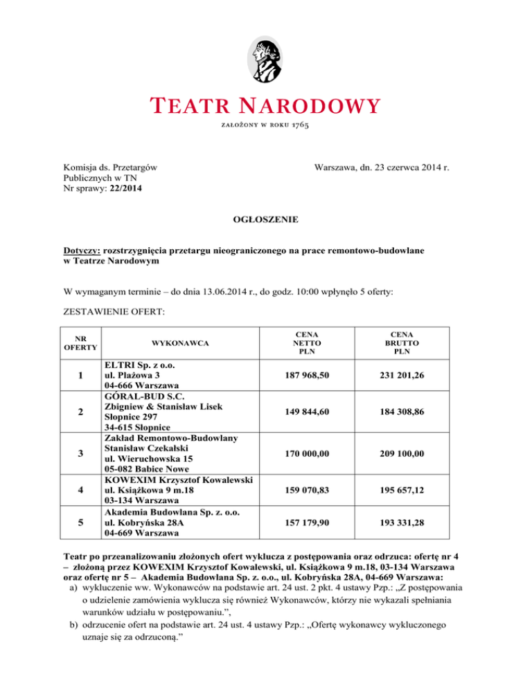 Komisja ds. Przetargów Publicznych w TN Nr sprawy: 22/2014 Warszawa, dn. 23 czerwca 2014 r. OGŁOSZENIE Dotyczy: rozstrzygnięcia przetargu nieograniczonego na prace remontowo-budowlane w Teatrze Narodowym W wymaganym terminie – do dnia 13.06.2014 r., do godz. 10:00 wpłynęło 5 oferty: ZESTAWIENIE OFERT: NR OFERTY 1 2 3 4 5 WYKONAWCA ELTRI Sp. z o.o. ul. Plażowa 3 04-666 Warszawa GÓRAL-BUD S.C. Zbigniew & Stanisław Lisek Słopnice 297 34-615 Słopnice Zakład Remontowo-Budowlany Stanisław Czekałski ul. Wieruchowska 15 05-082 Babice Nowe KOWEXIM Krzysztof Kowalewski ul. Książkowa 9 m.18 03-134 Warszawa Akademia Budowlana Sp. z. o.o. ul. Kobryńska 28A 04-669 Warszawa CENA NETTO PLN CENA BRUTTO PLN 187 968,50 231 201,26 149 844,60 184 308,86 170 000,00 209 100,00 159 070,83 195 657,12 157 179,90 193 331,28 Teatr po przeanalizowaniu złożonych ofert wyklucza z postępowania oraz odrzuca: ofertę nr 4 – złożoną przez KOWEXIM Krzysztof Kowalewski, ul. Książkowa 9 m.18, 03-134 Warszawa oraz ofertę nr 5 – Akademia Budowlana Sp. z. o.o., ul. Kobryńska 28A, 04-669 Warszawa: a) wykluczenie ww. Wykonawców na podstawie art. 24 ust. 2 pkt. 4 ustawy Pzp.: „Z postępowania o udzielenie zamówienia wyklucza się również Wykonawców, którzy nie wykazali spełniania warunków udziału w postępowaniu.”, b) odrzucenie ofert na podstawie art. 24 ust. 4 ustawy Pzp.: „Ofertę wykonawcy wykluczonego uznaje się za odrzuconą.” W związku z powyższym pozostałe oferty: nr 1, nr 2, i nr 3 są ważne. Teatr ocenił je zgodnie z przyjętymi w SIWZ kryteriami: a) najniższa cena - 80 % b) gwarancja jakości - 20 % Ocena ofert: NR OFERTY 1 2 3 WYKONAWCA ELTRI Sp. z o.o. ul. Plażowa 3 04-666 Warszawa GÓRAL-BUD S.C. Zbigniew & Stanisław Lisek Słopnice 297 34-615 Słopnice Zakład RemontowoBudowlany Stanisław Czekałski ul. Wieruchowska 15 05-082 Babice Nowe CENA NETTO PLN CENA BRUTTO PLN Ocena w pkt. za kryterium najniższa cena Oferowany okres gwarancji w miesiącach Ocena w pkt. za kryterium okres gwarancji Suma pkt. za kryterium najniższa cena i okres gwarancji 187 968,50 231 201,26 63,77 39 16,25 80,02 149 844,60 184 308,86 80 36 15 95 170 000,00 209 100,00 70,52 48 20 90,52 Najkorzystniejszą ofertę złożyła firma GÓRAL-BUD S.C. Zbigniew & Stanisław Lisek, Słopnice 297, 34-615 Słopnice. Oferta otrzymała: 95 pkt. Zamówienie na wykonanie prac remontowobudowlanych w Teatrze Narodowym będzie realizowała firma GÓRAL-BUD S.C. Zbigniew & Stanisław Lisek. Podpisała: mgr inż. Elżbieta Piwowarczyk Przewodnicząca Komisji ds. przetargów publicznych w TN