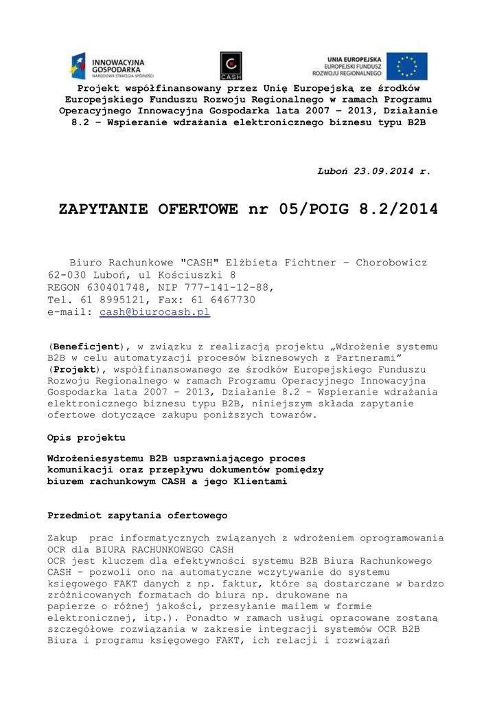 Projekt współfinansowany przez Unię Europejską ze środków Europejskiego Funduszu Rozwoju Regionalnego w ramach Programu Operacyjnego Innowacyjna Gospodarka lata 2007 – 2013, Działanie 8.2 – Wspieranie wdrażania elektronicznego biznesu typu B2B Luboń 23.09.2014 r. ZAPYTANIE OFERTOWE nr 05/POIG 8.2/2014 Biuro Rachunkowe "CASH" Elżbieta Fichtner – Chorobowicz 62-030 Luboń, ul Kościuszki 8 REGON 630401748, NIP 777-141-12-88, Tel. 61 8995121, Fax: 61 6467730 e-mail: [email protected] (Beneficjent), w związku z realizacją projektu „Wdrożenie systemu B2B w celu automatyzacji procesów biznesowych z Partnerami” (Projekt), współfinansowanego ze środków Europejskiego Funduszu Rozwoju Regionalnego w ramach Programu Operacyjnego Innowacyjna Gospodarka lata 2007 – 2013, Działanie 8.2 – Wspieranie wdrażania elektronicznego biznesu typu B2B, niniejszym składa zapytanie ofertowe dotyczące zakupu poniższych towarów. Opis projektu Wdrożeniesystemu B2B usprawniającego proces komunikacji oraz przepływu dokumentów pomiędzy biurem rachunkowym CASH a jego Klientami Przedmiot zapytania ofertowego Zakup prac informatycznych związanych z wdrożeniem oprogramowania OCR dla BIURA RACHUNKOWEGO CASH OCR jest kluczem dla efektywności systemu B2B Biura Rachunkowego CASH – pozwoli ono na automatyczne wczytywanie do systemu księgowego FAKT danych z np. faktur, które są dostarczane w bardzo zróżnicowanych formatach do biura np. drukowane na papierze o różnej jakości, przesyłanie mailem w formie elektronicznej, itp.). Ponadto w ramach usługi opracowane zostaną szczegółowe rozwiązania w zakresie integracji systemów OCR B2B Biura i programu księgowego FAKT, ich relacji i rozwiązań technologicznych, jakie zostaną wykorzystane dla ich potrzeb. Usługa ma być świadczona poprzez przeglądarkę internetową na stronie http://b2b.biurocash.pl/, co umożliwi wygodny dostęp do danych oraz ich przesyłanie potencjalnym użytkownikom. Usługa zakłada wykorzystanie zaawansowanych algorytmów przetwarzania obrazów dokumentów do postaci umożliwiającej pełne przeszukiwanie tychże dokumentów wraz z lokalizacją wyszukiwanych fragmentów wewnątrz dokumentów (semantyczne wyszukiwanie), wyodrębnienie struktur dokumentów – przykładowo danych kontrahentów, dat i numerów dokumentów, kwot netto vat brutto i sposobu zapłaty. Tak przetworzone dokumenty będą dostępne będzie przez 24 h godziny na dobę online poprzez stronę http://b2b.biurocash.pl/, lub poprzez api zostanie wczytywane i zaksięgowane do programu księgowego FAKT. Cechy systemu Ładowania plików np. w formacie pdf, które przez oprogramowanie OCR, będą następnie zamieniane na dane które będą przepływać do systemów informatycznych Biura) System ma umożliwić szeroki zakres rozpoznawanych dokumentów w różnych formatach plików: - Faktury sprzedażowe - Faktury zakupowe - Faktury korygujące - Nietypowe faktury (np. paliwowe) - Paragony itp. System OCR powinien umożliwiać obsługę wielu firm – Klientów Biura Rachunkowego bez ich limitu. System OCR nie może mieć limitów przetworzonych dokumentów. Dane z przetworzonych przez OCR dokumentów muszą być udostępnione platformoe B2B biura Rachunkowego. System ocr musi wspierać skaner Fujitsu ScanSnap N1800, skanowanie niezależne od połączenia z komputerem,format A3, maks. rozdzielczość 600 dpi, maksymalna wydajność 2000 dokumentów/dzień, maks. Prędkość 40 str./min. (czarno-biały) 20 str./min. (kolor) Zamawiający nie dopuszcza składania ofert częściowych rozpatrywane będą tylko oferty kompletne. Zamawiający zastrzega sobie prawo realizacji poszczególnych zadań w ramach oddzielnych umów. Kryteria wyboru obligatoryjne: Wypełnienie załącznika nr 1 do zapytania ofertowego, który jednocześnie stanowi formularz ofertowy Gotowość wykonania zadań we wskazanych terminach Kryteria wyboru punktowe: Kryteria wyboru Cena netto Znaczenie 100% Sposób oceny oferty w poszczególnych kryteriach: Punkty w ramach kryterium następującej formuły: A n = C min C r – A n – ceny będą przyznawane wg C min ----------------- x 100 C r – cena minimalna w zbiorze cena oferty rozpatrywanej ilość punktów przyznana ofercie W przypadku, gdy kwoty przedstawione w odpowiedziach na zapytanie będą wyższe od zaplanowanych w budżecie ww. projektu Zamawiający zastrzega sobie prawo negocjacji z Wykonawcą, który przedstawi najkorzystniejszą ofertę. Miejsce składania ofert: Biuro Rachunkowe CASH Ul. Kościuszki 63 62-030 Luboń Lub na adres mailowy [email protected] Termin dostarczania ofert upływa w dniu: 08.10.2014 Osoba do kontaktu: Elżbieta Fichtner Chorobowicz_______________ Email: [email protected] Tel. 61 8995121 Złożona oferta powinna zawierać co najmniej: nazwę i adres oferenta, data wystawienia oferty, kosztorys ofertowy w PLN, termin ważności oferty (minimum 60 dni), imię i nazwisko wystawcy oferty. Zastrzeżenia firmy Niniejsze zapytanie ofertowe nie zobowiązuje Rachunkowe CASH do żadnego określonego działania. Wydanie niniejszego zapytania ofertowego nie zobowiązuje Biuro firmy Biuro Rachunkowe CASH do akceptacji oferty, w całości lub części i nie zobowiązuje firmy Biuro Rachunkowe CASH do składania wyjaśnień czy powodów akceptacji lub odrzucenia oferty. Biuro Rachunkowe CASH nie może być pociągana do odpowiedzialności za jakiekolwiek koszty czy wydatki poniesione przez oferentów w związku z przygotowaniem i dostarczeniem oferty. Załącznik nr 1 do zapytania ofertowego/formularz ofertowy – – – – – – – – – .................., dn. ........................... – Miejscowość i data* ........................................ ........................................ .......................................... ........................................... Nazwa firmy i dane teleadresowe* – Oferta dla __________________________ – – Adres: ___________ – –