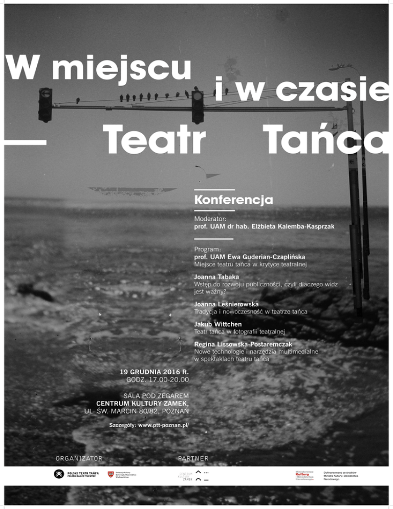 W miejscu — i w czasie Teatr Tanca — — — Konferencja Moderator: prof. UAM dr hab. Elżbieta Kalemba-Kasprzak Program: prof. UAM Ewa Guderian-Czaplińska Miejsce teatru tańca w krytyce teatralnej Joanna Tabaka Wstęp do rozwoju publiczności, czyli dlaczego widz jest ważny? Joanna Leśnierowska Tradycja i nowoczesność w teatrze tańca Jakub Wittchen Teatr tańca w fotografii teatralnej Regina Lissowska-Postaremczak Nowe technologie i narzędzia multimedialne w spektaklach teatru tańca 19 GRUDNIA 2016 R. GODZ. 17.00-20.00 SALA POD ZEGAREM CENTRUM KULTURY ZAMEK, UL. ŚW. MARCIN 80/82, POZNAŃ Szczegóły: www.ptt-poznan.pl/ ORGANIZATOR PARTNER Dofinansowano ze środków Ministra Kultury i Dziedzictwa Narodowego.