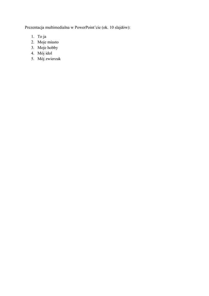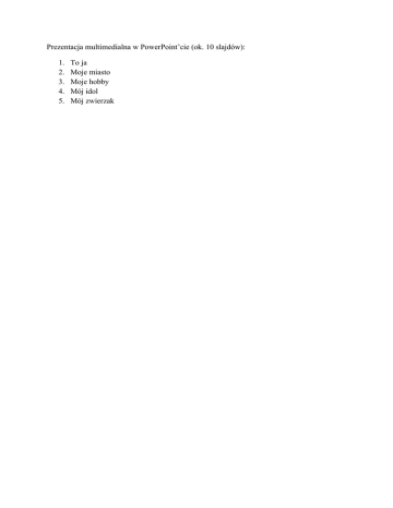 Prezentacja multimedialna w PowerPoint’cie (ok. 10 slajdów): 1. 2. 3. 4. 5. To ja Moje miasto Moje hobby Mój idol Mój zwierzak