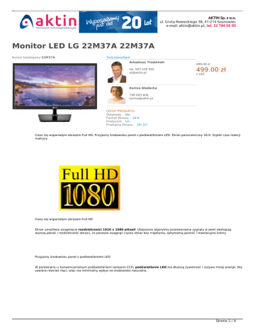 Monitor LED LG 22M37A 22M37A Numer katalogowy:22M37A Twój konsultant Arkadiusz Trzebiński tel. 503 030 555 [email protected] NOWOŚĆ W OFERCIE 499.00 zł 499.00 zł z VAT Karina Gładecka 796 603 606 [email protected] CECHY PRODUKTU: Dotykowy - Nie Format Ekranu - 16:9 Producent - LG Przekątna Ekranu - 19"-21" Ciesz się wspaniałym obrazem Full HD. Przyjazny środowisku panel z podświetleniem LED. Ekran panoramiczny 16:9. Szybki czas reakcji matrycy. Ciesz się wspaniałym obrazem Full HD Ekran umożliwia osiągnięcie rozdzielczości 1920 x 1080 pikseli. Ulepszone algorytmy przetwarzania sygnału w pełni obsługują wyższą jakość i rozdzielczość obrazu, co pozwala osiągnąć czysty obraz bez migotania, optymalną jasność i rewelacyjne kolory. Przyjazny środowisku panel z podświetleniem LED W porównaniu z konwencjonalnym podświetleniem lampami CCFL podświetlenie LED ma dłuższą żywotność i zużywa mniej energii. Nie zawiera również rtęci, więc ma minimalny wpływ na środowisko naturalne. Strona 1 / 4 Ekran panoramiczny 16:9 Szerokoekranowy ekran panoramiczny o proporcjach 16:9 umożliwi Ci jednorazowe korzystanie z wielu aplikacji oraz komfortowe oglądanie filmów. Świetnie sprawdzają się przy pracy z rozbudowanym oprogramowaniem, podzielonym na wiele paneli. Jest to jeden z najpopularniejszych formatów ekranu stosowany w monitorach. Szybki czas reakcji matrycy Niezwykła szybkość działania matrycy, na poziomie 5 ms. Krótki czas reakcji niemal całkowicie eliminuje efekt „ghostingu” oraz rozmycia i sprawia, że monitor sprawdza się doskonale podczas grania w gry, oglądania filmów lub edycji zawartości wideo. Strona 2 / 4 Uwolnij swoje oczy od efektu migotania! Zapomnij o zmęczonych oczach i nadwyrężonym wzroku. Monitory z technologią Flicker-Free,certyfikowaną przez TÜV Rheinland, zostaył zaprojektowany tak, by redukować migotanie obrazu i zapewnić wygodne oglądanie. Minimalizuje szkodliwe efekty długotrwałej pracy przed monitorem. Zapewnij komfortowe czytanie W trybie Reader Mode zostaje zredukowana emisja światła niebieskiego, dzięki czemu obraz staje się cieplejszy, co zapewnia optymalne warunki do czytania i zmniejsza zmęczenie oczu. Tylko jedno dotknięcie przycisku dzieli Cię od dostrojenia monitora w sposób zapewniający komfortowe czytanie nawet przez wiele godzin dziennie. Dane techniczne monitor LED LG 22M37A Dane podstawowe Ekran Ekran dotykowy Zakrzywiony ekran Technologia 3D Ekran obrotowy (pivot) Obraz Rozdzielczość Kontrast statyczny / dynamiczny Jasność ekranu Czas reakcji matrycy Wielkość plamki Kąt widzenia w pionie / w poziomie Liczba wyświetlanych kolorów Wejścia / wyjścia Złącze D-Sub (VGA) Złącze DVI Złącze HDMI 21,5 cala / / 16:9 1920 brak danych / 500 20 0, 65 stopni / 9 1 Strona 3 / 4 Złącze DisplayPort Złącze Thunderbolt Złącze USB Wejście liniowe audio Wyjście liniowe audio Informacje użytkowe Tuner TV Pilot / Mikrofon Głośniki Możliwość zawieszenia na ścianie Standard VESA Informacje dodatkowe Parametry fizyczne Kolor obudowy Wymiary (szer. x wys.x gł.) Waga Wymiary opakowania Waga z opakowaniem Efektywność energetyczna Pobór mocy (tryb włączenia) Pobór mocy (tryb czuwania) Przekątna ekranu Rozdzielczość Wyposażenie Wyposażenie Gwarancja Gwarancja Typ gwarancji Kod Producenta Nazwa producenta / importera 75 funkcja Reader Mode, regulacja pochylania w pionie, technologi Safe, funkcja Colo 509 x 387 x 56 x 22 21 1920 instrukcja obsługi, kabel D-Sub, kabel zasilający, karta gwa 24 m doo 22 LG Electronics Polska S Strona 4 / 4 Powered by TCPDF (www.tcpdf.org)