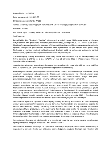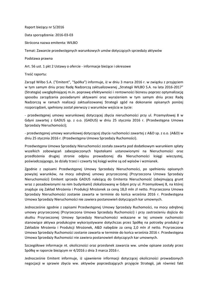 Zarząd Wilbo S.A. ("Emitent", "Spółka") informuje, iż w dniu 3 marca 2016 r. w związku z przyjęciem