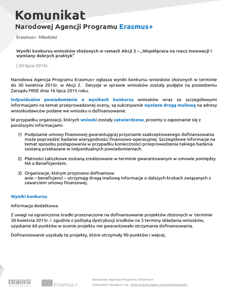 Erasmus+ Młodzież Wyniki konkursu wniosków złożonych w ramach Akcji 2 – „Współpraca na rzecz Innowacji i wymiany dobrych praktyk” | 20 lipca 2015r. Narodowa Agencja Programu Erasmus+ ogłasza wyniki konkursu wniosków złożonych w terminie do 30 kwietnia 2015r. w Akcji 2. Decyzje w sprawie wniosków zostały podjęte na posiedzeniu Zarządu FRSE dnia 16 lipca 2015 roku. Indywidualne powiadomienia o wynikach konkursu wniosków wraz ze szczegółowymi informacjami na temat przeprowadzonej oceny, są sukcesywnie wysłane drogą mailową na adresy wnioskodawców podane we wniosku o dofinansowanie. W przypadku organizacji, których wnioski zostały zatwierdzone, prosimy o zapoznanie się z poniższymi informacjami: 1) Podpisanie umowy finansowej gwarantującej przyznanie zaakceptowanego dofinansowania może poprzedzić badanie wiarygodności finansowo-operacyjnej. Szczegółowe informacje na temat sposobu postępowania w przypadku konieczności przeprowadzenia takiego badania zostaną przekazane w indywidualnych powiadomieniach. 2) Płatności zaliczkowe zostaną zrealizowane w terminie gwarantowanym w umowie pomiędzy NA a Beneficjentem. 3) Organizacje, którym przyznano dofinansow anie – beneficjenci – otrzymają drogą mailową informacje o dalszych krokach związanych z zawarciem umowy finansowej. Wyniki konkursu Informacja dodatkowa: Z uwagi na ograniczone środki przeznaczone na dofinansowanie projektów złożonych w terminie 30 kwietnia 2015r. i zgodnie z polityką dystrybucji środków na 3 terminy składania wniosków, uzyskanie 60 punktów w ocenie projektu nie gwarantowało otrzymania dofinansowania. Dofinansowanie uzyskały te projekty, które otrzymały 90 punktów i więcej. Narodowa Agencja Programu Erasmus+ Dokument dostępny na: www.erasmusplus.org.pl/dokumenty Miejsc e na liście rankin gowej Nr projektu Tytuł projektu Nazwa organizacji Ulica Kod pocztowy Miasto Decyzja Przyznane dofinansowanie 2015-2-PL01-KA205-017220 Jak pracować z dziećmi? Polscy i Rumuńscy pedagodzy na rzecz dzieci Fundacja United Way Polska Pokrzywnicka 3a 04-320 Warszawa Zatwierdzony 40 939,00 € 2015-2-PL01-KA205-017265 Cooperation for social and civic competences’ innovative education FUNDACJA WSPIERANIA ORGANIZACJI POZARZĄDOWYCH "UMBRELLA" Strzegomska 7 53-611 Wrocław Zatwierdzony 113 490,00 € 2015-2-PL01-KA205-017512 Integracja przez Inspiracje. Pozaformalne metody edukacji narzędziem wyrównywania szans młodzieży zagrożonej wykluczeniem społecznym. Fundacja In Posterum Górczewska 200 C m.359 01-460 Wrocław Zatwierdzony 189 745,00 € 2015-2-PL01-KA205-017670 Dla młodzieży i z młodzieżą odkrywamy świat. Fundacja Centrum Edukacji, Przedsiębiorczości i Aktywności Społecznej Legnicka 65 54-206 Warszawa Zatwierdzony 151 340,00 € 5. 2015-2-PL01-KA205-017584 Europejski Program Przedsiębiorczoś ci na rzecz wspierania NEETs Euro-Forum Agnieszka Gudków, Marek Gudków Spółka Jawna Graniczna 4/7,8 20-010 Lublin Zatwierdzony 99 350,00 € 6. 2015-2-PL01-KA205-017243 First ADR Kit Stowarzyszenie Rozwoju i Integracji Młodzieży Pawlikowskiego 5/5 70-535 Kraków Odrzucony 0,00 € 7. Wake-up! Intensyfikacja edukacji pozaformalnej młodzieży w 2015-2-PL01-KA205-017227 Gminie Łobez poprzez strategiczne partnerstwa międzynarodowe Fundacja Bonin Bonin 31 31-127 Bonin Odrzucony 0,00 € 1. 2. 3. 4. Narodowa Agencja Programu Erasmus+ Dokument dostępny na: www.erasmusplus.org.pl/dokumenty 2015-2-PL01-KA205-017521 Living memory beyond borders Centrum Inicjatyw UNESCO al. Wiśniowa 33 53-137 Wrocław Odrzucony 0,00 € 9. 2015-2-PL01-KA205-017366 Assessing and Training the European Youth Worker VIVA FEMINA R. Alsa 2/1 35-030 Rzeszów Odrzucony 0,00 € 10. 2015-2-PL01-KA205-017606 PolaCzek - jdeme do toho! Centrum Inicjatyw UNESCO al. Wiśniowa 33 53-137 Wrocław Odrzucony 0,00 € 2015-2-PL01-KA205-017748 Know-how exchange on working with diasporas Fundacja Szkoła Liderów Wiejska 12a 00-490 Warszawa Odrzucony 0,00 € 2015-2-PL01-KA205-017302 Sztuka nie tylko dla sztuki Fundacja Akademia Podmiotowego Wspierania Młodzieży Piaskowa 42/1 72-010 Police Odrzucony 0,00 € 2015-2-PL01-KA205-017292 Europejskie partnerstwo na rzecz łączenia edukacji młodzieży z rynkiem pracy Gmina Wrocław pl. Nowy Targ 1-8 50-141 Wrocław Odrzucony 0,00 € 8. 11. 12. 13. Narodowa Agencja Programu Erasmus+ Dokument dostępny na: www.erasmusplus.org.pl/dokumenty 14. 2015-2-PL01-KA205-017594 Kalejdoskop przedsiębiorczoś ci po europejsku Fundacja "Krzyżowa" dla Porozumienia Europejskiego Krzyżowa 7 58-112 Grodziszcze Odrzucony 0,00 € 15. 2015-2-PL01-KA205-017423 Methods Exchange Fundacja Atalaya Wolność 5/17 01-018 Warszawa Odrzucony 0,00 € 2015-2-PL01-KA205-017536 Young managers of the effective career development SYNTEA SPOLKA AKCYJNA Gospodarcza 26 20 213 Lublin Odrzucony 0,00 € Wojciechowska 9A 20 704 Lublin Odrzucony 0,00 € 16. 17. EUROPEAN 2015-2-PL01-KA205-017505 YOUTH MOBILITY SUPPORT Polska Fundacja Ośrodków Wspomagania Rozwoju Gospodarczego OIC POLAND z siedziba w Lublinie 18. 2015-2-PL01-KA205-017223 Youth Entrepreneurshi p and Creativity Krakowskie Centrum Zarządzania i Administracji Sp. z o.o. Plac Matejki 10/3 31-157 Kraków Odrzucony 0,00 € 19. 2015-2-PL01-KA205-017599 Cyber Violence STOWARZYSZENIE INSTYTUT NOWYCH TECHNOLOGII Hoffmanowej 19 35-016 Łódź Odrzucony 0,00 € 20. 2015-2-PL01-KA205-017291 Practical Learning for Action and Networking via an Educational Tool, Inspiring Study of Environment Centrum Wspierania Edukacji i Przedsiębiorczości Sienkiewicza 55 90 009 Rzeszów Odrzucony 0,00 € 21. 2015-2-PL01-KA205-017682 Open Minds Young Enterprise Club Zakład Doskonalenia Zawodowego Pogodna 63/1 15-365 Białystok Odrzucony 0,00 € 2015-2-PL01-KA205-017207 FIT for girls football - manual LUDOWY KLUB for girls football SPORTOWY "ROLNIK" clubs. Biedrzychowice 19b 48-250 Głogówek Odrzucony 0,00 € 22. Narodowa Agencja Programu Erasmus+ D