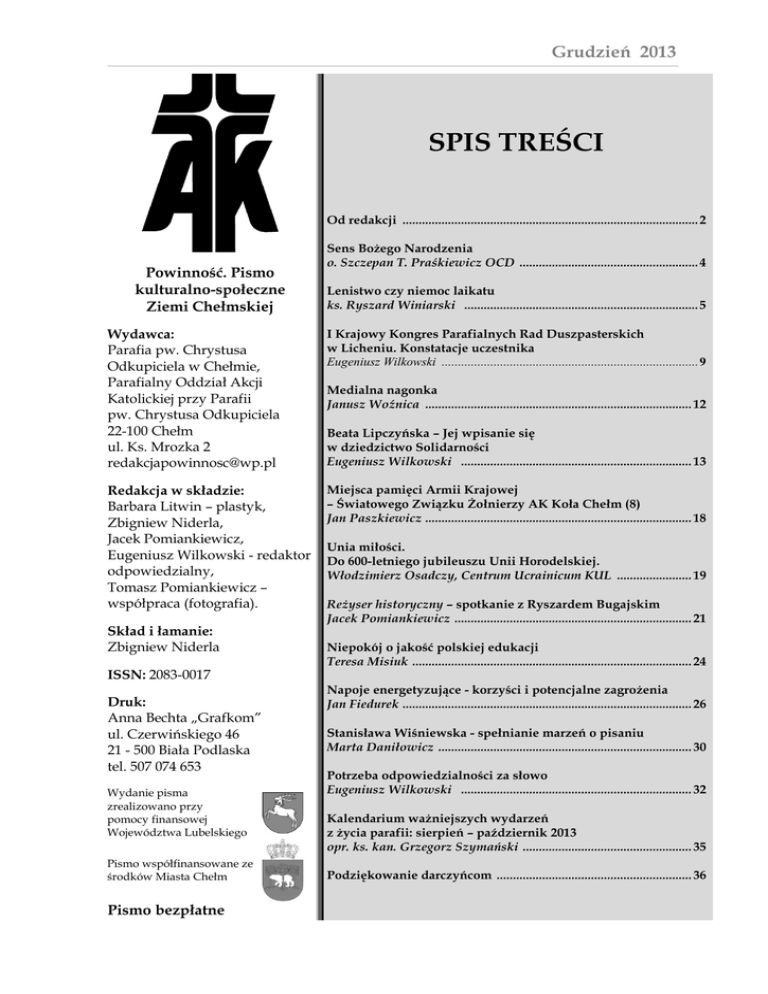 Grudzień 2013 SPIS TREŚCI Od redakcji ........................................................................................... 2 Powinność. Pismo kulturalno-społeczne Ziemi Chełmskiej Sens Bożego Narodzenia o. Szczepan T. Praśkiewicz OCD ....................................................... 4 Lenistwo czy niemoc laikatu ks. Ryszard Winiarski ........................................................................ 5 Wydawca: Parafia pw. Chrystusa Odkupiciela w Chełmie, Parafialny Oddział Akcji Katolickiej przy Parafii pw. Chrystusa Odkupiciela 22-100 Chełm ul. Ks. Mrozka 2 [email protected] I Krajowy Kongres Parafialnych Rad Duszpasterskich w Licheniu. Konstatacje uczestnika Eugeniusz Wilkowski ............................................................................... 9 Redakcja w składzie: Barbara Litwin – plastyk, Zbigniew Niderla, Jacek Pomiankiewicz, Eugeniusz Wilkowski - redaktor odpowiedzialny, Tomasz Pomiankiewicz – współpraca (fotografia). Miejsca pamięci Armii Krajowej – Światowego Związku Żołnierzy AK Koła Chełm (8) Jan Paszkiewicz .................................................................................. 18 Skład i łamanie: Zbigniew Niderla ISSN: 2083-0017 Druk: Anna Bechta „Grafkom” ul. Czerwińskiego 46 21 - 500 Biała Podlaska tel. 507 074 653 Wydanie pisma zrealizowano przy pomocy finansowej Województwa Lubelskiego Pismo współfinansowane ze środków Miasta Chełm Pismo bezpłatne Medialna nagonka Janusz Woźnica .................................................................................. 12 Beata Lipczyńska – Jej wpisanie się w dziedzictwo Solidarności Eugeniusz Wilkowski ....................................................................... 13 Unia miłości. Do 600-letniego jubileuszu Unii Horodelskiej. Włodzimierz Osadczy, Centrum Ucrainicum KUL ....................... 19 Reżyser historyczny – spotkanie z Ryszardem Bugajskim Jacek Pomiankiewicz ......................................................................... 21 Niepokój o jakość polskiej edukacji Teresa Misiuk ...................................................................................... 24 Napoje energetyzujące - korzyści i potencjalne zagrożenia Jan Fiedurek ......................................................................................... 26 Stanisława Wiśniewska - spełnianie marzeń o pisaniu Marta Daniłowicz .............................................................................. 30 Potrzeba odpowiedzialności za słowo Eugeniusz Wilkowski ....................................................................... 32 Kalendarium ważniejszych wydarzeń z życia parafii: sierpień – październik 2013 opr. ks. kan. Grzegorz Szymański .................................................... 35 Podziękowanie darczyńcom ............................................................ 36 Grudzień 2013 Powinność. Pismo kulturalno-społeczne Ziemi Chełmskiej Od redakcji W iele rysów z przestrzeni grudnia – a wtopionych w nasze dzieje - nie jest łatwych do ogarnięcia. Jawią się w tylu aspektach, że – pozostając w swojej ograniczoności i skończoności - możemy popaść w uproszczenia, bądź skazać siebie na wybiórczy odbiór. Niczego nie usuwając z tej świadomości musimy jednak podjąć się wysiłku pewnego, choćby podstawowego, uporządkowania. Dla chrześcijan jest to przede wszystkim czas oczekiwania na przyjście Bożej Dzieciny (Adwent), a potem radość z faktu Jej narodzenia. Oto przychodzi Ten, który ma nas zbawić. Ten czas radości przeżywania religijnego wpisany zostaje w kontekst kulturowy, w wielowiekową obrzędowość: ubieranie choinki, wieczerzę wigilijną, niepowtarzalny klimat kolęd. Szczególnym przeżyciem jawi się pasterka. Narodziny Jezusa stały się inspiracją w muzyce, malarstwie, rzeźbie, literaturze, w zasadzie w każdym przejawie ludzkiej aktywności i poszukiwań. Ojciec Dr Szczepan Praśkiewicz, przeor klasztoru Karmelitów Bosych w Lublinie, konsultor Kongregacji Spraw Kanonizacyjnych, autor rozlicznych publikacji, przedkłada nam rozważania, którymi powinna być znaczona nasza droga we właściwym przeżywanie świąt Bożego Narodzenia, a równocześnie podnosi, czego powinniśmy wystrzegać się. Za ten dar wyrażamy Ojcu głęboką wdzięczność. Relatywizacja współczesnego świata wkrada się we wszystkie sfery życia, w tym w okres przedświąteczny i czas samych świąt. Musimy być tego świadomi. Niech ten tekst wprowadza nas zatem w bożonarodzeniową refleksję i odnajdywanie istoty świat. O stan naszej świadomość, o jej kondycję, upomina się ks. Ryszard Winiarski, kierując do nas – świeckich – podstawowe pytania. Czy jesteśmy zdolni podjąć wyzwania, jakie stają przed nami, czy też pozwolimy ogarnąć się lenistwu, lub niemocy, co w efekcie sprowadza się do tego samego – bierności. Nasze zachowania determinowane są różnymi czynnikami, ks. R. Winiarski wskazuje przede wszystkim na dziedzictwo komunizmu, w którym człowiek, jako osoba, został pozbawiony samodzielnej aktywności. Z tą - głęboko trudną - spuścizną trudno nam teraz uporać się. Ponadto liberalne rozwiązania doby dzisiejszej jakże często odbierają człowiekowi to, co jest mu przynależne, z racji tego, że jest człowiekiem. Od świadomego chrześcijanina należy jednak – niezależnie 2|Strona od okoliczności - oczekiwać postawy aktywnej, podejmującej pojawiające się wyzwania. Głos ks. R. Winiarskiego staje się bardzo ważnym zaproszeniem do dyskursu o postawach laikatu. Wczytajmy się w ten tekst, przeanalizujmy, miejmy odwagę wyznaczyć swoje miejsce w tej przestrzeni. Bardzo poważnym przedsięwzięciem, skierowanym ku laikatowi, stał się I Krajowy Kongres Parafialnych Rad Duszpasterskich, przygotowany w dniach 14 – 15 września w Licheniu. Zamieszczamy spostrzeżenia jednego z uczestników owego spotkania. W polskim Kościele ws