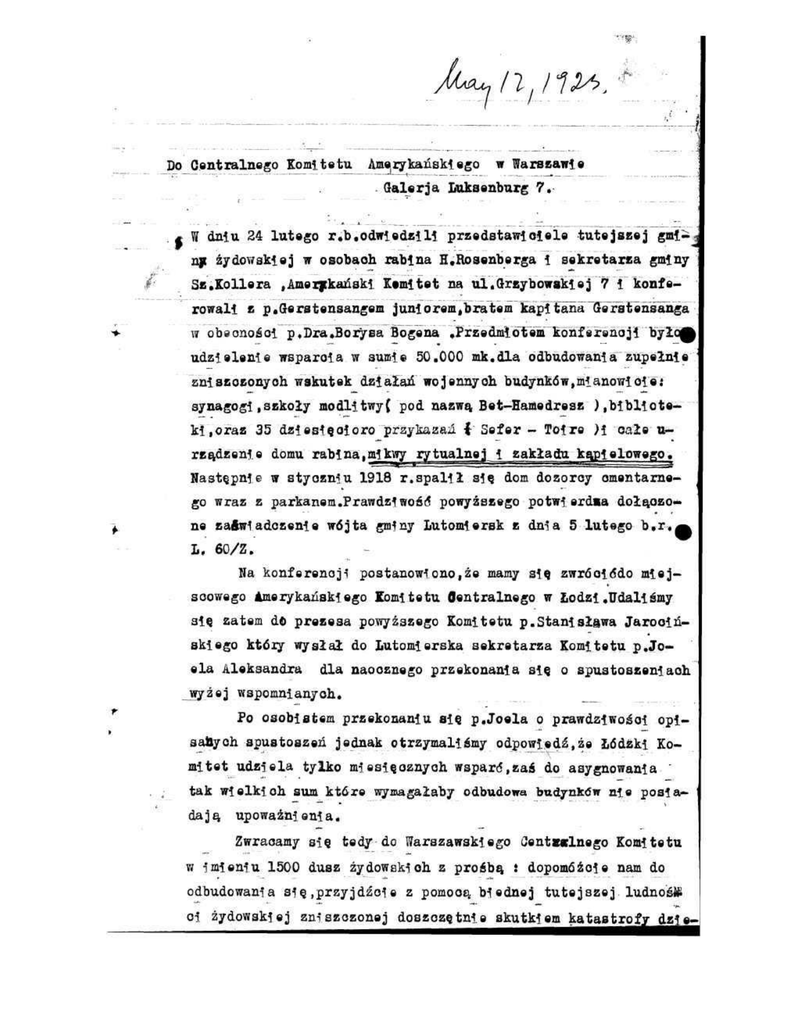 lly? Lh ' Do_Cwitiala^go_^ 1 i* €rbu_Ame^ry kanakl©go w Warazawi9 Galerja Luksonburg 7 . J . * W dniu 24 lutago r#b.odwi9dzili prz9datawioi9l9 t u t 9 j a z 9 j gml-^ njc aydowaklej w osobaoh rablna H,Roa9nberga i s e k r e t a r s a gmlny 'i* Se.Kollera .Anwrjrkadaki Kamitat na ulVGraybowakiVj7"~i konferowall £ p«Gerstensangeffl juniorem,bratem kapitana~Tferat«nsanga w obeonoSci p»Dra.Borysa Bogena ,Pra«dml^Mrkdnfer8no3i bylqjp udzi9l»ni© wsparoia w sumi© 50,000 mk,dla odbudowaniazupelnle "zniazozonyoh. wakutek dzfaTari.wo Jenny oh budynk6w,mianoi?ioi9i synagogi,szkoly modlitwyf pod nazwa, B«t-Ham«dr»sz ) , b i b l l o t i k i , oraz 35 dziasiQoioro przykazal I Sefer - Toixe ) i c a l 9 l i ra adz 9 ni e domu rabina,mjkwy r y t u a l n e j j zakladxt kgpj9low»go« Nast§pnie w styozniu 1918 r , s p a l l 1 s i e dom dozoroy omontarn©go wraz z parkan9m.Prawdz!wo£<5 powyzszego potwi9rd«a dolaozone zaftwiadoz9ni9 w6jta gntf ny Lutomlersk z dnla 5 lut«go b,r,^ L, 60/Z. Na konfer9noj1 postanowiono,Z9 mamy si a. zwrfioiddo m i 9 j soowego 4m9rykaiiski9go Komitctu 0«n t r a i n s go w Lodzi.Udalismy s i s zatsm do pr9Z9sa powyzaZ9go Komit9tu p.Stanialawa J a r o o i n skiego kt6ry wyslal do Lutomierska sekretarza Kom5tetu p , J o 9la Alaksandra dla naooznego przekonania s i s o spustosz9niaoh wyzcj wapomnianyolw Po oaobiat9m przekonaniu ale p . J o a l a o prawdziwogoi o p i aahyoh apuatoaz93i Jednak otrzymali£my odpowl9d2,Z9 Lddzki Komi t 9 t udziela tylko miesi^oznyoh wapard,za£ do asygnowania ' tak i?i9lkioh sum ktdr© wymagalaby odbudowa budynktfir nie p o s i a daja, upowaznienia, Zwraoamy sie. tedy do Warszawski9go CJentaatlnego Komi t e t u w 1mi9niu 1500 duaz zydowekioh. z proSba, J dopom6zoi9 nam do odbudowanla sie, ,przyjdzoii z pomooa, bi9dn9J t u t 9 j s z 9 j . ludnogJB oi zydowaki9J zniszczonej do8zozQtnj9 akutkjom k a t a a t r o f y d z j a - jaw©j#Suma„to ni 9,wl«lka_wob ©0 dziai e 3 az9 j azalon©j dro zyzny m M®53M^ w J^do^ ona nam zab9Zpi90Liy<< Praynajml9j daoh nad glowa* ni© wajjplmy przeto.ze ^ro6baNaaaza zoatanj ©, przyohylnj © zalatwlona, i ooz©knj©my laakawego za*. wiadomieh^a nas o wyniku pod ^dr©aem miejepo^egorabii/a H. •Ho8©nberga. _ * - Lutomi©rak. dni a 1Z mai a -1920 # : , , . " J • 7 tjej/t J r-=2 9.--m.-a23 04*&4&<t.i L.\iis\v<v''i #OMp/ fH*<4> 1$ s-oLicrytt j~y,% ~ih* I a ^ & ^ ^ ^ -#*«>>''ft J c 0% 7?4 * •>>4i €*•? ^ hnttiultwit •, /