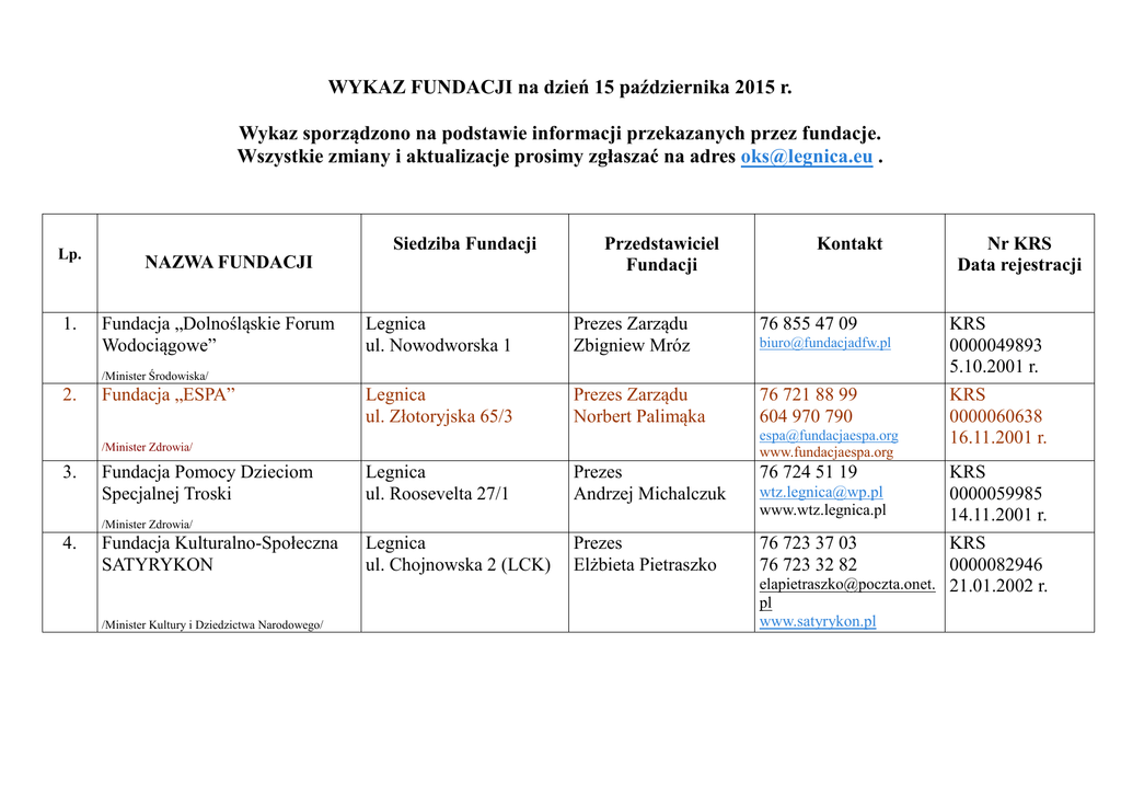 WYKAZ FUNDACJI na dzień 15 października 2015 r
