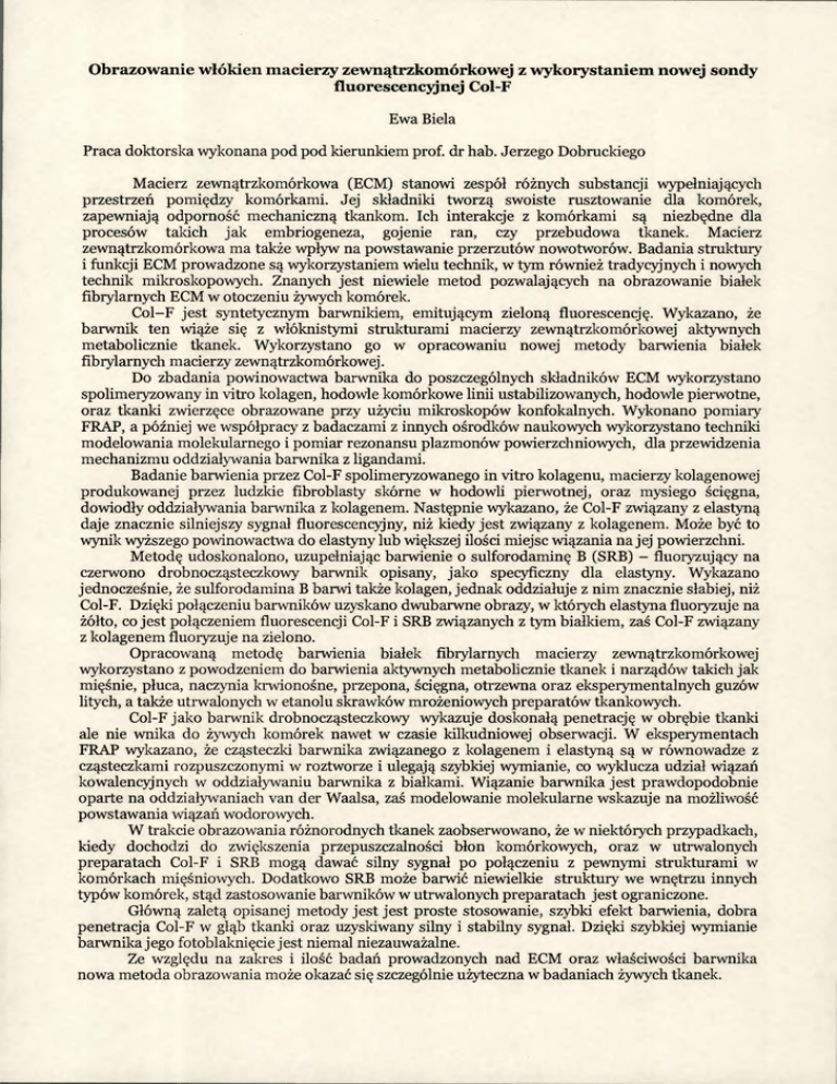 Obrazowanie włókien macierzy zewnątrzkomórkowej z wykorystaniem nowej sondy fluorescencyjnej Col-F Ewa Biela Praca doktorska wykonana pod pod kierunkiem prof. dr hab. Jerzego Dobruckiego Macierz zewnątrzkomórkowa (ECM) stanowi zespół różnych substancji wypełniających przestrzeń pomiędzy komórkami. Jej składniki tworzą swoiste rusztowanie dla komórek, zapewniają odporność mechaniczną tkankom. Ich interakcje z komórkami są niezbędne dla procesów takich jak embriogeneza, gojenie ran, czy przebudowa tkanek. Macierz zewnątrzkomórkowa ma także wpływ na powstawanie przerzutów nowotworów. Badania struktury i funkcji ECM prowadzone są wykorzystaniem wielu technik, w tym również tradycyjnych i nowych technik mikroskopowych. Znanych jest niewiele metod pozwalających na obrazowanie białek fibrylarnych ECM w otoczeniu żywych komórek. Col—F jest syntetycznym barwnikiem, emitującym zieloną fluorescencję. Wykazano, że barwnik ten wiąże się z włóknistymi strukturami macierzy zewnątrzkomórkowej aktywnych metabolicznie tkanek. Wykorzystano go w opracowaniu nowej metody barwienia białek fibrylarnych macierzy zewnątrzkomórkowej. Do zbadania powinowactwa barwnika do poszczególnych składników ECM wykorzystano spolimeryzowany in vitro kolagen, hodowle komórkowe linii ustabilizowanych, hodowle pierwotne, oraz tkanki zwierzęce obrazowane przy użyciu mikroskopów konfokalnych. Wykonano pomiary FRAP, a później we współpracy z badaczami z innych ośrodków naukowych wykorzystano techniki modelowania molekularnego i pomiar rezonansu plazmonów powierzchniowych, dla przewidzenia mechanizmu oddziaływania barwnika z ligandami. Badanie barwienia przez Col-F spolimeryzowanego in vitro kolagenu, macierzy kolagenowej produkowanej przez ludzkie fibroblasty skórne w hodowli pierwotnej, oraz mysiego ścięgna, dowiodły oddziaływania barwnika z kolagenem. Następnie wykazano, że Col-F związany z elastyną daje znacznie silniejszy sygnał fluorescencyjny, niż kiedy jest związany z kolagenem. Może być to wynik wyższego powinowactwa do elastyny lub większej ilości miejsc wiązania na jej powierzchni. Metodę udoskonalono, uzupełniając barwienie o sulforodaminę B (SRB) — fluoryzujący na czerwono drobnocząsteczkowy barwnik opisany, jako specyficzny dla elastyny. Wykazano jednocześnie, że sulforodamina B barwi także kolagen, jednak oddziałuje z nim znacznie słabiej, niż Col-F. Dzięki połączeniu barwników uzyskano dwubarwne obrazy, w których elastyna fluoryzuje na żółto, co jest połączeniem fluorescencji Col-F i SRB związanych z tym białkiem, zaś Col-F związany z kolagenem fluoryzuje na zielono. Opracowaną metodę barwienia białek fibrylarnych macierzy zewnątrzkomórkowej wykorzystano z powodzeniem do barwienia aktywnych metabolicznie tkanek i narządów takich jak mięśnie, płuca, naczynia krwionośne, przepona, ścięgna, otrzewna oraz eksperymentalnych guzów litych, a także utrwalonych w etanolu skrawków mrożeniowych preparatów tkankowych. Col-F jako barwnik drobnocząsteczkowy wykazuje doskonałą penetrację w obrębie tkanki ale nie wnika do żywych komórek nawet w czasie kilkudniowej obserwacji. W eksperymentach FRAP wykazano, że cząsteczki barwnika związanego z kolagenem i elastyną są w równowadze z cząsteczkami rozpuszczonymi w roztworze i ulegają szybkiej wymianie, co wyklucza udział wiązań kowalencyjnych w oddziaływaniu barwnika z białkami. Wiązanie barwnika jest prawdopodobnie oparte na oddziaływaniach van der Waalsa, zaś modelowanie molekularne wskazuje na możliwość powstawania wiązań wodorowych. W trakcie obrazowania różnorodnych tkanek zaobserwowano, że w niektórych przypadkach, kiedy dochodzi do zwiększenia przepuszczalności błon komórkowych, oraz w utrwalonych preparatach Col-F i SRB mogą dawać silny sygnał po połączeniu z pewnymi strukturami w komórkach mięśniowych. Dodatkowo SRB może barwić niewielkie struktury we wnętrzu innych typów komórek, stąd zastosowanie barwników w utrwalonych preparatach jest ograniczone. Główną zaletą opisanej metody jest jest proste stosowanie, szybki efekt barwienia, dobra penetracja Col-F w głąb tkanki oraz uzyskiwany silny i stabilny sygnał. Dzięki szybkiej wymianie barwnika jego fotoblaknięcie jest niemal niezauważalne. Ze względu na zakres i ilość badań prowadzonych nad ECM oraz właściwości barwnika nowa metoda obrazowania może okazać się szczególnie użyteczna w badaniach żywych tkanek.