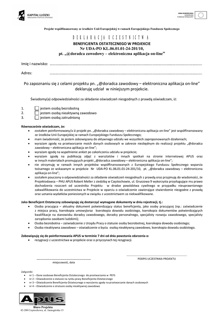 Projekt wspó finansowany ze rodków Unii Europejskiej w ramach Europejskiego Funduszu Spo ecznego DEKLARACJA UCZESTNICTWA BENEFICJENTA OSTATECZNEGO W PROJEKCIE Nr UDA-PO KL.06.01.01-24-201/10, pt. „@doradca zawodowy – elektroniczna aplikacja on-line” Imi i nazwisko: ……………………………………………………………………………………………………………………………………………. Adres: ……………………………………………………………………………………………………………………………………………. Po zapoznaniu si z celami projektu pn. „@doradca zawodowy – elektroniczna aplikacja on-line” deklaruj udzia w niniejszym projekcie. wiadomy(a) odpowiedzialno ci za sk adanie o wiadcze niezgodnych z prawd o wiadczam, i : 1. 2. 3. jestem osob bezrobotn jestem osob nieaktywn zawodowo jestem osob zatrudnion Równocze nie o wiadczam, e: zosta em poinformowany/a i projekt pn. „@doradca zawodowy – elektroniczna aplikacja on-line” jest wspó finansowany ze rodków Unii Europejskiej w ramach Europejskiego Funduszu Spo ecznego; mam wiadomo , e jestem zobowi zany do aktywnego udzia u we wszystkich zaproponowanych dzia aniach; wyra am zgod na przetwarzanie moich danych osobowych w zakresie niezb dnym do realizacji projektu „@doradca zawodowy – elektroniczna aplikacja on-line”; wyra am zgod na wype nienie ankiet po zako czeniu udzia u w projekcie; wyra am zgod na publikacj zdj z warsztatów i innych spotka na stronie internetowej APUS oraz w innych materia ach promuj cych projekt „@doradca zawodowy – elektroniczna aplikacja on-line”; nie otrzymuj w ramach innych projektów wspó finansowanych z Europejskiego Funduszu Spo ecznego wsparcia to samego ze wskazanym w projekcie Nr UDA-PO KL.06.01.01-24-201/10, pt. „@doradca zawodowy – elektroniczna aplikacja on-line”; zosta em pouczony o odpowiedzialno ci za sk adanie o wiadcze niezgodnych z prawd oraz przyjmuj do wiadomo ci, e Projektodawca – PHU APUS Robert Meller z siedzib w Cz stochowie, ul. Gruszowa 9 wykorzysta przys uguj ce mu prawo dochodzenia roszcze od uczestnika Projektu w drodze powództwa cywilnego w przypadku nieuprawnionego zakwalifikowania do uczestnictwa w Projekcie w oparciu o o wiadczenie zawieraj ce stwierdzenie niezgodne z prawd oraz uznania wydatków poniesionych w zwi zku z uczestnictwem za niekwalifikowane. Jako Beneficjent Ostateczny zobowi zuj si dostarczy wymagane dokumenty w dniu rejestracji, tj.: Osoba pracuj ca – aktualny dokument potwierdzaj cy status beneficjenta, jako osoby pracuj cej (np.: za wiadczenie z miejsca pracy, kserokopia umowy)oraz kserokopia dowodu osobistego, kserokopia dokumentów potwierdzaj cych kwalifikacje na stanowisku doradcy zawodowego, doradcy personalnego, specjalisty rozwoju zawodowego, specjalisty zarz dzania zasobami ludzkimi); Osoba bezrobotna – za wiadczenie z Urz du Pracy o statusie osoby bezrobotnej, kserokopia dowodu osobistego; Osoba nieaktywna zawodowo – o wiadczenie o byciu osob nieaktywn zawodowo, kserokopia dowodu osobistego. Zobowi zuj si do poinformowania APUS w terminie 7 dni od dnia powstania zdarzenia o: rezygnacji z uczestnictwa w projekcie oraz o przyczynach tej rezygnacji. …………………………………………………………………. miejscowo , data ………………….……………………………………………………….. PODPIS UCZESTNIKA PROJEKTU Za czniki: nr 1 – Dane osobowe Beneficjenta Ostatecznego do przetwarzania w PEFS nr 2 – O wiadczenie o statusie na rynku pracy Beneficjenta Ostatecznego nr 3 – O wiadczenie Beneficjenta Ostatecznego o wyra eniu zgody na przetwarzanie danych osobowych nr 4 – O wiadczenie o stratusie osoby nieaktywnej zawodowo Biuro Projektu 42-200 Cz stochowa, ul. Jasnogórska 15
