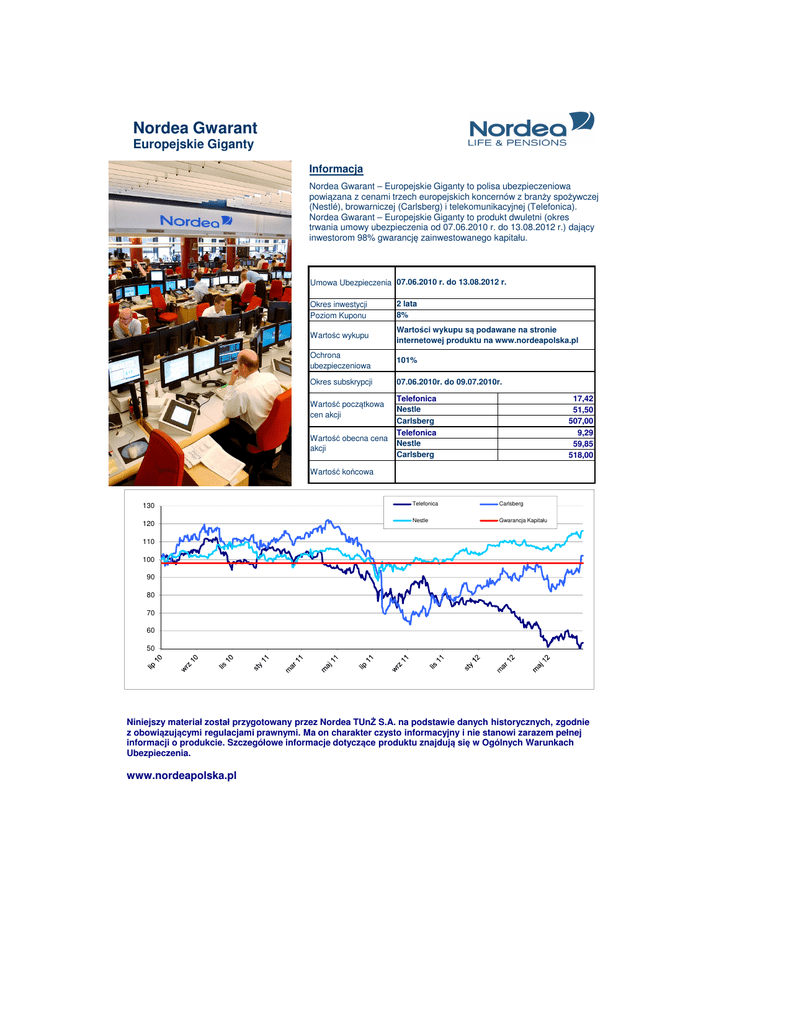 Nordea Gwarant Europejskie Giganty Informacja Nordea Gwarant – Europejskie Giganty to polisa ubezpieczeniowa powiązana z cenami trzech europejskich koncernów z branży spożywczej (Nestlé), browarniczej (Carlsberg) i telekomunikacyjnej (Telefonica). Nordea Gwarant – Europejskie Giganty to produkt dwuletni (okres trwania umowy ubezpieczenia od 07.06.2010 r. do 13.08.2012 r.) dający inwestorom 98% gwarancję zainwestowanego kapitału. Umowa Ubezpieczenia 07.06.2010 r. do 13.08.2012 r. Okres inwestycji Poziom Kuponu 2 lata 8% Wartośc wykupu Wartości wykupu są podawane na stronie internetowej produktu na www.nordeapolska.pl Ochrona ubezpieczeniowa 101% Okres subskrypcji Wartość początkowa cen akcji Wartość obecna cena akcji 07.06.2010r. do 09.07.2010r. Telefonica Nestle Carlsberg Telefonica Nestle Carlsberg 17,42 51,50 507,00 9,29 59,85 518,00 Wartość końcowa 130 120 Telefonica Carlsberg Nestle Gwarancja Kapitału 110 100 90 80 70 60 50 Niniejszy materiał został przygotowany przez Nordea TUnŻ S.A. na podstawie danych historycznych, zgodnie z obowiązującymi regulacjami prawnymi. Ma on charakter czysto informacyjny i nie stanowi zarazem pełnej informacji o produkcie. Szczegółowe informacje dotyczące produktu znajdują się w Ogólnych Warunkach Ubezpieczenia. www.nordeapolska.pl