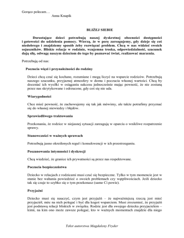 Gorąco polecam… Anna Knapik BLIŻEJ SIEBIE Dorastające dzieci potrzebują naszej dyskretnej obecności dostępności i gotowości do udzielenia pomocy. Wierzą, że w porę zareagujemy, gdy dzieje się coś niedobrego i znajdziemy sposób żeby rozwiązać problem. Chcą w nas widzieć swoich sojuszników. Bliskie relacje w rodzinie, wzajemna troska, odpowiedzialność, szacunek dają siłę, odwagę naszym dzieciom do tego by poznawać świat, realizować marzenia. Potrzebują od nas: Poczucia więzi i przynależności do rodziny Dzieci chcą czuć się kochane, rozumiane i mogą liczyć na wsparcie rodziców. Potrzebują naszego szacunku, przyjaznej atmosfery w domu i poczucia własnej wartości. Chcą by doceniać ich wysiłki w osiąganiu sukcesu jednocześnie mając pewność, że nie zostaną przez nas skrytykowane i odrzucone, gdy coś się nie uda. Wiarygodności Chce mieć pewność, że zachowujemy się tak jak mówimy, ale także potrafimy przyznać się do własnej niewiedzy i błędów. Sprawiedliwego traktowania Przekonania, że rodzice w niejasnej sytuacji zareagują w oparciu o wnikliwe rozpatrzenie sprawy. Stanowczości w ważnych sprawach Potrzebują jasno określonych reguł i konsekwencji w ich przestrzeganiu. Poszanowania intymności i dyskrecji Chcą wiedzieć, że granice ich prywatności są przez nas respektowane. Poczucia bezpieczeństwa Dziecko w relacjach z rodzicami musi czuć się bezpieczne. Tylko w tym momencie jest w stanie bez wahania powiedzieć o swoich problemach czy wątpliwościach. Jeśli dziecko tak się czuje to szybko się o tym przekonasz (samo Ci powie). Przyjaźni Dziecko musi się nauczyć, czym jest przyjaźń – że najważniejszą rzeczą jest mieć przyjaciół, móc na nich polegać i być dla kogoś wsparciem. Musi zrozumieć, że przyjaźń jest podstawą relacji bliskich w związku. Rodzic jest dla swojego dziecka przyjacielem – kimś, na kim ono może zawsze polegać, kto w ważnych momentach znajdzie dla niego Tekst autorstwa Magdaleny Fryder Gorąco polecam… Anna Knapik czas, komu także ono będzie umiało pomóc – w miarę swoich możliwości. Ważne są także relacje partnerskie pomiędzy dzieckiem a rodzicem. Kiedy dziecko dorasta, zwykle trudniej nam znaleźć wspólny język, bo zaczyna być inne – czasem dziwnie się ubiera, słucha niezrozumiałej muzyki i coraz bardziej buntuje się w wielu sprawach. Pomimo to staraj się poznawać, rozumieć i akceptować świat młodych. PO PIERWSZE – ROZMAWIAJ Rozmawiaj z dzieckiem zawsze, wszędzie i o wszystkim. Staraj się je zrozumieć, zastanów się nad tym czy problemy, przed którymi staje nie są za poważne jak na jego wiek. Z drugiej strony nie ośmieszaj jego spraw, dla Ciebie mogą one być błahe. Staraj się pokazać dziecku, że to, co do ciebie mówi jest ważne dla Ciebie. Poruszaj w rozmowach z dzieckiem tak zwane trudne tematy– co jest w życiu ważne, co dobre - stań się doradcą a nie ekspertem. PO DRUGIE – Nie bagatelizuj problemów dziecka. Rozmowa pomaga pozbyć się przykrych uczuć. Gdy czuje się skrzywdzone pozwól mu się wygadać i wyzłościć. Postaraj się je zrozumieć i mądrze doradzić. PO TRZECIE – zawsze znajdź czas na rozmowę, gdy dziecko chce się podzielić radością, sukcesem. PO CZWARTE – Staraj się dostrzegać sygnały, że dziecko cię potrzebuje. PO PIĄTE – Okazuj zainteresowanie sprawami dziecka, ale nie wytypuj natarczywie. Poczekaj, aż samo zacznie mówić, co się u niego dzieje. To ono decyduje ile chce nam o sobie powiedzieć. Uszanuj to. PO SZÓSTE –Opowiadaj o sobie. Dzieci lubią wspomnienia rodziców z czasów ich młodości. PO SIÓDME – pamiętaj o kilku WAŻNYCH SPRAWACH: - - Bądź przykładem. Postępuj tak, aby być wiarygodnym. Dzieci są dobrymi obserwatorami i łatwo zauważą, gdy nie robisz tak jak mówisz. Wymagaj, ale stawiaj dziecku warunku możliwe do spełnienia. - Bądź konsekwentny, żeby dziecko liczyło się z tobą i wiedziało, że ustalone przez Ciebie normy w ważnych sprawach muszą być respektowane. - Szanuj prawo dziecka do własnych opinii, wyborów, dysponowania swoim wolnym czasem. Bądź doradcą, ale nie narzucaj własnej woli. - Poznaj przyjaciół i znajomych dziecka. Należy pamiętać, że w tym wieku koledzy odgrywają dużą rolę i mają wpływ na twoje dziecko. Tekst autorstwa Magdaleny Fryder Gorąco polecam… Anna Knapik - Nie bądź nadmiernie opiekuńczy. Pozwól dziecku zdobywać doświadczenia – uczy się ono poprzez robienie nowych rzeczy. Zdarza się, że popełnia błędy, zatem bądź czujny by w porę zareagować. - Ucz jak przezwyciężać trudności i radzić sobie w trudnych sytuacjach. - Nie przyzwalaj na mniejsze zło. Rodzice najczęściej wychodzą z założenia, ze lepiej jak 12 – 13 letnie dziecko wypije piwo czy zapali papierosa, niż sięgnie po narkotyki. W ten sposób ułatwiają dziecku inicjacje narkotykową – do której prawie zawsze dochodzi pod wpływem alkoholu. Chciałabym zachęcić Państwa do aktywnego poszukiwania kontaktu ze swoim dzieckiem. Rozmowa ma w sobie pewną magię, potrafi rozwiać wątpliwości, utwierdzić w decyzji, rozbawić.... Rozmawiajmy, jeśli przestaniemy rozmawiać staniemy wobec niebezpieczeństwa utraty siebie nawzajem. Magdalena Fryder Tekst autorstwa Magdaleny Fryder
