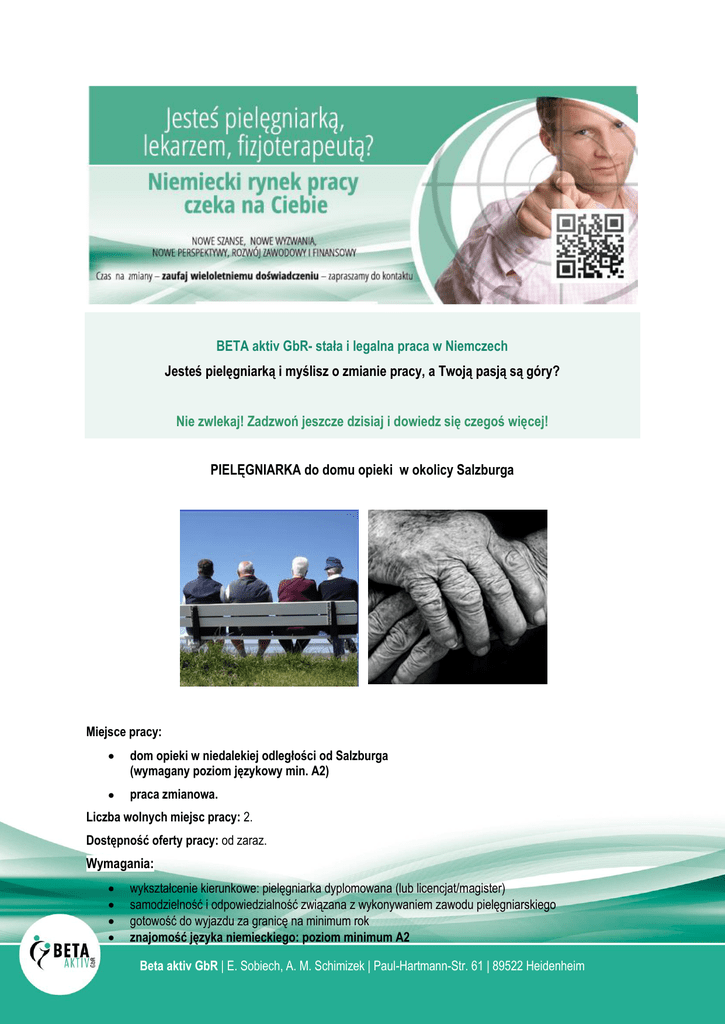 BETA aktiv GbR- stała i legalna praca w Niemczech Jesteś pielęgniarką i myślisz o zmianie pracy, a Twoją pasją są góry? Nie zwlekaj! Zadzwoń jeszcze dzisiaj i dowiedz się czegoś więcej! PIELĘGNIARKA do domu opieki w okolicy Salzburga Miejsce pracy: dom opieki w niedalekiej odległości od Salzburga (wymagany poziom językowy min. A2) praca zmianowa. Liczba wolnych miejsc pracy: 2. Dostępność oferty pracy: od zaraz. Wymagania: wykształcenie kierunkowe: pielęgniarka dyplomowana (lub licencjat/magister) samodzielność i odpowiedzialność związana z wykonywaniem zawodu pielęgniarskiego gotowość do wyjazdu za granicę na minimum rok znajomość języka niemieckiego: poziom minimum A2 Beta aktiv GbR | E. Sobiech, A. M. Schimizek | Paul-Hartmann-Str. 61 | 89522 Heidenheim Opis stanowiska: pielęgnacja i opieka nad pacjentami oraz sporządzanie dokumentacji o wykonanej pielęgnacji doradztwo i pomoc wobec pacjenta, opieka i doradztwo wobec bliskich pielęgnowanego pacjenta samodzielne i odpowiedzialne wykonywanie obowiązków według zasad nauki opieki medycznej monitorowanie, podawanie leków współpraca z lekarzami i personelem medycznym. Oferujemy: Wynagrodzenie: 1.900 € brutto + dodatki (przed nostryfikacją), 2.400 € brutto + dodatki (po nostryfikacji) zatrudnienie na 100% etatu, ok. 170 godzin w miesiącu dodatkowe wynagrodzenie za pracę w nocy, soboty, niedziele oraz dni świąteczne zakwaterowanie: mieszkanie ok.220 €/ miesiąc pełny pakiet socjalny (ubezpieczenie zdrowotne, emerytalne, od wypadków przy pracy) okres wprowadzenia w zakres obowiązków do 30 dni roboczych urlopu dobry klimat w miejscu pracy polskojęzyczną osobistą obsługę podczas podejmowania pracy w Niemczech pomoc w procesach rejestracyjnych wymaganych w Niemczech. przeprowadzamy uznanie dyplomu. Jak z sukcesem i bez ryzyka podjąć się tej pracy? Skontaktuj się z naszym przedstawicielem w Polsce pod numer 505 123 391. Po pozytywnym przejściu pierwszej rozmowy kwalifikacyjnej: wypełnij otrzymany formularz. W ciągu 5 dni roboczych zgłosimy się do Ciebie telefonicznie. Zaprosimy Cię na 2 dni próbnej pracy u Twojego przyszłego pracodawcy. Podpiszesz umowę o pracę bezpośrednio z niemieckim pracodawcą. Bądźmy partnerami. Przyłącz się do grupy pielęgniarek, które skorzystały już z naszej oferty pracy Prosimy o przesłanie wstępnej aplikacji na adres: [email protected] lub online za pomocą formularza na: www.beta-aktiv.com/bewerbung Zapraszamy do kontaktu telefonicznego na numer 0048 505 123 391 Erreichen Sie zusammen mit uns schnell und effektiv Ihre Ziele. Paul-Hartmann-Straße 61 89522 Heidenheim Tel.: +49 (7321) 315 047 Beta aktiv GbR | E. Sobiech, A. M. Schimizek | Paul-Hartmann-Str. 61 | 89522 Heidenheim