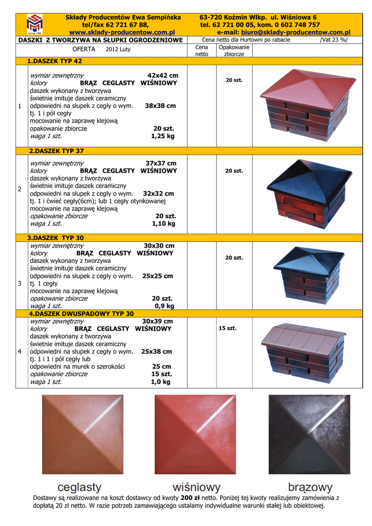 Składy Producentów Ewa Sempińska tel/fax 62 721 67 88, www.sklady-producentow.com.pl DASZKI Z TWORZYWA NA SŁUPKI OGRODZENIOWE OFERTA 2012 Luty 63-720 Koźmin Wlkp. ul. Wiśniowa 6 tel. 62 721 00 05, kom. 0 602 748 757 e-mail: [email protected] Cena netto dla Hurtowni po rabacie Cena Opakowanie netto zbiorcze /Vat 23 %/ 1.DASZEK TYP 42 wymiar zewnętrzny 42x42 cm kolory BRĄZ CEGLASTY WIŚNIOWY 1 daszek wykonany z tworzywa świetnie imituje daszek ceramiczny odpowiedni na słupek z cegły o wym. tj. 1 i pół cegły mocowanie na zaprawę klejową opakowanie zbiorcze waga 1 szt. 20 szt. 38x38 cm 20 szt. 1,25 kg 2.DASZEK TYP 37 wymiar zewnętrzny 37x37 cm kolory BRĄZ CEGLASTY WIŚNIOWY 2 20 szt. daszek wykonany z tworzywa świetnie imituje daszek ceramiczny odpowiedni na słupek z cegły o wym. 32x32 cm tj. 1 i ćwieć cegły(6cm); lub 1 cegły otynkowanej mocowanie na zaprawę klejową opakowanie zbiorcze 20 szt. waga 1 szt. 1,10 kg 3.DASZEK TYP 30 wymiar zewnętrzny 30x30 cm kolory BRĄZ CEGLASTY WIŚNIOWY 3 daszek wykonany z tworzywa świetnie imituje daszek ceramiczny odpowiedni na słupek z cegły o wym. tj. 1 cegły mocowanie na zaprawę klejową opakowanie zbiorcze waga 1 szt. 20 szt. 25x25 cm 20 szt. 0,9 kg 4.DASZEK DWUSPADOWY TYP 30 wymiar zewnętrzny 30x39 cm kolory BRĄZ CEGLASTY WIŚNIOWY 4 daszek wykonany z tworzywa świetnie imituje daszek ceramiczny odpowiedni na słupek z cegły o wym. tj. 1 i 1 i pół cegły lub odpowiedni na murek o szerokości opakowanie zbiorcze waga 1 szt. 15 szt. 25x38 cm 25 cm 15 szt. 1,0 kg Dostawy są realizowane na koszt dostawcy od kwoty 200 zł netto. PoniŜej tej kwoty realizujemy zamówienia z dopłatą 20 zł netto. W razie potrzeb zamawiającego ustalamy indywidualne warunki stałej lub obiektowej.