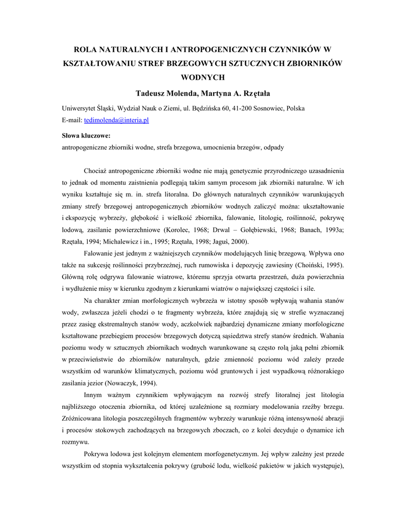 ROLA NATURALNYCH I ANTROPOGENICZNYCH CZYNNIKÓW W KSZTAŁTOWANIU STREF BRZEGOWYCH SZTUCZNYCH ZBIORNIKÓW WODNYCH Tadeusz Molenda, Martyna A. Rzętała Uniwersytet Śląski, Wydział Nauk o Ziemi, ul. Będzińska 60, 41-200 Sosnowiec, Polska E-mail: [email protected] Słowa kluczowe: antropogeniczne zbiorniki wodne, strefa brzegowa, umocnienia brzegów, odpady Chociaż antropogeniczne zbiorniki wodne nie mają genetycznie przyrodniczego uzasadnienia to jednak od momentu zaistnienia podlegają takim samym procesom jak zbiorniki naturalne. W ich wyniku kształtuje się m. in. strefa litoralna. Do głównych naturalnych czynników warunkujących zmiany strefy brzegowej antropogenicznych zbiorników wodnych zaliczyć można: ukształtowanie i ekspozycję wybrzeży, głębokość i wielkość zbiornika, falowanie, litologię, roślinność, pokrywę lodową, zasilanie powierzchniowe (Korolec, 1968; Drwal – Gołębiewski, 1968; Banach, 1993a; Rzętała, 1994; Michalewicz i in., 1995; Rzętała, 1998; Jaguś, 2000). Falowanie jest jednym z ważniejszych czynników modelujących linię brzegową. Wpływa ono także na sukcesję roślinności przybrzeżnej, ruch rumowiska i depozycję zawiesiny (Choiński, 1995). Główną rolę odgrywa falowanie wiatrowe, któremu sprzyja otwarta przestrzeń, duża powierzchnia i wydłużenie misy w kierunku zgodnym z kierunkami wiatrów o największej częstości i sile. Na charakter zmian morfologicznych wybrzeża w istotny sposób wpływają wahania stanów wody, zwłaszcza jeżeli chodzi o te fragmenty wybrzeża, które znajdują się w strefie wyznaczanej przez zasięg ekstremalnych stanów wody, aczkolwiek najbardziej dynamiczne zmiany morfologiczne kształtowane przebiegiem procesów brzegowych dotyczą sąsiedztwa strefy stanów średnich. Wahania poziomu wody w sztucznych zbiornikach wodnych warunkowane są często rolą jaką pełni zbiornik w przeciwieństwie do zbiorników naturalnych, gdzie zmienność poziomu wód zależy przede wszystkim od warunków klimatycznych, poziomu wód gruntowych i jest wypadkową różnorakiego zasilania jezior (Nowaczyk, 1994). Innym ważnym czynnikiem wpływającym na rozwój strefy litoralnej jest litologia najbliższego otoczenia zbiornika, od której uzależnione są rozmiary modelowania rzeźby brzegu. Zróżnicowana litologia poszczególnych fragmentów wybrzeży warunkuje różną intensywność abrazji i procesów stokowych zachodzących na brzegowych zboczach, co z kolei decyduje o dynamice ich rozmywu. Pokrywa lodowa jest kolejnym elementem morfogenetycznym. Jej wpływ zależny jest przede wszystkim od stopnia wykształcenia pokrywy (grubość lodu, wielkość pakietów w jakich występuje), czasu zalegania oraz od aktualnej sytuacji anemologicznej. W wyniku abrazji lodowej mogą tworzyć się okresowo istniejące lub trwałe formy brzegowe.. Na kształtowanie strefy brzegowej w istotny sposób wpływa również roślinność. Rola roślinności polega przede wszystkim na stabilizowaniu wybrzeży i zmniejszaniu strefy zasięgu procesów brzegowych. Natomiast w warunkach silnego falowania obecność roślinności urozmaica rzeźbę wybrzeża prowadząc do powstania specyficznych form brzegowych takich jak: mikrozatoki, podciosy, zerwy. Oprócz czynników naturalnych wybrzeża sztucznych zbiorników wodnych mogą pozostawać również pod wpływem wtórnych czynników antropogenicznych. Kształtowanie brzegów przez człowieka ma miejsce wszędzie tam, gdzie zagrożone są obiekty gospodarcze znajdujące się w bezpośrednim sąsiedztwie zbiornika. Najbardziej spektakularne przykłady zagrożeń infrastruktury technicznej występują nad dużymi zbiornikami zaporowymi o nasilonych procesach abrazji. W zależności od typu utworów budujących wybrzeża szerokość rozmywu może przekraczać 150 metrów. Aby zapobiegać erozji, podobnie jak na wybrzeżach morskich, budowane są różnego rodzaju konstrukcje inżynieryjne. Zaliczyć możemy do nich głównie falochrony, budowane równolegle do linii brzegowej, które czasem przybierają postać ciężkich żelbetonowych murów oporowych. Są to konstrukcje bardzo kosztowne, które niestety nie spełniają swoich funkcji ale również pogarszają warunki ekologiczne strefy brzegowej. Dlatego też w ostatnich latach coraz większy nacisk kładzie się na „bliskie naturze” kształtowanie stref brzegowych antropogenicznych zbiorników wodnych. Coraz szersze zastosowanie znajdują takie materiały jak kamień, drewno czy odpowiednio dobrane gatunki roślin. Na szczególną uwagę zasługują roślinne systemy ochrony brzegów typu Bestman. Są to odpowiednio dobrane gatunki roślin wysadzane na podłoża (maty) z włókniny jutowej lub kokosowej. Adaptacja brzegów z wykorzystaniem roślinnych systemów Bestmana nie tylko zabezpiecza je przed erozją, ale doprowadza również do powstania niezwykle cennych biotopów wykorzystywanych przez ryby, płazy i ptactwo wodne. Bardzo często linia brzegowa antropogenicznych zbiorników wodnych ulega zmianom w wyniku składowania odpadów. Najczęściej dotyczy to zbiorników powstałych w nieckach osiadania. Są one miejscem depozycji odpadów górniczych składających się ze skał płonnych takich jak piaskowce, łupki czy mułowce. W wyniku składowania odpadów dochodzi zarówno do zmiany profilu brzegowego jak i tworzywa budującego brzeg. Brzegi zbiornika stają się bardziej nachylone co w połączeniu ze skalnym podłożem praktycznie uniemożliwia rozwój przybrzeżnej roślinności. Najpoważniejsze negatywne konsekwencje dla środowiska wodnego są jednak związane z ługowaniem tych odpadów. W wyniku ługowania do wody trafiają znaczne ilości rozpuszczonych soli głównie siarczanów, chlorków oraz sodu. Powoduje to znaczną degradację jakości wód limnicznych. Literatura: BANACH, M. (1993a): Sedymentacja w zbiorniku Włocławek a wyrównywanie linii brzegowej. Czasopismo Geograficzne, LXIV, 3-4: 285-306